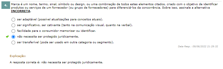 Marca é um nome, termo, sinal, símbolo ou design, ou uma combinação de todos estes elementos citados, criado com o objetivo de identificar produtos ou serviços de um fornecedor (ou grupo de fornecedores) para diferenciá-los da concorrência. Sobre isso, assinale a alternativa INCORRETA. ser transferível (pode ser usado em outra categoria ou segmento). não necessita ser protegido juridicamente. ser adaptável (possível atualizações para conceitos atuais). facilidade para o consumidor memorizar ou identificar. ser significativo, ser cativante (tanto na comunicação visual, quanto na verbal).