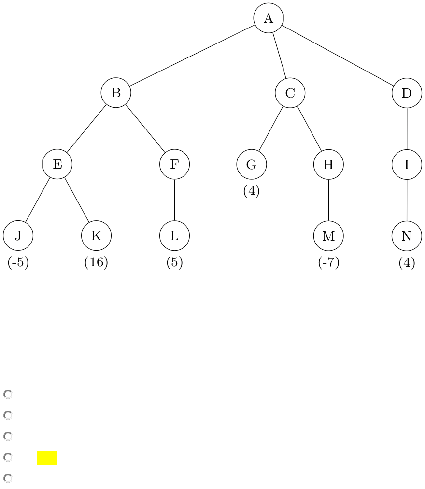 Pergunta 1 Para as questões 3 a 5, considere a seguinte árvore: Nela, o valor entre parênteses corresponde à utilidade do estado, conforme vista em aula. O nó A corresponde a MAX, os nós no nível de B a MIN, e assim por diante. Na figura acima, que nós seriam podados, se o algoritmo minimax, com poda α-β, for rodado com ordem de visita dos nós da direita para a esquerda (ou seja, na ordem inversa a comumente vista em aula)? a. F, L b. E, J, K c. D, I, N d. J, G e. G Pergunta 2 Considere a seguinte árvore: Considerando a árvore acima, quais nós não precisarão ser analisados (ou seja, serão podados) pelo algoritmo minimax, com poda α-β, e com ordem de visita dos nós da esquerda para a direita? a. G – N – O b. D – H – I c. F – L – M d. C – F – G – L – M – N – O e. E – J – K Pergunta 3 Considere a árvore abaixo, em que △ representam nós MAX, ▽ representam nós MIN e ○ representam nós de acaso. Os valores juntos às arestas que saem dos nós de acaso representam a probabilidade de ocorrência do valor que está no nó abaixo do nó de acaso. Os valores entre parênteses correspondem à utilidade do nó que acompanham. Com base nessa figura, qual o valor esperado da utilidade no nó raiz? a. 2,0 b. 2,6 c. 1,5 d. 1,0 e. 3,1 Pergunta 4 A figura abaixo ilustra uma árvore que representa um jogo no qual os nós ▲ representam o jogador MAX e os nós ▼ representam o jogador MIN. Uma das utilidades é desconhecida e denotada pela variável x na figura. Como resultado da aplicação da estratégia de poda alpha-beta (com a ordem da esquerda para a direita na árvore) foi observado que um dos nós não precisou ser expandido, conforme indicado na figura. Assim, podemos afirmar que: a. x = 7 b. x < 5 c. x > 10 d. x = 15 e. x = 6 Pergunta 5 Com relação à técnica de poda alpha-beta, é possível afirmar que: a. a poda alpha-beta não se aplica a buscas em árvores, uma vez que não pode ser utilizada em jogos adversariais. b. a poda alpha-beta permite resolver, mesmo em sistemas computacionais simples, qualquer tipo de jogo, incluindo aqueles que requerem a avaliação de muitos passos até os estados terminais. c. a poda alpha-beta é capaz de calcular a decisão minimax correta, porém avaliando um número menor de nós na árvore referente ao jogo. d. a poda alpha-beta é uma aproximação da estratégia minimax, de modo que o resultado final fornecido pela poda alpha-beta não é o mesmo que o valor fornecido pela estratégia minimax. e. a poda alpha-beta, assim como na busca minimax exata, deve necessariamente examinar todos os nós da árvore. Pergunta 6 Métodos de poda, como a poda alpha-beta, são importantes em jogos adversariais pois permitem: a. reduzir o número de estados a serem avaliados. b. avaliar todos os estados que não influenciam no resultado do jogo. c. obter exatamente as utilidades dos estados terminais a partir da aplicação de funções heurísticas em estados não terminais. d. fazer cálculos extremamente rápidos, o que o torna apto a resolver qualquer tipo de problema em poucos segundos. e. melhorar a decisão tomada na estratégia minimax. Pergunta 7 Considere verdadeiras (V) ou falsas (F) as afirmações abaixo: ( ) Um jogo adversarial com a presença de dois agentes é caracterizado por objetivos conflitantes, de modo que é impossível que os dois agentes saiam vencedores. ( ) Um jogo adversarial com a presença de dois agentes é caracterizado por objetivos cooperativos, de modo que é possível que os dois agentes sejam vencedores. ( ) Em jogos de soma zero, pode haver um estado de equilíbrio no qual todos os agentes são vencedores. ( ) O uso de estratégias de busca em árvore no contexto de jogos adversariais sempre permite, para qualquer tipo de jogo, explorar todos os nós das árvores em pouquíssimo tempo, mesmo em sistemas computacionais simples. A sequência correta de preenchimento dos parênteses, de cima para baixo, é a. V – F – F – F b. V – V – F – F c. V – F – V – V d. F – V – F – F e. F – V – V – V Pergunta 8 Uma característica de uma busca em cenários de decisão imperfeita é que: a. tal estratégia aplica-se unicamente para jogos estocásticos. b. tal estratégia aplica-se quando não é possível formular o jogo por meio de uma árvore de busca. c. todos os nós terminais são avaliados nessa estratégia, de modo que se torna possível obter a decisão minimax correta. d. ao invés de avaliar a utilidade dos nós terminais, é utilizada uma função heurística para avaliar nós não terminais. e. ao invés de avaliar as utilidades dos nós terminais, a busca vai necessariamente até os nós terminais, porém considerando funções heurísticas para avaliação de tais nós. Pergunta 9 Com relação à escolha de funções heurísticas em cenários de decisões imperfeitas, considere verdadeiras (V) ou falsas (F) as afirmações abaixo: ( ) É importante que o cálculo da função heurística não seja custoso do ponto de vista computacional. ( ) A função heurística deve estar associada, de alguma maneira, às chances de o jogador vencer. ( ) Um exemplo de função heurística nesse contexto é a combinação linear de diferentes atributos associados ao estado atual. ( ) A aplicação de funções heurísticas nesse contexto é rara, pois mesmo em jogos complexos, com muitas ações necessárias para alcançar os estados terminais, a busca minimax exata pode ser utilizada. A sequência correta de preenchimento dos parênteses, de cima para baixo, é a. F – V – V – F b. V – V – V – F c. V – V – F – V d. V – V – V – V e. V – F – V – V Pergunta 10 A figura abaixo ilustra uma árvore de jogo completa na qual os nós ▲ representam o jogador MAX e os nós ▼ representam o jogador MIN. Umas das utilidades é desconhecida e é representada pela variável x. Considerando uma estratégia minimax, é possível afirmar que: a. 