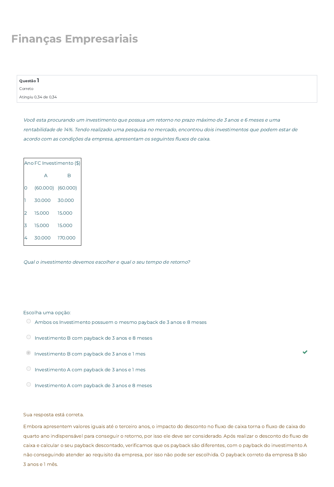 Finanças Empresariais Questão 1 Correto Atingiu 0,34 de 0,34 Você esta procurando um investimento que possua um retorno no prazo máximo de 3 anos e 6 meses e uma rentabilidade de 14%. Tendo realizado uma pesquisa no mercado, encontrou dois investimentos que podem estar de acordo com as condições da empresa, apresentam os seguintes �uxos de caixa. Ano FC Investimento ($) A B 0 (60.000) (60.000) 1 30.000 30.000 2 15.000 15.000 3 15.000 15.000 4 30.000 170.000 Qual o investimento devemos escolher e qual o seu tempo de retorno? Escolha uma opção: Ambos os Investimento possuem o mesmo payback de 3 anos e 8 meses Investimento B com payback de 3 anos e 8 meses Investimento B com payback de 3 anos e 1 mes Investimento A com payback de 3 anos e 1 mes Investimento A com payback de 3 anos e 8 meses Sua resposta está correta. Embora apresentem valores iguais até o terceiro anos, o impacto do desconto no �uxo de caixa torna o �uxo de caixa do quarto ano indispensável para conseguir o retorno, por isso ele deve ser considerado. Após realizar o desconto do �uxo de caixa e calcular o seu payback descontado, veri�camos que os payback são diferentes, com o payback do investimento A não conseguindo atender ao requisito da empresa, por isso não pode ser escolhida. O payback correto da empresa B são 3 anos e 1 mês. Questão 2 Correto Atingiu 0,34 de 0,34 Você esta procurando um investimento que possua um retorno no prazo máximo de 3 anos. Tendo realizado uma pesquisa no mercado, encontrou dois investimentos que podem estar de acordo com as condições da empresa, apresentam os seguintes �uxos de caixa. Ano FC Investimento ($) A B 0 (60.000) (60.000) 1 30.000 30.000 2 15.000 15.000 3 15.000 15.000 4 30.000 170.000 Qual o investimento devemos escolher e qual o seu tempo de retorno (considere apenas os anos e meses) ? Escolha uma opção: Investimento A com payback de 3 anos Investimento B com payback de 3 anos Investimento B com payback de 2 anos e 6 meses Ambos os Investimento possuem o mesmo payback de 3 anos Investimento A com payback de 2 anos e 6 meses Sua resposta está correta. Embora os investimentos possuam valores muitos distintos no �uxo de caixa do quarto ano, para o payback, só é considerado os valores até obter o retorno do capital investido, conforme o tópico payback efetivo da unidade. Dessa forma, ambos os investimentos apresentam um payback de 3 anos, que está de acordo com as solicitações da empresa. Questão 3 Correto Atingiu 0,34 de 0,34 Avalie as a�rmações a seguir: I. O �uxo de caixa considera os valores de entrada e saída de caixa, assim como os rendimentos que serão obtidos pela empresa; II. O orçamento de caixa é utilizado para veri�car a possibilidade de falta ou excesso de recurso no caixa da empresa; III. O VPL é uma técnica que determina em quanto tempo o investidor obtém o retorno do investimento, os seja, em quanto tempo ele irá recuperar o valor investido; IV. Para estruturar o �uxo de caixa da empresa, precisamos encontrar o lucro líquido não alavancado do período. É correto apenas o que se a�rma em: Escolha uma opção: II e IV I, II e IV I, II e III I e III III e IV Sua resposta está correta. As a�rmativas I e III estão incorretas, a I pois o �uxo de caixa considera somente as entradas e saídas de caixa, ignorando os rendimentos projetados, a III pois o VPL é uma técnica que determina o retorno monetário do investimento, a de�nição apresentada é do playback. A II e IV estão corretas, pois o orcamento de caixa é utilizado justamente para controlar o capital no caixa da empresa e o �uxo de caixa utiliza o lucro líquido não alavancado. Questão 4 Incorreto Atingiu 0,00 de 0,34 Avalie as seguintes asserções e a relação proposta entre elas. Devemos ignorar completamente o valor da depreciação quando estamos encontrando o �uxo de caixa do período; PORQUE A depreciação é uma despesa que reduz o valor dos bens da empresa e não afeta o seu caixa. A respeito dessas asserções, assinale a opção correta. Escolha uma opção: A asserção I é uma proposição verdadeira, e a II é uma proposição falsa. As asserções I e II são proposições falsas. A asserção I é uma proposição falsa, e a II é uma proposição verdadeira. As asserções I e II são proposições verdadeiras, e a II é uma justi�cativa da I. As asserções I e II são proposições verdadeiras, mas a II não é uma justi�cativa da I Sua resposta está incorreta. Embora a depreciação afeta somente os valor do bem e não o caixa da empresa, ela deve ser considerada ao estruturar o �uxo de caixa por causa do benefício �scal que esse valor representa, depois retornamos com o valor da depreciação pois ele não afeta de fato a caixa da empresa. Pode ser visto no tópico estruturação de �uxo de caixa da unidade. Questão 5 Incorreto Atingiu 0,00 de 0,34 Você é o administrador �nanceiro de uma empresa, e o gestor de�nil que deve investir em um de dois investimentos disponiveis para a empresa. Ele informou ainda que a empresa exige uma rentabilidade anual de 12% . Ano Investimento Alfa Beta 0 (150.000) (250.000) 1 60.000 110.000 2 60.000 110.000 3 60.000 110.000 4 60.000 110.000 De acordo com o VPL, qual a melhor alternativa para investir e qual o seu VPL? Escolha uma opção: Investimento Beta com VPL de $ 29.240,48 Ambos os Investimento possuem o mesmo VPL de $ 32.240,96. Investimento Beta com VPL de $ 84.108,43 Investimento Alfa com VPL de $ 32.240,96 Investimento Alfa com VPL de $ 23.729,56 Sua resposta está incorreta.
