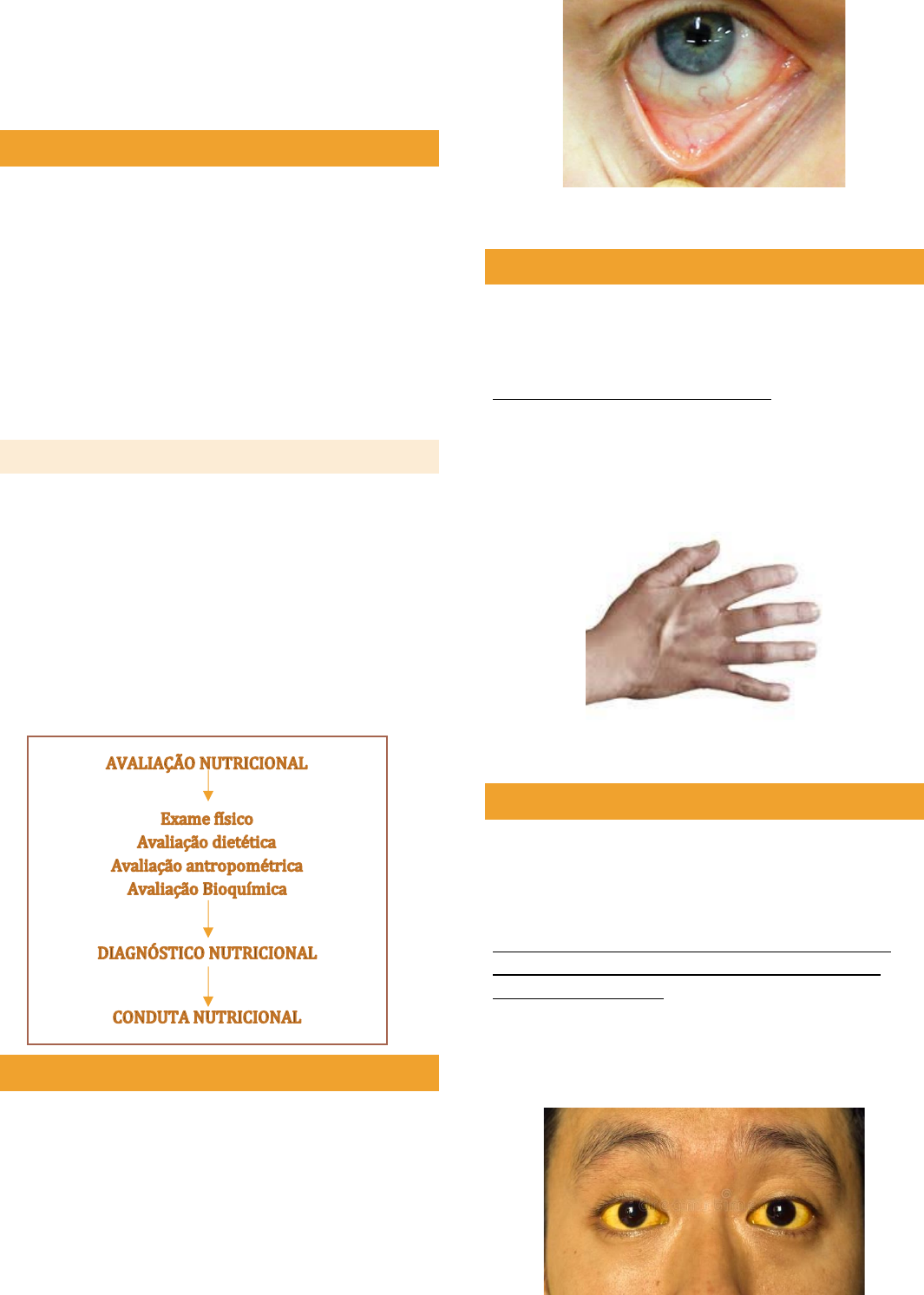 SEMIOLOGIA NUTRICIONAL INTRODUÇÃO - Semiologia: parte da medicina relacionada ao estudo dos sinais e sintomas das doenças - Semiologia nutricional: estudo dos sinais e sintomas dos distúrbios nutricionais. • Sintoma: é toda informação subjetiva descrita pelo paciente • Sinal: toda alteração objetiva, que afeta algum dos sentidos do examinador (uma mancha na pele por exemplo). EXAME FISICO - Engloba inspeção, palpação e ausculta. • Inspeção: visão • Palpação: tato • Ausculta: audição (geralmente se usa para ouvir o TGI) - Momento de identificação dos sinais que podem levar a sintomas não informados pelo paciente - É uma etapa obrigatória da avaliação nutricional. ANEMIA - Pode ter várias causas: doenças hematológicas (leucemias, linfomas); deficiências nutricionais (ferro, vit. B12, acido fólico) e causas secundárias (hemorragia, cirrose hepática). - Como investigar: realizando exame físico da coloração da pele, das palmas das mãos e das mucosas (principalmente conjuntival e labial). Conjuntiva pálida DESIDRATAÇÃO - Pode ser causada por: ingestão insuficiente de água, perda excessiva (vômitos, diarreias, sudorese excessiva) ou ambas. - Acomete os idosos e os dependentes - Como investigar: através da salivação, verificando o brilho nos olhos. Umidade das mucosas (gengival e conjuntival) e examinando o turgor do braço (pinçando o polegar e o indicador da pele). Turgor diminuído ICTERÍCIA - Causada pela presença de pigmentos biliares na pele e nas mucosas. - Há dois grupos de icterícias: hemolíticas e colestáticas As colestáticas são importantes no estudo nutricional, pois implica em alterações na absorção de vitaminas lipossolúveis (A,D,E,K). - Como investigar: realizando exame físico sob a luz natural da coloração da pele e das mucosas (principalmente esclerótica e sublingual). EDEMA É o excesso de líquido acumulado no espaço intersticial ou no interior das próprias células. Interessa-nos o edema cutâneo, sendo este uma infiltração de líquido no espaço intersticial dos tecidos que constituem a pele e a tela celular subcutânea Como investigar: usa-se a o polegar, fazendo uma compressão firme e sustentada de encontro a uma estrutura rígida subjacente à área do exame. Caso haja edema, ao retirar-se o dedo, haverá uma depressão no local comprimido. Sinal de godet (cacifo) Edema Excesso de peso hídrico Tornozelo 1 kg Joelho 3 a 4 kg Base da coxa 5 a 6 kg Anasarca 10 a 12 kg MARTINS, 2000. ATROFIA TEMPORAL E BOLA GORDUROSA DE BICHART - Causada pela desnutrição energética proteica; - Diminuição na mastigação de 3 a 4 semanas; - Perda excessiva do tecido adiposo e muscular. CAVIDADE ORAL Língua: Glossite (Complexo B), branca (falta mastigação), queilite angular (riboflavina e vitamina C), deficiência de zinco. Queilite angular Deficiência de zinco Lingua branca EXAME FISICO DA MASSA MUSCULAR 1. Infraclavicular 2. Supraclavicular 3. Fúrcula esternal MEMBROS SUPERIORES, ATROFIA DA MASSA MUSCULAR BICIPITAL E TRICIPITAL MUSCULO ADUTOR DO POLEGAR ABDOMEN - Distendido, plano (normal) ou escavado Escavado: Paciente privado de alimento há muito tempo. Perda de reserva energética e baixa imunidade DEFICIENCIA DE MICRONUTRIENTES Local Manifestações clinicas Carência Cabelo Perda de brilho, seco, quebradiço, despigmentação, fácil de arrancar PTN e zinco Face Seborreia nasolabial, endemia de face B2 e ferro, PTN Olhos Palidez conjuntival, xerose, blefarite angular Ferro, vit. A, B2, e B6 Lábios Estomatite angular, quelite B2 Gengivas Esponjosas, sangramento Vit. C Língua Glossite, língua magenta, atrofia e hipertrofia das papilas B3,B2,B9,B12 Pele Xerose, hiperceratose folicular, petéquias, equimoses excessivas Vit. A, C, K Unhas Coiloniquia, quebradiças Ferro COLESTEROL ELEVADO (XANTOMA): DEFICIÊNCIA DE VITAMINA C: DEFICIÊNCIA DE VITAMINA A: DEFICIENCIA DE NIACINA: DEFICIENCIA DE FERRO: