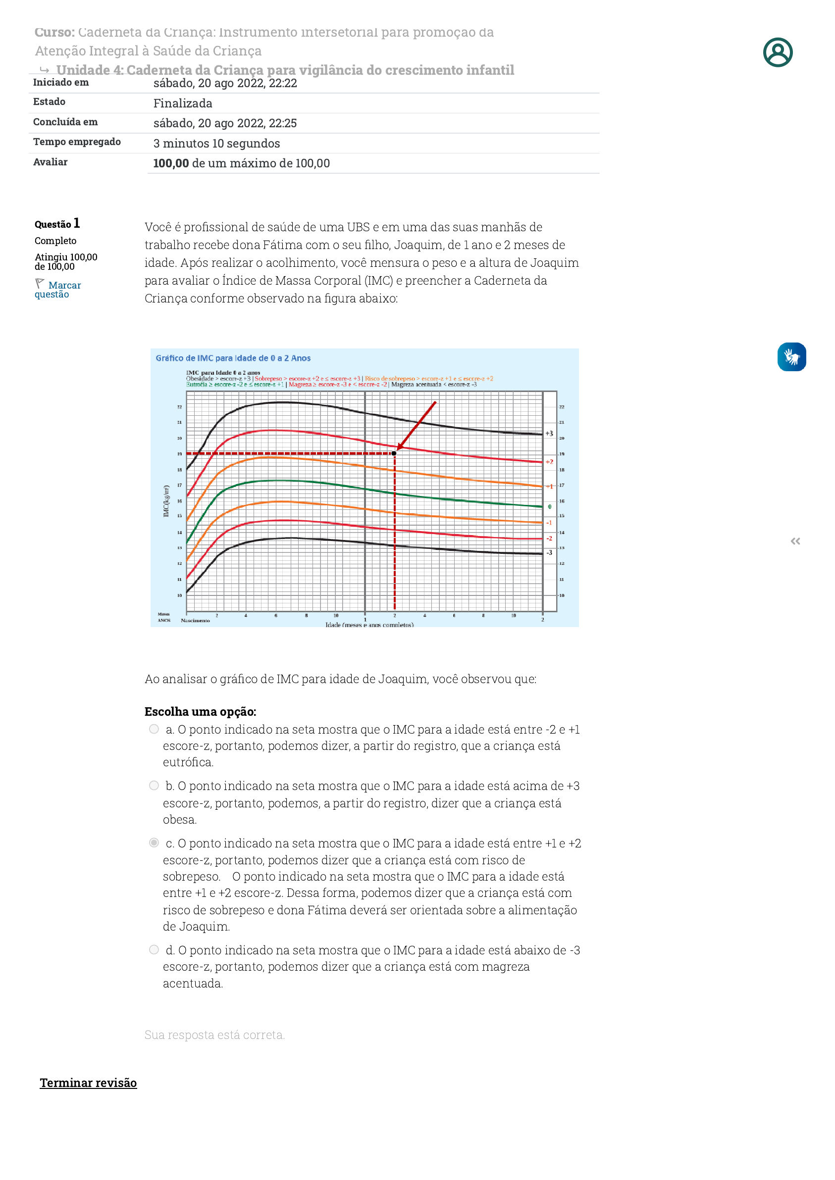 20/08/2022 22:25 Questionário avaliativo 4 - SAITE AVA https://saiteava.org/mod/quiz/review.php?attempt=1055699&cmid=1124 1/2 Questão 1 Completo Atingiu 100,00 de 100,00 Marcar questão Iniciado em sábado, 20 ago 2022, 22:22 Estado Finalizada Concluída em sábado, 20 ago 2022, 22:25 Tempo empregado 3 minutos 10 segundos Avaliar 100,00 de um máximo de 100,00 Terminar revisão Você é pro�ssional de saúde de uma UBS e em uma das suas manhãs de trabalho recebe dona Fátima com o seu �lho, Joaquim, de 1 ano e 2 meses de idade. Após realizar o acolhimento, você mensura o peso e a altura de Joaquim para avaliar o Índice de Massa Corporal (IMC) e preencher a Caderneta da Criança conforme observado na �gura abaixo: Ao analisar o grá�co de IMC para idade de Joaquim, você observou que: Escolha uma opção: a. O ponto indicado na seta mostra que o IMC para a idade está entre -2 e +1 escore-z, portanto, podemos dizer, a partir do registro, que a criança está eutró�ca. b. O ponto indicado na seta mostra que o IMC para a idade está acima de +3 escore-z, portanto, podemos, a partir do registro, dizer que a criança está obesa. c. O ponto indicado na seta mostra que o IMC para a idade está entre +1 e +2 escore-z, portanto, podemos dizer que a criança está com risco de sobrepeso. O ponto indicado na seta mostra que o IMC para a idade está entre +1 e +2 escore-z. Dessa forma, podemos dizer que a criança está com risco de sobrepeso e dona Fátima deverá ser orientada sobre a alimentação de Joaquim. d. O ponto indicado na seta mostra que o IMC para a idade está abaixo de -3 escore-z, portanto, podemos dizer que a criança está com magreza acentuada. Sua resposta está correta.  Curso: Caderneta da Criança: Instrumento intersetorial para promoção da Atenção Integral à Saúde da Criança  Unidade 4: Caderneta da Criança para vigilância do crescimento infantil  https://saiteava.org/mod/quiz/view.php?id=1124 20/08/2022 22:25 Questionário avaliativo 4 - SAITE AVA https://saiteava.org/mod/quiz/review.php?attempt=1055699&cmid=1124 2/2  Questionário avaliativo 4   Certi�cação  Boas-vindas  Expectativa de Curso  Pré-teste  Unidade 1  Unidade 2  Unidade 3  Unidade 4  Unidade 5  Pós-teste    https://saiteava.org/mod/certification/view.php?id=1132&modules=1 https://saiteava.org/mod/page/view.php?id=1108&modules=1 https://saiteava.org/mod/feedback/view.php?id=1109&modules=1 https://saiteava.org/mod/quiz/view.php?id=1110&modules=1 https://saiteava.org/mod/page/view.php?id=1111&modules=1 https://saiteava.org/mod/lti/view.php?id=1116&modules=1 https://saiteava.org/mod/resource/view.php?id=1119&modules=1 https://saiteava.org/mod/page/view.php?id=1122&modules=1 https://saiteava.org/mod/page/view.php?id=1122#classificationresourceModal https://moodle2.ufma.unasus.gov.br/osticket/
