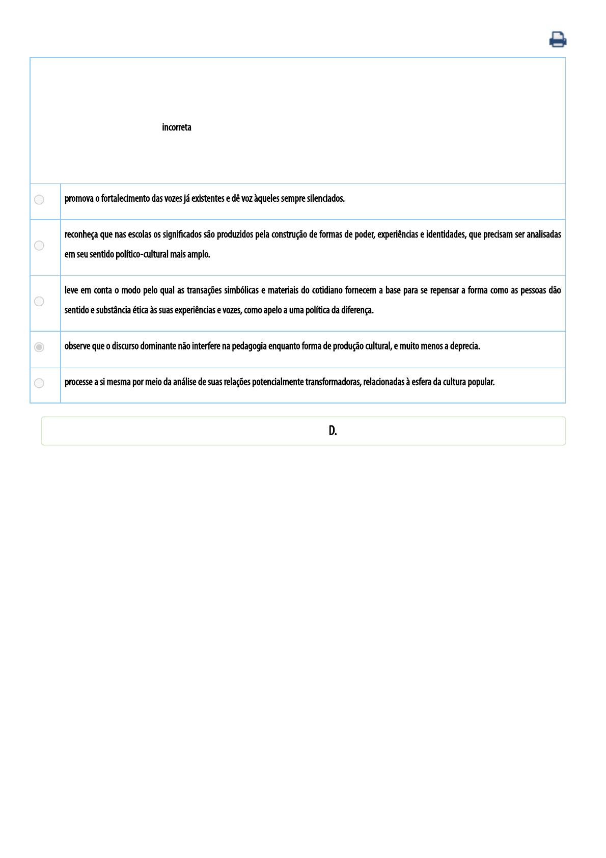 21/08/2022 11:14 Universidade Paulista - UNIP : Disciplina On-line. https://www.unip.br/aluno/central/sistemas/acesso/138 1/1 Podemos a�rmar que a escola é um território de luta e a pedagogia é uma forma de política cultural. É por isso que Giroux e Simon (2005) argumentam em favor de uma pedagogia crítica. A esse respeito, assinale a a�rmativa incorreta: Giroux e Simon (2005) propõem uma pedagogia que A promova o fortalecimento das vozes já existentes e dê voz àqueles sempre silenciados. B reconheça que nas escolas os signi�cados são produzidos pela construção de formas de poder, experiências e identidades, que precisam ser analisadas em seu sentido político-cultural mais amplo. C leve em conta o modo pelo qual as transações simbólicas e materiais do cotidiano fornecem a base para se repensar a forma como as pessoas dão sentido e substância ética às suas experiências e vozes, como apelo a uma política da diferença. D observe que o discurso dominante não interfere na pedagogia enquanto forma de produção cultural, e muito menos a deprecia. E processe a si mesma por meio da análise de suas relações potencialmente transformadoras, relacionadas à esfera da cultura popular. Você já respondeu e acertou esse exercício. A resposta correta é: D. 21/08/2022 11:14 Universidade Paulista - UNIP : Disciplina On-line. https://www.unip.br/aluno/central/sistemas/acesso/138 1/1 Leia atentamente o texto a seguir: A noção de pedagogia crítica começa com certo grau de __________, uma visão de __________ e uma __________ que nos impelem a repensar o ensino e a renová-lo no âmbito de uma teoria mais ampla de escolarização, como forma de __________. Assinale a alternativa que reúne elementos para preencher corretamente as lacunas do texto acima: A indignação / possibilidade / incerteza / política cultural B respeito / impossibilidade / certeza / política cultural C indignação / possibilidade / certeza / política da indiferença D desprezo / probabilidade / dúvida / política curricular E indignação / impossibilidade / incerteza / política cultural Você já respondeu e acertou esse exercício. A resposta correta é: A. 21/08/2022 11:15 Universidade Paulista - UNIP : Disciplina On-line. https://www.unip.br/aluno/central/sistemas/acesso/138 1/1 Leia atentamente o texto a seguir: O papel da teoria curricular na perspectiva crítica é estabelecer relações entre o currículo e os interesses sociais mais amplos. A seleção, organização e distribuição do conhecimento não são ações neutras e desinteressadas, mas atendem aos grupos que detêm o poder econômico que, por sua vez, viabilizam formas de opressão e dominação dos grupos economicamente desfavorecidos por meio da imposição cultural. Tendo em vista os pressupostos da teoria crítica, Henry Giroux propõe um modelo de currículo A técnico e utilitário, que defenda a necessidade de organizar o currículo do mesmo modo que as empresas e as indústrias organizam suas atividades. B baseado única e exclusivamente na apropriação de conteúdos, sendo o professor o autor principal do processo de ensino-aprendizagem. C capaz de proporcionar uma formação integral humanista aos alunos, de modo a prepará-los para responder às exigências do mercado de trabalho. D contrário à racionalidade técnica, utilitária e positivista, voltada aos interesses da classe dominante, defendendo-o enquanto espaço de resistência e oposição a esses interesses. E baseado nos interesses das classes dominantes, consideradas mais aptas a escolher o que é melhor para a nação. Você excedeu o limite de 3 tentativas para responder este exercício. 21/08/2022 11:15 Universidade Paulista - UNIP : Disciplina On-line. https://www.unip.br/aluno/central/sistemas/acesso/138 1/1 A organização curricular re�ete as práticas socioculturais. Para colocá-la a serviço de uma educação crítica e formadora da cidadania é preciso haver A interação entre as diversas culturas que têm linguagens e identidades próprias, com vista à transformação das relações culturais e sociais. B inserção das diferentes culturas em uma cultura comum, na qual as visões de mundo, dos costumes e dos saberes escolares estejam representadas. C exclusão de algumas culturas para que as visões de mundo, dos costumes e dos saberes escolares possam se tornar conhecidas de todos. D destaque às diferenças culturais produzidas historicamente, priorizando valores e costumes de grupos pouco privilegiados em detrimento da cultura hegemônica. E consideração relativa à possibilidade de con�itos entre grupos culturalmente diversos, buscando a negociação e objetivando o consenso. Você já respondeu e acertou esse exercício. A resposta correta é: A. 21/08/2022 11:15 Universidade Paulista - UNIP : Disciplina On-line. https://www.unip.br/aluno/central/sistemas/acesso/138 1/1 Michael Apple argumenta que os conhecimentos que compõem o currículo A são eleitos no âmbito da prática social e, por isso, devem ser considerados neutros. B devem ser construídos pelos próprios alunos, num processo de relação ativa com o processo educativo. C precisam ser questionados e não divididos em legítimos e ilegítimos, ao contrário do que preconizavam os modelos tradicionais, que os consideravam inquestionáveis. D são todos verdadeiros, cabendo somente selecioná-los de acordo com a faixa etária que os vai receber. E devem passar por testes cientí�cos para que se determine se podem ser inseridos no currículo ou não. Você já respondeu e acertou esse exercício. A resposta correta é: C. 21/08/2022 11:15 Universidade Paulista - UNIP : Disciplina On-line. https://www.unip.br/aluno/central/sistemas/acesso/138 1/1 Em uma das mais importantes obras relativas ao currículo escolar, Michael Apple discute a relação entre currículo e hegemonia, reprodução social e econômica. A respeito do conceito de currículo tal como o autor