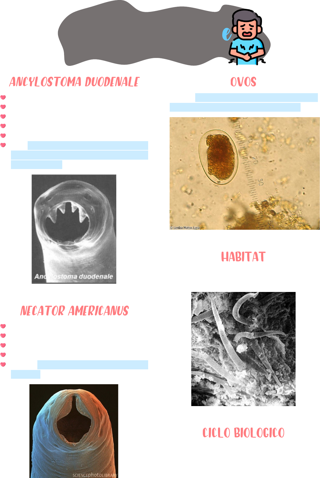 Ancilostomose Absorção pela cápsula bucal; Regiões temperadas; Países do Hemisfério Norte; Macho: 8-11mm Fêmea: 10-18mm Tem dois pares de dentes em sua cápsula bucal, por onde se prende no órgão e leva a perda de sangue. Regiões tropicais; África tropical, Américas, ilhas do pacífico; Macho: 5-9mm Fêmea: 9-11mm Em sua cápsula bucal há um par de placas cortantes Ambos apresentam ovos parecidos, desde os blastômeros e a região clara entre a casca. Intestino delgado – duodeno e porções iniciais do jejuno, deixando lesões sangrantes e constantes. É considerado como geo-helminto, pois passam por uma evolução do seu ciclo fora do hospedeiro, no meio ambiente. As larvas passam por 5 estágios antes de se tornarem adultas L1 e L2 – larva rabditoide, presente no meio ambiente e evoluindo de L1 para L2 (muda ou ecdise) se alimentando por meio de detritos no meio ambiente. L3 – larva filarioide infectante que não continua sua evolução no meio ambiente e nem se alimenta mais do mesmo. Essa larva deve penetrar no hospedeiro para que ocorra sua evolução, se não a mesma morre; L4 – Se torna L4 dentro dos capilares pulmonares do hospedeiro. Ela adentra nos alvéolos pulmonares e sobe pela árvore respiratória até chegar à laringe. Durante um reflexo de tosse, a larva é deglutida e chega ao intestino; L5 – Se torna adulta no intestino, completando sua ultima fase. Penetração das larvas: erupções papulovesiculosas, pruriginosas, erimatosas. Verme adulto: laceração da mucosa e da submucosa, espoliação sanguínea, secreção de enzimas proteolíticas e agentes anticoagulantes – intensa perda intestinal de sangue – anemia por deficiência de ferro e hipoalbuminemia (não é uma hemorragia, mas sim uma perda constante de sangue que causa a perda de ferro). Migração das larvas – tosse, febre, laringite, faringite. Sensação de obstrução da garganta, dor ao falar e deglutir. Síndrome de Loeffler – febre, manifestações alérgicas, bronquite e pneumonia. Verme adulto – diminuição do apetite, indigestão, cólicas, náuseas, vômitos, flatulência, diarreia, ulceração intestinal, anemia microcítica (VCM baixo) e hipocrômica (HCM baixo), eosinofilia (aumento de eosinófilos), dispnéia (menor disponibilidade de oxigênio aos tecidos), palpitações, cefaleia e fadiga. Alotriofagia – desejo de ingerir coisas estranhas como solo, argila, tijolos e areia. Pesquisa de ovos ou larvas nas fezes. Larvas rabditoides (L1, L2) Vestíbulo bucal curto – Strongyloides stercoralis (primeira imagem) Vestíbulo bucal longo – Ancilostomideo (segunda imagem) Larvas filarioides Cauda bifurcada – Strongyloides stercoralis Cauda retilínea – Ancilostomideo Ocorre preferencialmente em crianças e idosos; Independente do sexo; Sobrevivência do parasita – A. duodenale – 6 a 8 anos. N. americanus – 4 a 5 anos. Ovos – 22.000 (A. duodenale) e 9.000 (N. americanus). Uso mais frequentes de calçados; Melhoria da dieta geral; Disponibilidade de medicamentos anti- helmínticos atóxicos e de grande eficiência. Diagnóstico e tratamento; Saneamento básico; Educação sanitária; Suplementação alimentar de ferro e proteínas; Uso de calçados