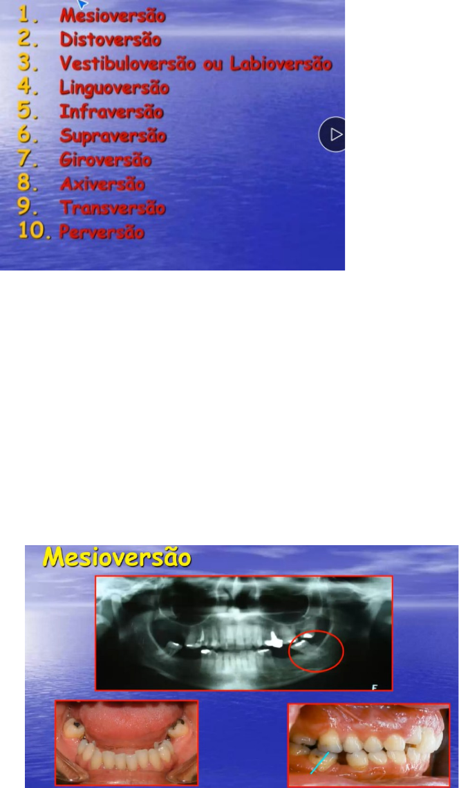 25/02/22 CLASSIFICAÇÃO DE LISHER Em 1911, colocou um nome que define a alteração do dente em relação a sua posição normal. 1- Mesioversão 2- Distoversão 3- Vestibuloversão ou labioversão 4- Linguoversão 5- Infraversão 6- Supraversão 7- Giroversão 8- Axiversão 9- Transversão 10- Perversão · Inclinação excessiva pra mesial · Fator etiológico: ausência do elemento adjacente · Mal posicionamento dos dentes pra distal · Fator etiológico: falta de um dente · Mal posicionamento dos dentes pra vestibular · Fator etiológico: falta de espaço · Mal posicionado pra lingual · Fator etiológico: falta de espaço · Dente ou os dentes longe do seu plano oclusal · Fator etiológico: poderia saber trauma, anquilose, falta de espaço 2º foto : mordida aberta pode ter sido causa por chupar dedo ou chupeta · Dente além do plano oclusal · Fator etiológico: ausência do antagonista · Dente está rotacionado no seu longo eixo · Fatores etiológicos: falta de espaço, trauma no germe do permanente. · Inclinação obliqua dos elementos dentários pra lingual ( os molares estão mais linguarizados) · Fator etiológico: falta de crescimento transversal na maxila ( pode ser da mandíbula tb) Da foto seria um fator hereditário · Dente posicionado no local do outro · Fator etiológico: pode ser trauma no germe do permanente, falta de espaço etc · O elemento existe mas ele n está na boca ( n esta erupcionado) · Fator etiológico: incluso e impactado · Tem o espaço do canino mas ele n está em oclusão · Fator etiológico: falta de espaço CLASSIFICAÇÃO DE SIMON Utilizou 3 planos anatômicos: · Plano orbital · Plano sagital mediano · Plano de frankfurt Quando a maxila estiver muito a frente do plano orbitário ( ou protrusão) Retração ou retrusão Quando a maxila ou a mandíbula esta muito atras do plano orbitário quando a parte principalmente post esta encurtada (contraída) Maxila muito expandida ( sem toque ate no post) Outros nomes: mordida cruzada inversa, síndrome de BRODIE A base óssea, no caso a maxila esta mais próxima do plano de frankfurt do que o normal. Sobremordida exagerada. Maxila esta mais distante do que o norme do plano de Frankfurt.