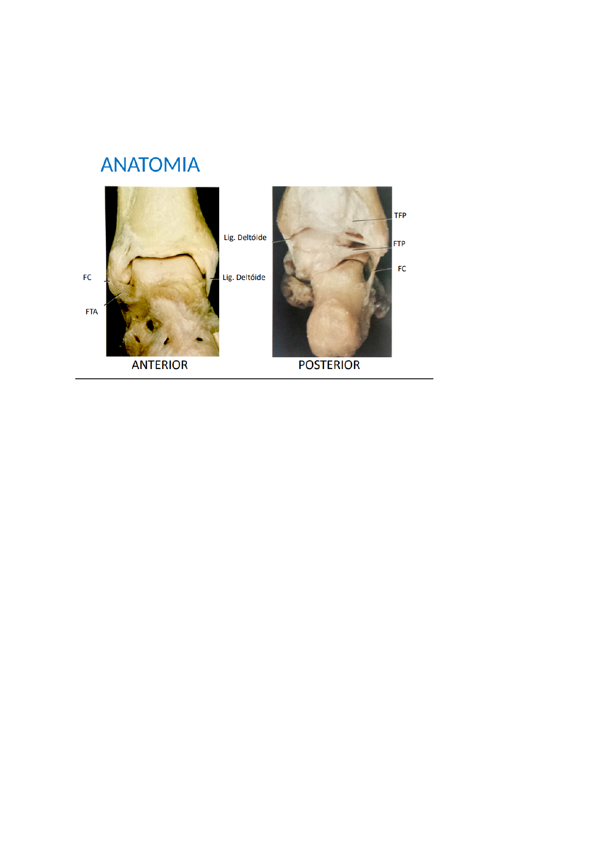 Fratura do Tornozelo Tornozelo faz uma pinça de osso que segura o Talus. O arcabouço óssseo faz com que essa articulação seja profunda. No tornozelo a principal estabilidade é óssea (diferente do joelho que é ligamentar). Ligamento deltoide tem uma maior contribuição (mais importancia) pois o osso é mais raso ali. Prioritariamente a estabilidade do tornozelo é ÒSSEA. Tem 3 ossos e vários ligamentos que seguram essa anatomia. Ligamento fibulotalar anterior, fibulo calcâneo, fibulotalar posterior -> (complexo ligamentar lateral). Ligamentos que unem Tibia com a Fibula: Sindesmose tibiofibular (TFP) Mais comum de fratura: mulheres idosas; 2º Homens jovens (esporte); Mais comum quebrar somente um maléolo; Mas pode ocorrer de quebrar os 3 Primeiro momento- inspeção ortopédica, palpa proeminências ósseas (palpa maleolos), palpa metatarsos, tibia e fibula, artic de lisfranc. - Com a fratura pode haver compressao vascular - Déficit sensitivo- avaliar lesão de nervo. Trauma torcional pode ficar sem sentir IMPORTANTE saber o critério de Otawa. Pra vida: Pedir SEMPRE pede radiografia Na teoria: Olhar critério de Otawa 3 incidências do RX: AP, P, Mortise; IMPORTANTE também pedir raio x da perna e do pé (pode haver lesoes concomitantes) Muitas vezes nao dá p ver a fratura na RX pois é mto pequena, entao precisamos usar demarcações radiográficas. Nao preciso necessariamente ver a fratura mas dá p supor pelo angulo talo crural. Maleolo lateral está mais p tras que o medial. Na radriografia nao dá p ver de frente o espaço entre tibia e fibula. a rx mortise faz a rotação interna de 15 graus e dá p ver melhor o espaço. Espaço entre o talus e maleolo medial- se tiver aumentado, indica lesao Espaço claro tibio fibular- se for acima de 6mm indica lesao ANÁLISE se há fratura: Ângulo talocrural, espaço claromedial, espaço claro tibiofibular Congruência do talus e superf tibial Nao vai pedir isso ^ 1- pé em supinação(pe p dentro) 2) pé em pronação(pé p fora). Pé p dentro- I) supinação + rotação externa : II)pronação + rotação externa III) supinação + abdução IV) pronação + adução ESSE CAI ^ 3 tipos de fratura ^ Lesões do tipo A- sao lesoes que tem potencial para serem estáveis. B- Podem ou nao ser estáveis ou instáveis. (tipo B ele nao cobrará pois varia) C: Costumeiramente sao instáveis Lesões estáveis - vou tratar SEM cirurgia. Colocar gelo, AINEs, bota, muleta (PRICE) Lesões instáveis: cirurgia Fratura com comprometimento daqueles parâmetros potencialmente instáveis. Entao trata como instável. Lesão de maleolo medial Raio x por estresse- c a gravidade pé tende a fazer rotação externa. Dessa forma, eu to contra gravidade. Pode ser que quando eu forço a rotação externa passe a ter aqueles sinais radiográficos. Se tiver - lesao instável -> cirurgia Nao uniao- pessoa tenta fazer tratamento conservador e os fragmentos nao “grudam” Principal complicação: Infecção e complicações de partes moles(bolha, dificuldade de fechar quando opera, etc) Diag sind- trauma tencional tornoselo hip: fratura de tornozelo, entorse, ligação ligamentar, lesão de metatarso, lig calcaneo, lesao lisfrank Cond inicial: inspeção e palpação -> ver se ha edema, equimose, se consegue deambular, se tem ferimento externo, se tem pulso, se tem sensibilidade. exames sub: Raio X (critérios de otawa- dor), - fratura de fíbula - fratura de maléolo medial, tálus nao ta congruente - epidemio: homem adulto alta energia - classificação: B tto: cirúrgico