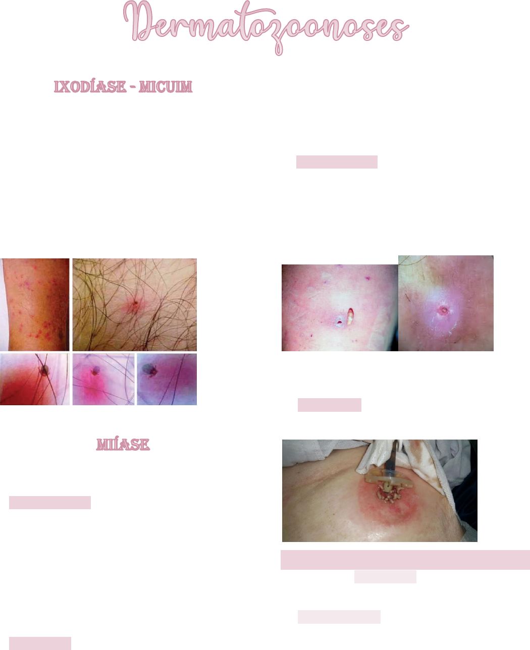 Aula 1 - Dermatologia 2º bimestre - Isabelle L. Provocada pelas larvas e ninfas do Amblioma cajennense (carrapato estrela). Seu parasitismo é intenso, adquire-se por contato com folhas rasteiras, como a grama, resultando pápulas eritematosas com inoculum central e intensamente pruriginosas. É rápido, deitou na grama e logo começa a coçar Tratamento: ivermectina oral → 1cp a cada 30kg Múltiplas pápulas pruriginosas Dermatobia hominis (berneira): miíase furunculóide (berne) Cochliomya macellaria (mosca varejeira): miíase cutânea. A miíase furunculóide é uma miíase primária, aqui a mosca Dermatobia hominis (bemeira), deposita seus ovos em outras moscas ou mosquitos e quando este inseto veiculador pousa no homem ou em outro animal de sangue quente a larva abandona o ovo e projeta-se para fora e vai penetrar na pele e ai pode desenvolver-se por 30 a 70 dias. A miíase cutânea é uma miíase secundária. Aqui as moscas depositam seus ovos na pele, em alguma solução de continuidade. As moscos que causam esta condição são principalmente a Cochliomya maceliaria (mosca varejeira) ou os do gênero Lucilla e Sarcophagidae. O quadro clínico em ambas inclui dor em ferroada, pode ocorrer infecção secundária. Na miíase furunculóide a região afetada se apresenta como um nódulo avermelhado com um pequeno orifício central por onde drena intermitentemente uma serosidade. O paciente pode experimentar fisgada, ferroada ou sensação de movimentos na lesão. Nódulo eritematoso, sensação em ferroada e fisgada, orifício com serosidade Na miíase cutânea encontramos a lesão primária com as larvas. Tratamento: O tratamento na miíase cutânea é matar as larvas com éter e remover com a devida assepsia Na miíase furunculoide para facilitar a remoção, pode-se fechar o orifício com vaselina, esparadrapo por um tempo e pinça-las quando vierem à superfície respirar. Aula 1 - Dermatologia 2º bimestre - Isabelle L. Eventualmente, quando a lesão é muito extensa, a remoção pode ser feita sob anestesia local Medicamentoso: ivermectina oral (na miíase cutânea) e antibioticoterapia Prevenção: A prevenção consiste em evitar a penetração das larvas, protegendo áreas descobertas da pele, principalmente feridas abertas, em especial nos locais onde existem muitas moscas. Uso de repelentes Sarcopotes scabiei variante hominis: sarna humana Sarcopotes scabei variante canis: sarna sarcóptica dos cães. Contágio interpessoal e raramente por fômites. Diagnóstico essencialmente clínico. Sinais e sintomas: A maioria dos pacientes com escabiose apresenta um prurido (coceira) no local. Nessa doença, há uma predileção por áreas interdigitais, regiões genitais masculinas e femininas, cotovelos, joelhos, região anterior das axilas e tronco Em pacientes imunodeprimidos pode ocorrer a apresentação exuberante da escabiose e com menos resposta eficaz ao tratamento especifico A sarna nodular apresenta-se como nódulos violáceos pruriginosos que frequentemente estão em regiões cobertas do corpo, principalmente na genitália masculina, região inguinal e nas axilas. Os nódulos podem persistir por várias semanas após o início do tratamento Prurido de início insidioso, que vai se intensificando, sendo mais acentuado à noite, raramente atinge a face. Lesões papulovesiculantes Em crianças pode atingir couro cabeludo, palmas e plantas. Sarna norueguesa Diagnóstico: Essencialmente clínico, lembre-se de perguntar por demais indivíduos da família. Tratamento: Tópico: permetrina (droga de escolha) - aplica-se no corpo todo, deixa 10 horas por 2 dias seguidos e repete após 1 semana pois o medicamento mata LARVAS. Ex. keltrina, Pediletan, etc. Outras medicações são enxofre precipitado a 5%, benzoato de benzila, monossulfiram, ambos por 3 dias e dar uma semana de intervalo e repetir mais 3 dias. Aula 1 - Dermatologia 2º bimestre - Isabelle L. A ivermectina tópica 1% em propilenoglicol no corpo todo por 2 dias, deixar 10 horas e repetir em uma semana. BEBÊS A PARTIR DE 6 MESES IVERMECTINA TÓPICA 0,5%, ANTES ENXOFRE PRECIPITADO 3%. Sistêmico: tiabendazol (50mg/kg/dia, no máximo de 3 g /dia por 10 dias) e ivermectina (crianças acima de 15 kg ou acima de 5 anos), a dose é 200 Ug/kg dose única e repetir em uma semana. Não precisa ferver roupa, oriente secar ao sol e passar a ferro. Lembrem-se de tratar o prurido (anti-histamínico) e de tratar a família Piolho é um inseto sem asas 3 tipos de pediculose Piolho da cabeça: Pediculus humanus capitis → PEDICULOSE DO COURO CABELUDO Piolho do corpo: Pediculus humanus corporis (muquirana) → PEDICULOSE CORPÓREA Região pubiana: Phtirus púbis (chato) → FITIRÍASE PUBIANA Sintomas: Coceira intensa Cocegas e sensação de movimentos dos cabelos Ovos dos piolhos (lêndeas) presentes em fios de cabelo, podem ser confundidas com caspa, mas são aderidas ao fio Pequenas saliências vermelhas no couro cabeludo, no pescoço e ombros Lêndeas: ovos firmemente ao pelo Pediculose corpórea → HIGIENE PRECARIA Fitiríase pubiana Tratamento: Ftiriase dos cílios: vaselina e remoção das lêndeas manualmente. Pediculose do couro cabeludo: shampoo de permetrina a 1%, deixar agir 10 minutos e enxaguar e repetir após uma semana. Ivermectina tópica 0.5% foi liberada para crianças a partir de 6 meses pelo FDA. Deixar agir por 10 minutos e enxaguar em seguida. Pediculose do corpo: banho e troca de roupas. Fitiríase púbis: permetrina 5% por 2 dias e repetir após 7 a 10 dias, por mais 2 dias. Prevenção: Tomar banho com shampoo e sabonete Limpar a casa Lavar e passar a roupa Levar ao sol estofados Conhecido como bicho de pé Tungiase → sarcopsilose → bicho de pé Tunga penetrans Pocilgas e estábulos Mais em região de pés Aspecto de favo de mel Aula 1 - Dermatologia 2º bimestre - Isabelle L. Diagnóstico: Pela identificação das pulgas e seus ovos nas lesões Tratamento limitado à remoção completa da pulga, extr