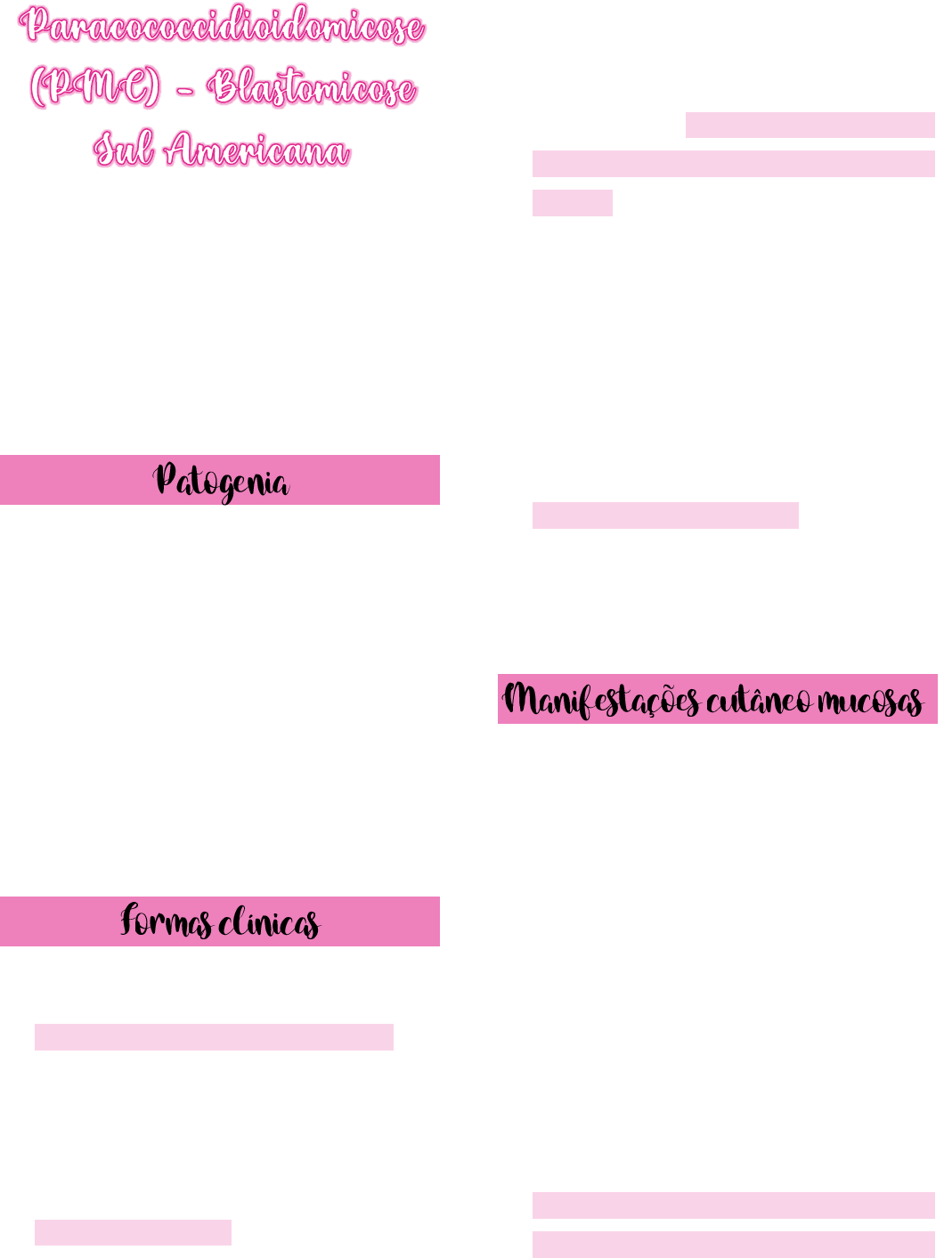Aula 3 – Dermatologia 2º bimestre – Isabelle L. É uma micose sistêmica causada pelo Paracoccidioides brasiliensis. Fungo termodimórfico (na natureza tem uma forma e no humano tem outra), que ocorre em toda américa do Sul, exceto no Chile. É mais frequente no Brasil, Venezuela, Colômbia e Argentina. O fungo vive na natureza na forma miceliana e, após inalado o fungo pode ser destruído pelo sistema imune, ou se transformar na forma leveduriforme, se multiplicar e formar o foco pulmonar primário. Este foco pulmonar primário, dependendo da resposta imune do hospedeiro frente à virulência do agente, pode evoluir para cura ou para doença progressiva ou ainda formar focos viáveis que podem ficar muitos anos em latência. Paracococcidiodomicose – infecção: assintomática ou oligossintomatico Forma aguda – subaguda (juvenil): há linfadenomegalia cervical ou generalizada, perda de peso, hepatoesplenomegalia, lesões cutâneas (5% dos casos), sendo raro o comprometimento da mucosa oral ou dos pulmões. Forma crônica unifocal: acomete um órgão em foco, normalmente o pulmão, rins ou SNC. A doença pulmonar é mais frequente (50-80% dos casos, atinge também suprarrenais e SNC. Cursa com tosse febre, dispneia e perda de peso. No raio-x de tórax se observa infiltrado intersticial para-hilar bilateral, com aspecto em asa de borboleta. Se não tratada progride para fibrose e cavitação. O comprometimento do SNC pode cursar com convulsões, cefaléia e sinais neurológicos dependentes da região atingida, é grave. O comprometimento das adrenais é frequente e se manifesta por fraqueza, hiperpigmentação cutânea e mucosa e hiponatremia. Forma crônica multifocal: parte do dermatologista → apresenta o comprometimento pulmonar associado a algum outro órgão que em geral é pele ou mucosas. Nas mucosas, o quadro característico é uma ulceração com pontilhado hemorrágico, denominada estomatite moriforme de Pupo (lesão placar com pontilhados hemorrágicos) Estas lesões com a evolução tornam-se vegetantes, pode atingir laringe e cordas vocais. Pode acometer o lábio, principalmente o inferior com lesões vegetantes e crostosas. O paciente pode apresentar dor, sialorréia e rouquidão. Na pele a lesão mais comum ocorre por disseminação hematogênica do parasita e encontram-se lesões disseminadas papulosas, papulovegetantes ,ulcerocrostosas e Aula 3 – Dermatologia 2º bimestre – Isabelle L. eritematopapulosas. Há também lesões encontradas ao redor da boca e da narina que podem ocorrer por contiguidade ou por fistulas. Estomatite moriforme de Pupo Diag diferencial → sífilis População de risco: ribeirinhos, que moram em região norte, próximo de áreas de florestas, em situações mais precárias Linfadenopatia → diagn. diferencial linfoma Lesões cutâneas na forma crônica multifocal. Nódulos endurados com bordas elevadas no tronco (A) e pernas (B). Pápulas e placas eritematosas, crostosas difusamente na face (C). Lesão ulcerada na glande (D). Diagnostico diferencial de leishmaniose → lesões ulceradas com bordas Diagnóstico diferencial imagem D: sífilis Aula 3 – Dermatologia 2º bimestre – Isabelle L. Radiografias de tórax em antero-posterior e perfil mostrando múltiplas opacidades heterogêneas, nodulares, confluentes, predominando em terço médio de ambos os pulmões. PLECT (PMC, leishmaniose, espinocelular, cromomicose, toxoplasmose) Linfoma Lúpus Sarcoidose EXAME MICOLÓGICO DIRETO: Com KOH evidencia-se colônias em gemulação birrefringentes. HISTOPATOLÓGICO: A coloração pela prata cora os fungos em negro e é possível visualizar a gemulação em orelha de mickey ou roda de leme nas formas agudas, nas formas crônicas há infiltrado granulomatoso rico em células epitelióides e gigantócitos. CULTURA: No macrocultivo evidencia-se colônica cotonosa com aspecto de pipoca estourada ao centro. No microcultivo células arredondas em gemulação imitando orelha de mickey ou roda de leme. Sensibilidade baixa mas especificidade de 100%. o Intradermorreação com paracoccidioidina: teste intradérmico positivo sugere infecção subclínica. Detecção de antígenos pela prova do látex. Detecção de DNA fúngico pela PCR. Imunodifusão: alta especificidade e alta sensibilidade Elisa de captura: alta especificidade Contraimunoeletroforese: alta sensibilidade e alta especificidade → melhor para fazer As provas sorológicas auxiliam no diagnóstico, no acompanhamento da resposta ao tratamento e no seguimento pós – terapêutico. SULFAMETOXAZOL + TRIMETOPRIMA 1200mg/240mg de 12/12 horas, por 2 meses, seguido de 800mg/240 mg por 22 meses ou até completar um ano de sorologia positiva, é usado nas formas leves e moderadas. ITRACONAZOL: Usa-se nas formas agudas ou subagudas moderadas na dose de 200 a 400mg/dia, por 3 a 12 meses. CETOCONAZOL: Muito tóxico. Aula 3 – Dermatologia 2º bimestre – Isabelle L. FLUCONAZOL TERBINAFINA: Na dose de 500mg/dia nas formas crônicas uni e multifocais. ANFOTERICINA B: nas formas disseminadas e graves. É uma micose subcutânea crônica produzida pelo Sporothrix schenkii, que acomete principalmente a pele e, raramente as mucosas e/ou órgãos internos. Sua implantação geralmente é traumática, em geral por vegetais contaminados com esporos do fungo e, pode ser transmitida por gatos também. Lesão do jardineiro → espinho Forma cutânea localizada ou forma fixa: acomete mais a face, lesão papular ou verrucosa que pode ulcerar. Forma cutâneo-linfática: É a forma mais comum. Há lesão nodular no ponto de inoculação que pode ulcerar e, posteriormente surgem nódulos ou gomas ao longo do trajeto da cadeia linfática do local acometido (rosário linfangítico). Acomete face e membros superiores. Forma mucosa localizada: nódulos, vegetações e ulceração. Forma extracutânea Forma disseminada Rosário linfangítico Diagn. diferencial importante: micobacteriose atípica, porem, micobacte