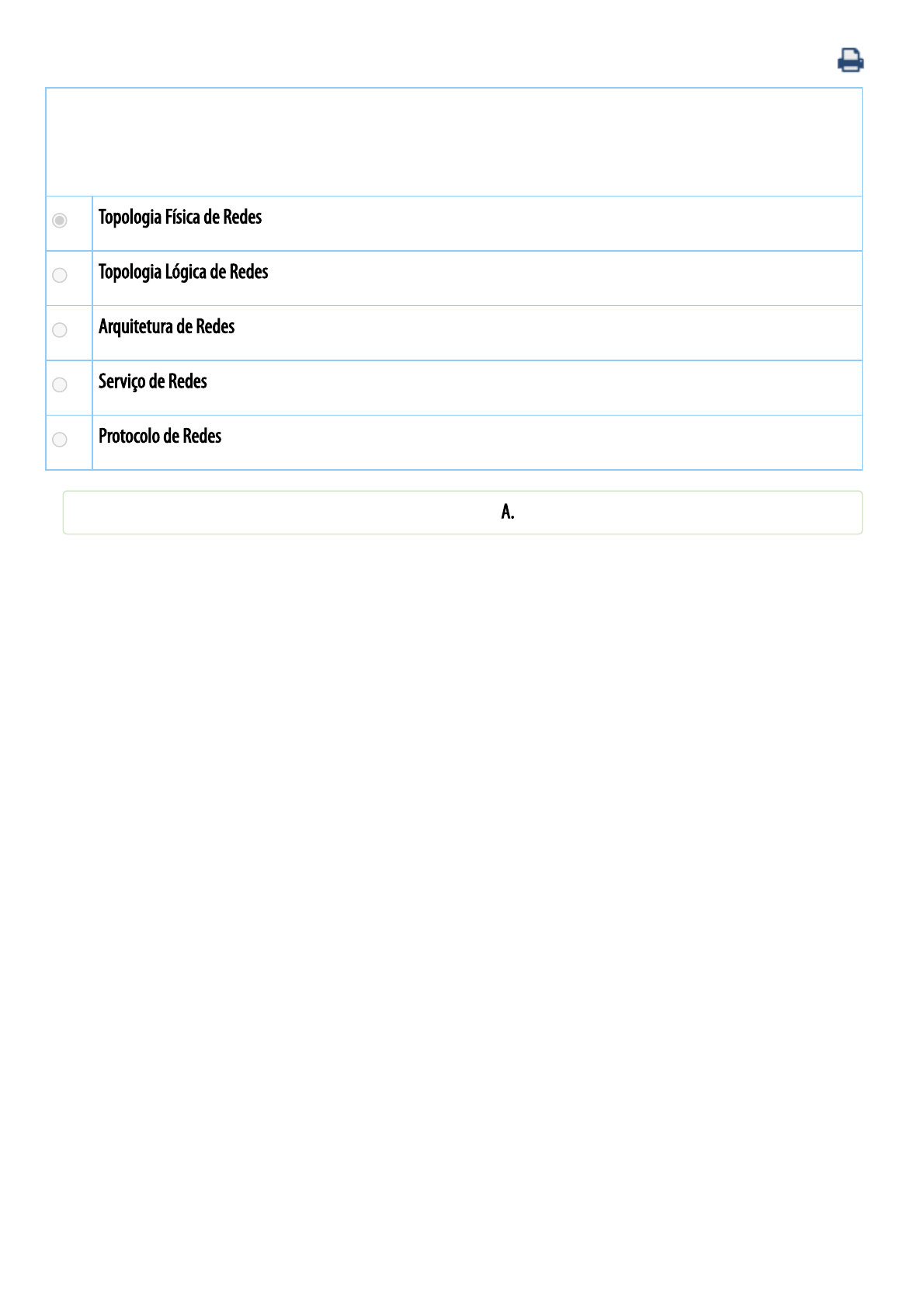 30/08/2022 23:25 Universidade Paulista - UNIP : Disciplina On-line. https://unip.br/aluno/central/sistemas/acesso/138 1/1 Quando mencionamos às conexões físicas e identi�cação de dispositivos �nais e intermediários, bem como as suas interconexões, estamos nos referindo a um (a): A Topologia Física de Redes B Topologia Lógica de Redes C Arquitetura de Redes D Serviço de Redes E Protocolo de Redes Você já respondeu e acertou esse exercício. A resposta correta é: A. 30/08/2022 23:25 Universidade Paulista - UNIP : Disciplina On-line. https://unip.br/aluno/central/sistemas/acesso/138 1/1 Quando mencionamos a maneira encontrada pelas redes para a transferência das informações entre a origem e o destino, estamos nos referindo a um (a): A Topologia Física de Redes B Topologia Lógica de Redes C Arquitetura de Redes D Serviço de Redes E Protocolo de Redes Você já respondeu e acertou esse exercício. A resposta correta é: B. 30/08/2022 23:25 Universidade Paulista - UNIP : Disciplina On-line. https://unip.br/aluno/central/sistemas/acesso/138 1/1 Quando mencionamos o projeto e desenho de tecnologias que suportam a infraestrutura, além dos procedimentos, serviços e padrões, ou protocolos, que favorecem o �uxo da informação nas redes de comunicação, estamos nos referindo a um (a): A Topologia Física de Redes B Topologia Lógica de Redes C Arquitetura de Redes D Serviço de Redes E Protocolo de Redes Você já respondeu e acertou esse exercício. A resposta correta é: C. 30/08/2022 23:25 Universidade Paulista - UNIP : Disciplina On-line. https://unip.br/aluno/central/sistemas/acesso/138 1/1 Qual das opções a seguir retrata dois tipos de topologias físicas de WAN? A Hub/Spoke e Barramento B Ponto-a-ponto e Anel C Malha e Hub/Spoke D Barramento e Ponto-a-ponto E Anel e Estrela Você já respondeu e acertou esse exercício. A resposta correta é: C. 30/08/2022 23:26 Universidade Paulista - UNIP : Disciplina On-line. https://unip.br/aluno/central/sistemas/acesso/138 1/1 Qual das opções a seguir retrata dois tipos de topologias físicas de LAN? A Hub/Spoke e Barramento B Ponto-a-ponto e Anel C Malha e Hub/Spoke D Barramento e Ponto-a-ponto E Anel e Estrela Você já respondeu e acertou esse exercício. A resposta correta é: E. 30/08/2022 23:26 Universidade Paulista - UNIP : Disciplina On-line. https://unip.br/aluno/central/sistemas/acesso/138 1/1 Qual é a topologia lógica que tem como característica mais latente a possibilidade de transmissão, por parte de um dispositivo �nal, a qualquer momento com um mecanismo de contenção do meio físico, de modo a não haver uma colisão? A Anel B Hub/Spoke C Malha D Meio físico compartilhado E Ponto-a-ponto Você já respondeu e acertou esse exercício. A resposta correta é: D. 30/08/2022 23:26 Universidade Paulista - UNIP : Disciplina On-line. https://unip.br/aluno/central/sistemas/acesso/138 1/1 Qual é a topologia lógica que utiliza o método de passagem de token? A Anel B Hub/Spoke C Malha D Meio físico compartilhado E Ponto-a-ponto Você já respondeu e acertou esse exercício. A resposta correta é: A. 30/08/2022 23:26 Universidade Paulista - UNIP : Disciplina On-line. https://unip.br/aluno/central/sistemas/acesso/138 1/1 Quais são os três requisitos da segurança em uma arquitetura de redes? A Con�abilidade, conformidade e disponibilidade B Con�dencialidade, integridade e disponibilidade C Con�dencialidade, integridade e e�ciência D Efetividade, integridade e con�abilidade E Efetividade, E�ciência e conformidade Você já respondeu e acertou esse exercício. A resposta correta é: B.