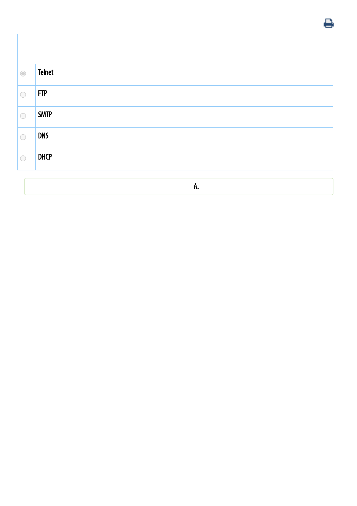 30/08/2022 23:36 Universidade Paulista - UNIP : Disciplina On-line. https://unip.br/aluno/central/sistemas/acesso/138 1/1 Qual dos protocolos de aplicação é utilizado para aplicação de acesso remoto? A Telnet B FTP C SMTP D DNS E DHCP Você já respondeu e acertou esse exercício. A resposta correta é: A. 30/08/2022 23:37 Universidade Paulista - UNIP : Disciplina On-line. https://unip.br/aluno/central/sistemas/acesso/138 1/1 Qual dos protocolos de transporte é orientado a conexão? A UDP B TCP C FTP D DNS E DHCP Você já respondeu e acertou esse exercício. A resposta correta é: B. 30/08/2022 23:37 Universidade Paulista - UNIP : Disciplina On-line. https://unip.br/aluno/central/sistemas/acesso/138 1/1 Qual dos itens abaixo equivale a uma função do transporte não-orientado a conexão? A Controle de �uxo B Con�rmações C Janelamento D Segmentação E Agrupamento organizado Você já respondeu e acertou esse exercício. A resposta correta é: D. 30/08/2022 23:37 Universidade Paulista - UNIP : Disciplina On-line. https://unip.br/aluno/central/sistemas/acesso/138 1/1 Qual é a PDU da Camada de Transporte? A Dados B Segmento C Quadro D Bits E Pacote Você já respondeu e acertou esse exercício. A resposta correta é: B. 30/08/2022 23:37 Universidade Paulista - UNIP : Disciplina On-line. https://unip.br/aluno/central/sistemas/acesso/138 1/1 Qual é o protocolo de aplicação utilizado na transferência de arquivos? A SMTP B POP3 C DNS D FTP E Telnet Você já respondeu e acertou esse exercício. A resposta correta é: D. 30/08/2022 23:37 Universidade Paulista - UNIP : Disciplina On-line. https://unip.br/aluno/central/sistemas/acesso/138 1/1 Qual dos protocolos de transporte é não orientado a conexão? A SMTP B TCP C UDP D FTP E TFTP Você já respondeu e acertou esse exercício. A resposta correta é: C. 30/08/2022 23:37 Universidade Paulista - UNIP : Disciplina On-line. https://unip.br/aluno/central/sistemas/acesso/138 1/1 Qual é a camada do modelo TCP/IP que é mais próxima do usuário? A Acesso à rede B Internet C Transporte D Sessão E Aplicação Você já respondeu e acertou esse exercício. A resposta correta é: E. 30/08/2022 23:38 Universidade Paulista - UNIP : Disciplina On-line. https://unip.br/aluno/central/sistemas/acesso/138 1/1 Qual é a camada do modelo TCP/IP responsável pelo roteamento? A Acesso à rede B Internet C Transporte D Sessão E Aplicação Você já respondeu e acertou esse exercício. A resposta correta é: B.