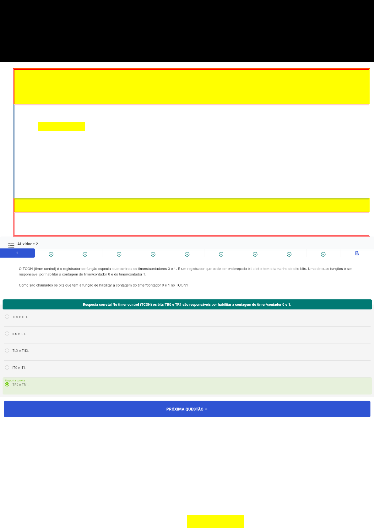 ATIVIDADE 2 (A2) 06.2 (MICROCONTROLADORES E IOT) 1) O TCON (timer control) é o registrador de função especial que controla os timers/contadores 0 e 1. É um registrador que pode ser endereçado bit a bit e tem o tamanho de oito bits. Uma de suas funções é ser responsável por habilitar a contagem do timer/contador 0 e do timer/contador 1. Como são chamados os bits que têm a função de habilitar a contagem do timer/contador 0 e 1 no TCON? A) TR0 e TR1. B) TLX e THX. C) IE0 e IE1. D) IT0 e IT1. E) TF0 e TF1. Comentário da resposta: Resposta correta! No timer control (TCON) os bits TR0 e TR1 são responsáveis por habilitar a contagem do timer/contador 0 e 1. 6 SEMESTRE DE 2022 (BLOCO 1) - 2o PROVA ATIVIDADE 2 (MICROCONTROLADORES E IOT) 2) Na família de microcontroladores com núcleo do 8051, existem dois módulos “0” e “1”, que são configurados pelos registradores TCON e TMOD e responsáveis por gerar as rotinas de tempo e determinar a velocidade (baud rate) da comunicação serial. Considerando essas informações, como são chamados estes módulos? A) timers/contadores. B) Timer 0 e Timer 1. C) TH0 e TH1. D) Clock e Interrut. E) PT0 e PT1. Comentário da resposta: Resposta correta. Os timers/contadores são responsáveis pelas rotinas de tempo e velocidade da comunicação serial. 6 SEMESTRE DE 2022 (BLOCO 1) - 2o PROVA ATIVIDADE 2 (MICROCONTROLADORES E IOT) 3) Os timers/contadores 0 e 1 possuem quatro modos de operação e são selecionados por bits (M1 e M0) do registrador TMOD, sendo que os modos 0,1,2 programam os timers/contadores 0 e 1 de forma semelhante, e o modo 3 programam os timers/contadores 0 e 1 diferentemente um do outro. O tamanho do registrador de contagem é configurado em número de bits e os modos de operação podem conter diferentes tamanhos. Assinale a alternativa em que os modos de operação são configurados em 13 bits e 16 bits, respectivamente. A) Modo “1” e modo “3”. B) Modo “0” e modo “1”. C) Modo “0” e modo “3”. D) Modo “1” e modo “2”. E) Modo “2” e modo “3”. Comentário da resposta: Resposta correta! Modo 0-8 bits mais significativos da contagem feitos por meio do registrador TH0 ou TH1 e os 5 bits menos significativos da contagem ficam dentro do registrador TL0 e TL1, a contagem se limita a 8192 e Modo 1-8 bits do registrador TH0 ou TH1 e 8 bits do registrador TL0 ou TL1, sendo usada para gerar tempos maiores, pois a contagem está limitada a 65636. 6 SEMESTRE DE 2022 (BLOCO 1) - 2o PROVA ATIVIDADE 2 (MICROCONTROLADORES E IOT) 4) De acordo com Gimenez (2015), existem dois timers/contadores na família de microcontroladores com núcleo do 8051, denominados timer/contador 0 e timer/contador 1 [...]. Um timer/contador nada mais é do que um circuito sequencial composto por um registrador de contagem (conjunto de flip-flops do tipo D) e portas lógicas, que foi projetado para ser um contador ascendente cíclico, se o timers/contador 0 está no modo 3, o timers/contador 1 pode ser ligado ou desligado dentro e fora do seu próprio modo 3, ainda pode ser usado em outras funções. Gimenez, S. P. Microcontroladores 8051: conceitos, operações, fluxogramas e programação. São Paulo: Erica, 2015. Entre as funções a seguir, quais podem ser usadas no timer/contador 1, caso o timer/contador 0 estiver no modo 3? I. Gerador de baud rate pela interface de comunicação serial. II. Contador de dez bits. III. Aplicações sem interrupções. IV. Gerador de relógio interno. Está correto apenas o que é afirmado em: ~Resposta Correta. As funções que podem ser usadas quando o Timer/contador 0 estiver no modo 3 são gerador de baud rate pela interface de comunicação serial e aplicações sem interrupções. A) II e III. B) I e III. C) I, III e IV. D) I, II e IV. E) II e IV. Comentário da resposta: Sua resposta está correta. 6 SEMESTRE DE 2022 (BLOCO 1) - 2o PROVA ATIVIDADE 2 (MICROCONTROLADORES E IOT) 5) Uma interrupção significa parar o programa principal para tratar uma mudança de comportamento das condições que estão sendo controladas. Essa parada leva a uma outra rotina de atendimento desta interrupção. O tipo de interrupção pode ser configurado e assim determina como ela será executada. No microcontrolador 8051 há pelo menos cinco entradas de interrupção. Quais são elas? A) Uma interrupção externa, duas pelos processadores e duas pela interface PSW. B) Duas interrupções externas e três pelos timers/contadores. C) Duas interrupções externas, duas pelos timers/contadores e uma pela interface de comunicação serial D) Duas interrupções de clock, uma pelos timers/contadores e duas pela interface de comunicação digital. E) Três interrupções de clock e duas pela interface PSW. Comentário da resposta: Resposta correta. As cinco interrupções são duas interrupções externas, duas pelos timers/contadores e uma pela interface de comunicação serial. @Resposta incorreta. As cinco interrupções são duas vindas pela porta três, duas são internas e outra por outro tipo de porta. Relembre os tipos usados nesse modelo estudado. 6 SEMESTRE DE 2022 (BLOCO 1) - 2o PROVA ATIVIDADE 2 (MICROCONTROLADORES E IOT) 6) Uma interrupção pode ser exemplificada com uma situação em que estamos executando uma tarefa e somos chamados. Nesse caso, paramos a tarefa para escutar e fazer outra atividade ou retornar à inicial. Nos microcontroladores ocorre o mesmo processo. No microcontrolador ATMEGA essas interrupções são chamadas de interrupções externas e são tratadas por pinos INT0 ou INT1 e os pinos do PCINT. As interrupções externas podem ser setadas pelo aumento de borda ou queda de borda. Considerando essas informações e o conteúdo estudado, pode-se afirmar que a configuração das interrupções é feita em qual registro? A) TF1. B) TCON. C) TR0. D) EICRA. E) IT0. Comentário da resposta: Resposta Correta! A configuração no registro EICRA define se as interrupções externa