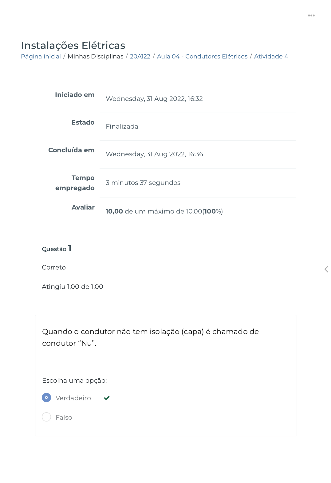 Página inicial / Minhas Disciplinas / 20A122 / Aula 04 - Condutores Elétricos / Atividade 4 Instalações Elétricas Iniciado em Wednesday, 31 Aug 2022, 16:32 Estado Finalizada Concluída em Wednesday, 31 Aug 2022, 16:36 Tempo empregado 3 minutos 37 segundos Avaliar 10,00 de um máximo de 10,00(100%) Questão 1 Correto Atingiu 1,00 de 1,00 Quando o condutor não tem isolação (capa) é chamado de condutor “Nu”. Escolha uma opção: Verdadeiro Falso https://ava.politecnicabr.com.br/ https://ava.politecnicabr.com.br/course/view.php?id=959 https://ava.politecnicabr.com.br/course/view.php?id=959#section-5 https://ava.politecnicabr.com.br/mod/quiz/view.php?id=32487 https://ava.politecnicabr.com.br/ Questão 2 Correto Atingiu 1,00 de 1,00 Isolamento é quantitativo, referindo-se à classe de corrente para a qual o condutor foi projetado. Escolha uma opção: Questão 3 Correto Atingiu 1,00 de 1,00 Isolação – é um termo qualitativo referindo-se ao tipo do produto da capa para isolar eletricamente o condutor de metal. Escolha uma opção: Verdadeiro Falso Verdadeiro Falso https://ava.politecnicabr.com.br/ Questão 4 Correto Atingiu 1,00 de 1,00 A Norma NBR 5410/97 determina que os condutores isolados devem ser identi�cados pela cor da Isolação, conforme a sua função. O condutor Neutro: a isolação deve ser sempre na cor: azul claro Escolha uma opção: Questão 5 Correto Atingiu 1,00 de 1,00 A Norma NBR 5410/97 determina que os condutores isolados devem ser identi�cados pela cor da Isolação, conforme a sua função. O Condutor Fase: a isolação deverá ser de cores: diferentes dos condutores, Neutro e o de Proteção (PE). Por exemplo: usar isolação de cores vermelha e/ou preta. Escolha uma opção: Verdadeiro Falso Verdadeiro Falso https://ava.politecnicabr.com.br/ Questão 6 Correto Atingiu 1,50 de 1,50 A Norma NBR 5410/97 determina que os condutores isolados devem ser identi�cados pela cor da Isolação, conforme a sua função. O condutor de Proteção (PE): a isolação deve ser na cor: amarela. Escolha uma opção: Questão 7 Correto Atingiu 1,00 de 1,00 É constituído de um condutor isolado recoberto por uma camada para a proteção mecânica, denominada cobertura. Escolha uma opção: Verdadeiro Falso a. Cabo Tripolar b. Cabo Nu c. Cabo Bipolar d. Cabo Unipolar https://ava.politecnicabr.com.br/ Questão 8 Correto Atingiu 1,00 de 1,00 Os metais mais usados para condução de energia elétrica são: Prata, Cobre e Alumínio. Escolha uma opção: Questão 9 Correto Atingiu 1,50 de 1,50 É constituído por dois ou mais condutores isolados, envolvidos por uma camada para a proteção mecânica, denominada também, de cobertura. Escolha uma opção: Verdadeiro Falso a. Cabo Bipolar b. Cabo Tripolar c. Cabo Unipolar d. Cabo Multpolar https://ava.politecnicabr.com.br/ © 2022 - Escola Politécnica Brasileira Entre em Contato https://www.politecnicabr.com.br 0800 084 2627 0800 084 2627 Links Úteis Dicas da nossa Diretora Acadêmica Planner de Estudos Declaração de Matrícula Orientações do AVA Abertura de Ticket Fale com o Tutor Cronograma de Estudos Manual de Estágio Manual de Competência Siga-nos nas redes sociais https://ava.politecnicabr.com.br/mod/quiz/0 https://www.politecnicabr.com.br/ https://soundcloud.com/user-501638417/sets/escola-politecnica-brasileira https://storage.googleapis.com/sirius-pubstore/semestre_plannerdeestudo%20poli.pdf https://storage.googleapis.com/sirius-pubstore/declaracao_matricula.pdf https://storage.googleapis.com/sirius-pubstore/orientacoes_ava.pdf https://storage.googleapis.com/sirius-pubstore/abertura_ticket.pdf https://storage.googleapis.com/sirius-pubstore/fale_com_tutor.pdf https://storage.googleapis.com/sirius-pubstore/cronograma_estudos.pdf https://storage.googleapis.com/sirius-pubstore/manual_estagio.pdf https://storage.googleapis.com/sirius-pubstore/manual_competencia.pdf https://www.facebook.com/politecnicabr https://www.instagram.com/politecnicabr_oficial https://ava.politecnicabr.com.br/