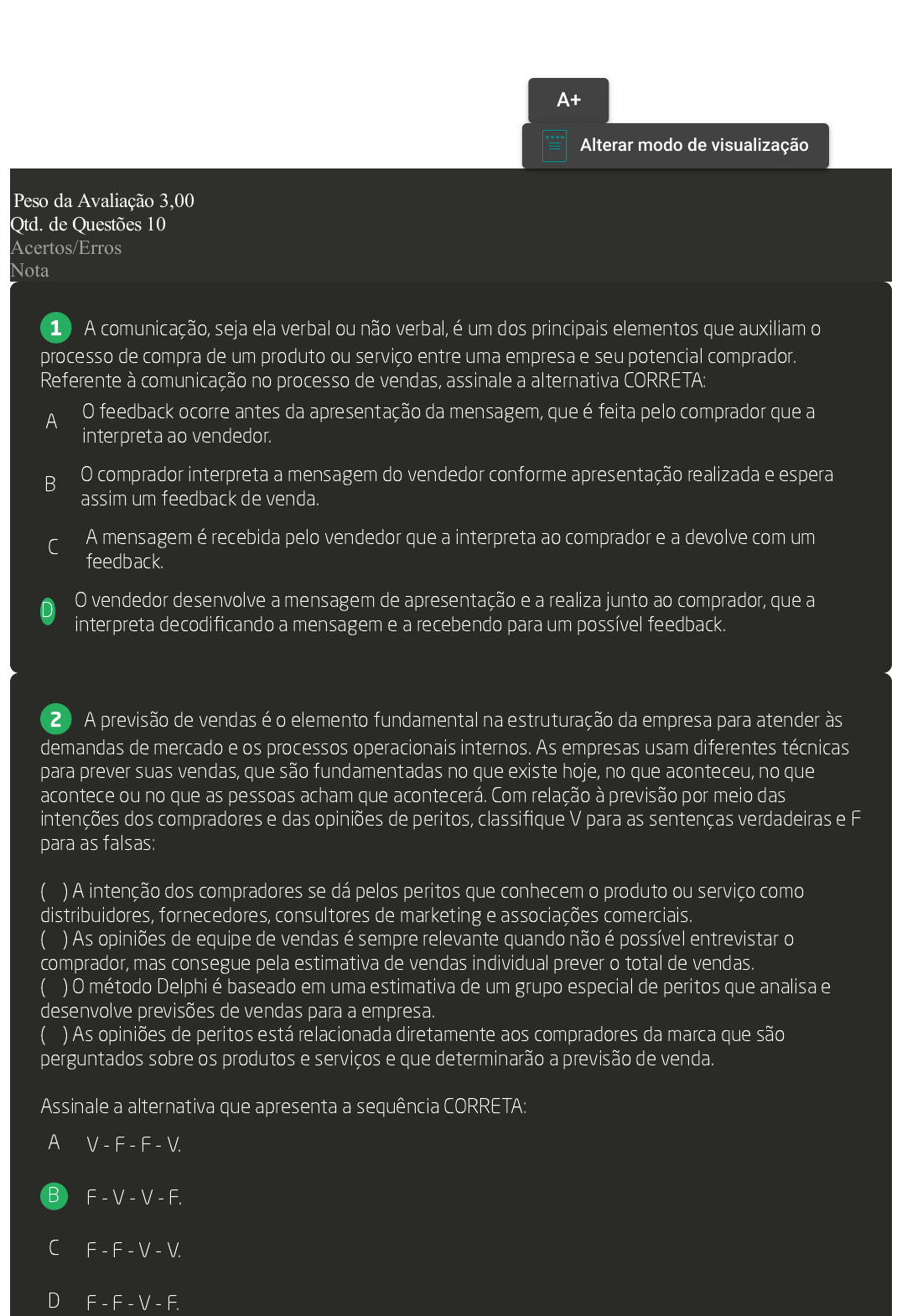 Prova Impressa GABARITO | Avaliação Final (Objetiva) - Individual (Cod.:668529) Acertos/Erros 9/1 Nota 9,00 A comunicação, seja ela verbal ou não verbal, é um dos principais elementos que auxiliam o processo de compra de um produto ou serviço entre uma empresa e seu potencial comprador. Referente à comunicação no processo de vendas, assinale a alternativa CORRETA: A O feedback ocorre antes da apresentação da mensagem, que é feita pelo comprador que a interpreta ao vendedor. B O comprador interpreta a mensagem do vendedor conforme apresentação realizada e espera assim um feedback de venda. C A mensagem é recebida pelo vendedor que a interpreta ao comprador e a devolve com um feedback. D O vendedor desenvolve a mensagem de apresentação e a realiza junto ao comprador, que a interpreta decodificando a mensagem e a recebendo para um possível feedback. A previsão de vendas é o elemento fundamental na estruturação da empresa para atender às demandas de mercado e os processos operacionais internos. As empresas usam diferentes técnicas para prever suas vendas, que são fundamentadas no que existe hoje, no que aconteceu, no que acontece ou no que as pessoas acham que acontecerá. Com relação à previsão por meio das intenções dos compradores e das opiniões de peritos, classifique V para as sentenças verdadeiras e F para as falsas: ( ) A intenção dos compradores se dá pelos peritos que conhecem o produto ou serviço como distribuidores, fornecedores, consultores de marketing e associações comerciais. ( ) As opiniões de equipe de vendas é sempre relevante quando não é possível entrevistar o comprador, mas consegue pela estimativa de vendas individual prever o total de vendas. ( ) O método Delphi é baseado em uma estimativa de um grupo especial de peritos que analisa e desenvolve previsões de vendas para a empresa. ( ) As opiniões de peritos está relacionada diretamente aos compradores da marca que são perguntados sobre os produtos e serviços e que determinarão a previsão de venda. Assinale a alternativa que apresenta a sequência CORRETA: A V - F - F - V. B F - V - V - F. C F - F - V - V. D F - F - V - F. VOLTAR A+ Alterar modo de visualização 1 2 Peso da Avaliação 3,00 Qtd. de Questões 10 O Marketing Digital é uma estratégia do marketing que visa ao planejamento de ações com base em canais digitais. Com relação aos canais de marketing digital, classifique V para as sentenças verdadeiras e F para as falsas: ( ) As mídias sociais, como o Facebook, o Instagram, o Linkedin e outros, são utilizados como canais de comunicação em que as estratégias de marketing são aplicadas. ( ) O marketing de relacionamento é aplicado nas estratégias digitais para suporte e relacionamento com clientes novos e atuais. ( ) Faz parte do planejamento de estratégias digitais somente o estudo de segmentação de consumidores. ( ) O marketing de mecanismo de busca, estratégias adotadas em sites de busca, fazem parte do planejamento digital de marcas. Assinale a alternativa que apresenta a sequência CORRETA: A V - F - V - F. B F - F - V - V. C V - F - F - V. D V - V - F - V. Segundo Cobra (2009), merchandising é a criação de um cenário para o produto em loja física. Muitas compras são realizadas pelos consumidores no ponto de venda com base no impulso de venda do local. Sobre merchandising, classifique V para as sentenças verdadeiras e F para as falsas: ( ) Merchandising, publicidade e propaganda são consideradas as mesmas técnicas nesta área. ( ) É uma técnica responsável pelo destaque de produtos no ponto de venda. ( ) O público final e os intermediadores são o público- alvo das técnicas destas ações. ( ) Utiliza motivadores para o impulsionamento do produto ou serviço no ponto de venda Assinale a alternativa que apresenta a sequência CORRETA: FONTE: COBRA, M. Administração de marketing no Brasil. Rio de Janeiro: Elsevier, 2009. A F - V - F - V. B V - F - V - F. C F - V - V - F. D F - F - V - V. Preparar a loja para o consumidor significa utilizar técnicas de merchandising para deixá-la ainda mais atrativa para a venda. Referente àas técnicas de merchandising, classifique V para as 3 4 5 sentenças verdadeiras e F para as falsas: ( ) A indicações de preços, placas, propagandas, ofertas e vantagens dos produtos fazem parte da técnica de layout da loja. ( ) A utilização de display em lojas é uma técnica comumente conhecida na comunicação para dar ênfase aos produtos. ( ) Distribuir os equipamentos necessários para o planejamento da loja e o fluxo de usuários faz parte da técnica de layout da loja. ( ) A forma como os produtos são expostos, se empilhados ou agrupados, faz parte da técnica de comunicação dos produtos na loja. Assinale a alternativa que apresenta a sequência CORRETA: A F - V - F - F. B V - F - F - V. C V - V - F - F. D F - V - V - F. As melhores empresas para trabalhar lembram uma coisa que não muda: as pessoas com quem trabalham sempre serão pessoas. Esta frase é do cofundador da Great Place to Work, no qual resume a tendência na liderança corporativa, com um olhar mais profundo para o ser humano. Essa tendência acompanha os movimentos sociais, as novas tecnologias que multiplicam oportunidades de comunicação, o comportamento das novas gerações e, principalmente, a chegada de líderes empreendedores ao mercado, sejam eles os donos ou não. Sobre os principais tipos de liderança, associe os itens, utilizando o código a seguir: I- Autoritária. II- Liberal. III- Visionária. IV- Democrática. ( ) Costuma ter seu foco na execução de demandas, seguindo de forma rigorosa as regras preestabelecidas. ( ) Reconhece a importância dos colaboradores para a obtenção de bons resultados e busca motivá- los constantemente. ( ) Deixa os colaboradores mais livres para exercerem suas funções e tomarem suas próprias decisões. ( ) Os colaboradores fazem parte das decisões importantes dos grup