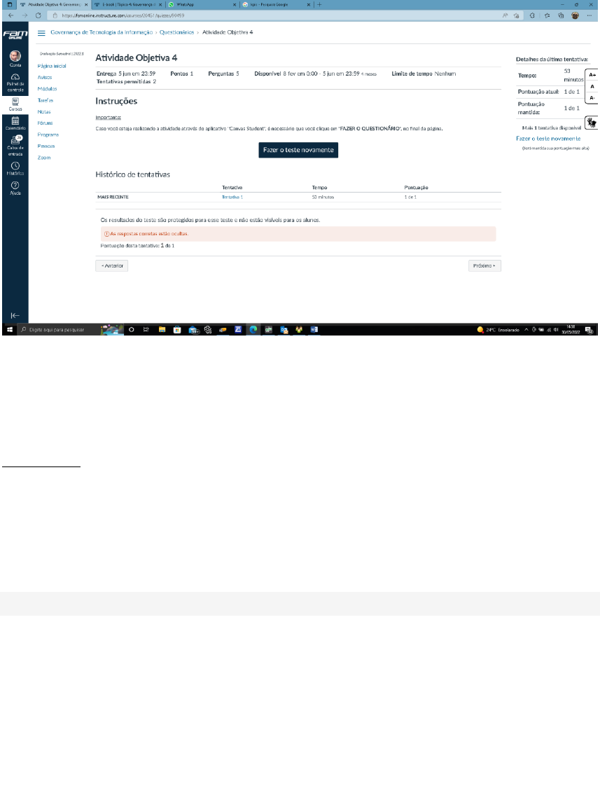 Atividade Objetiva 4 Iniciado: 30 mai em 13:45 Instruções do teste Importante: Caso você esteja realizando a atividade através do aplicativo "Canvas Student", é necessário que você clique em "FAZER O QUESTIONÁRIO", no final da página. Sinalizar pergunta: Pergunta 1 Pergunta 10,2 pts Leia o texto e observe o fluxograma a seguir: O Gerenciamento de Incidentes no ITIL tem como foco principal restabelecer o serviço o mais rápido possível minimizando o impacto negativo no negócio, uma solução de contorno ou reparo rápido fazendo com que o cliente volte a trabalhar de modo alternativo. Garantir que os melhores níveis de disponibilidade e de qualidade dos serviços, sejam mantidos conforme os acordos de nível de serviço é também uma tarefa da gerência de incidentes. Fonte: Gerenciamento de Incidentes – ITIL por Diogo. Devmedia. 2007. Disponível em: https://www.devmedia.com.br/gerenciamento-de-incidentes-itil/7174. Acesso em: 04 de março de 2021. https://famonline.instructure.com/courses/20451/quizzes/90499/take Considerando as informações apresentadas, assinale a opção correta. Um serviço deve ser encerrado após não ser classificado como ‘grave’. O diagnóstico do serviço deve ser realizado após a identificação deste serviço. Um serviço solicitado como ‘grave’ deve iniciar com o gerenciamento e realocação. Quando a solicitação de um serviço é realizada e classificado como ‘grave’, deve-se iniciar os procedimentos de Incidentes Graves. Quando a solicitação de um serviço é realizada e classificado como ‘grave’, deve-se realizar um diagnóstico inicial. Sinalizar pergunta: Pergunta 2 Pergunta 20,2 pts Leia o texto a seguir: O CMMI é um modelo de maturidade para o desenvolvimento e manutenção de software e dos serviços que abrangem o ciclo de vida do produto, desde sua concepção até a sua entrega e manutenção. Este modelo dá ênfase às disciplinas de engenharia de sistemas e também à engenharia de software e à integração necessária para construir e manter os produtos de forma abrangente. Este modelo oferece um conjunto de boas práticas agrupadas de acordo com áreas de atividades correlatas e níveis de maturidade. Estes níveis correspondem a etapas progressivas de eficácia gerencial e se apresentam como um caminho evolucionário para qualquer organização que pretenda melhorar seus processos de desenvolvimento e manutenção de software. Fonte: MORGADO, G. P. et al, Práticas CMMI como regras de negócio. Produção. V. 17, n. 2, p. 383-394. 2007. p. 384. Disponível em: https://www.scielo.br/pdf/prod/v17n2/a13v17n2.pdf. Acesso em: 03 de março de 2021. Quais as duas representações do modelo CMMI? https://famonline.instructure.com/courses/20451/quizzes/90499/take Grupo de escolhas da pergunta Estagiada e contínua. Sponsor e champions. Realizado e gerenciado. Control e define. Desenho de serviços e estratégia de serviços. Sinalizar pergunta: Pergunta 3 Pergunta 30,2 pts Leia os trechos abaixo: Trecho I O framework M_o_R (Management of Risk – Gerenciamento de Riscos), desenvolvido pelo Office of Government Commerce (OGC), é um guia elaborado para auxiliar organizações na tomada de decisão sobre os riscos que possam afetar o alcance de objetivos estratégicos de programas, projetos ou operações. A metodologia engloba princípios, abordagem e processos em um conjunto de passos inter-relacionados nestas dimensões para o gerenciamento de riscos em organizações. Também é apoiada por ferramentas e técnicas para a identificação, avaliação e tratamento destes riscos. (Fonte: Disponível em: https://www.axelos.com/best-practice-solutions/mor/what-is-mor. Acesso em: 04 mar. 2021.)(traduzido pela autora) Trecho II A revisão da norma ABNT ISO 31000 oferece um guia mais claro, mais curto e mais conciso que ajudará as organizações a usar os princípios de gerenciamento de risco para melhorar o planejamento e tomar melhores decisões. A seguir estão as principais mudanças desde a edição anterior: • Revisão dos princípios da gestão de riscos, que são os principais critérios para o seu sucesso; • Foco na liderança da alta administração, que deve assegurar que o gerenciamento de riscos seja integrado em todas as atividades organizacionais, começando pela governança da organização; • Maior ênfase na natureza iterativa da gestão de riscos, aproveitando novas experiências, conhecimento e análise para a revisão de elementos de processo, ações e controles em cada etapa do processo; [...] (Fonte: Disponível em: abnt.org.br/imprensa/releases/5753-lancada-a-nova-versao-da-norma-iso-31000-gestao-de- riscos. Acesso em: 04 mar. 2021.) Considerando as informações apresentadas, avalie as asserções a seguir e a relação entre elas: I. O processo de gestão de riscos do M_o_R-OGC contém várias etapas, são elas: comunicar, identificar, estimar/avaliar e implementar. https://famonline.instructure.com/courses/20451/quizzes/90499/take PORQUE II. A norma ABNT NBR ISO 31000 define princípios e diretrizes em gestão de riscos, e pode ser adotada por diferentes organizações nas atividades de decisão estratégica, operação, processo, função, projeto, serviço e avaliação de riscos. A respeito dessas asserções, assinale a opção correta: Grupo de escolhas da pergunta A asserção I é uma proposição falsa, e a II é uma proposição verdadeira As asserções I e II são proposições verdadeiras, e a II é uma justificativa da I. As asserções I e II são ambas proposições falsas. As asserções I e II são proposições verdadeiras, mas a II não é uma justificativa da I. A asserção I é uma proposição verdadeira, e a II é uma proposição falsa. Sinalizar pergunta: Pergunta 4 Pergunta 40,2 pts Leia o caso abaixo? A Empresa X atua no ramo de embalagens plásticas flexíveis e utilizava um sistema ERP próprio e não possuía uma ferramenta de Service Desk, nem uma met