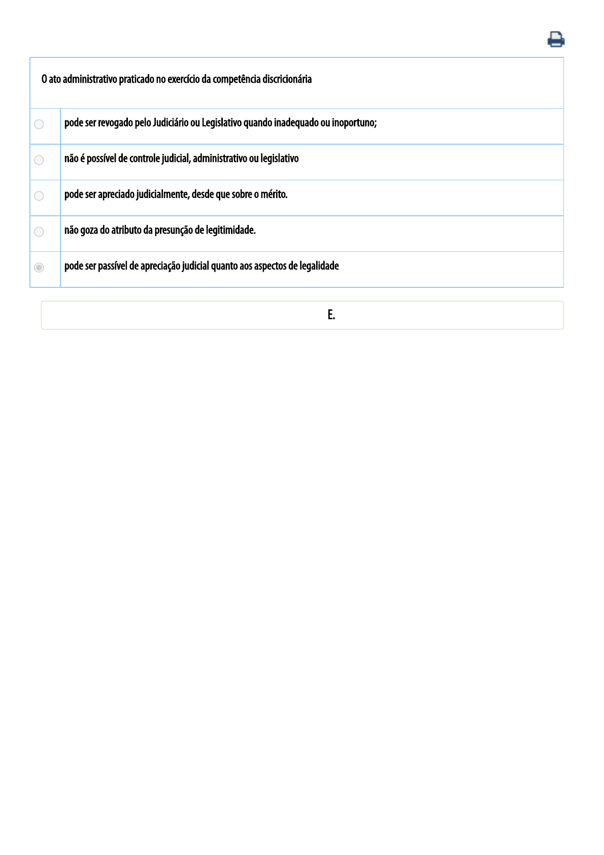 21/08/2022 16:27 Universidade Paulista - UNIP : Disciplina On-line. https://www.unip.br/aluno/central/sistemas/acesso/138 1/1 O ato administrativo praticado no exercício da competência discricionária A pode ser revogado pelo Judiciário ou Legislativo quando inadequado ou inoportuno; B não é possível de controle judicial, administrativo ou legislativo C pode ser apreciado judicialmente, desde que sobre o mérito. D não goza do atributo da presunção de legitimidade. E pode ser passível de apreciação judicial quanto aos aspectos de legalidade Você já respondeu e acertou esse exercício. A resposta correta é: E. 21/08/2022 16:33 Universidade Paulista - UNIP : Disciplina On-line. https://www.unip.br/aluno/central/sistemas/acesso/138 1/1 Compete as lacunas na frase a seguir e assinale a alternativa correta: _________________________é o efeito mediato do ato, é o objetivo decorrente do interesse coletivo e indicado pela lei, buscado pela Administração. _____________________ é pressuposto de fato e direito que leva a Administração a praticar o ato. Já a _______________________________ é um aspecto formal que constitui garantia jurídica para o administrado e para a Administraão, possibilitando o controle do ato. A MOTIVO - OBJETO - COMPETÊNCIA B FINALIDADE - OBJETO - COMPETÊNCIA C OBJETO - FINALIDADE - FORMA D FINALIDADE - MOTIVO - FORMA E FORMA - MOTIVO - OBJETO Você já respondeu e acertou esse exercício. A resposta correta é: D. 21/08/2022 16:36 Universidade Paulista - UNIP : Disciplina On-line. https://www.unip.br/aluno/central/sistemas/acesso/138 1/1 SÃO REQUISITOS DE VALIDADE DO ATO ADMINISTRATIVO A competência, conveniência, �nalidade, motivo e objeto B forma, competência, �nalidade, motivo e objeto. C imperatividade, competência, legitimidade, motivo e objeto. D forma, competência, �nalidade, oportunidade e objeto E autoexecutoriedade, forma, competência, �nalidade e objeto. Você já respondeu e acertou esse exercício. A resposta correta é: B. 21/08/2022 16:37 Universidade Paulista - UNIP : Disciplina On-line. https://www.unip.br/aluno/central/sistemas/acesso/138 1/1 ANALISE AS AFIRMATIVAS A SEGUIR. O PODER JUDICIÁRIO PODE EXERCER O CONTROLE DOS ATOS ADMINISTRATIVOS, QUER NO QUE TANGE À CONFORMIDADE DOS ELEMENTOS VINCUNLADOS COM A LEI (CONTROLE DE LEGALIDADE "STRICTO SENSU") QUER NO QUE TOCA À COMPATIBILIDADE DOS ELEMENTOS DISCRICIONÁRIOS COM OS PRINCÍPIOS CONSTITUCIONALMENTE EXPRESSOS (CONTROLE DA LEGALIDADE "LATO SENSU"), DECRETANDO SUA NULIDADE, SE NECESSÁRIO PORQUE SÃO ELEMENTOS DO ATO ADMINISTRATIVO O SUJEITO, A FORMA, O OBJETO, O MOTIVO E A FINALIDADE. ASSINALE A ALTERNATIVA CORRETA. A A primeira a�rmativa é falsa e a segunda verdadeira. B A segunda afrmativa é falsa e a primeira verdadeira. C As duas afrimativas são verdadeiras e a segunda justi�ca a primeira. D As duas a�rmativas são verdadeiras, mas a segunda não justi�ca a primeira E As duas a�rmativas são falsas. Você já respondeu e acertou esse exercício. A resposta correta é: D. 21/08/2022 16:38 Universidade Paulista - UNIP : Disciplina On-line. https://www.unip.br/aluno/central/sistemas/acesso/138 1/1 SÃO ATRIBUTOS DO ATO ADMINISTRATIVO, EXCETO: A Presunção de legitimidade B Finalidade C Imperatividade D Autoexecutoriedade E Tipicidade Você já respondeu e acertou esse exercício. A resposta correta é: B. 21/08/2022 16:39 Universidade Paulista - UNIP : Disciplina On-line. https://www.unip.br/aluno/central/sistemas/acesso/138 1/1 Considere as assertivas abaixo: I. Pela autoexecutoriedade a administração põe em prática seus atos utilizando meios coercitivos próprios. II. No tocante aos requisitos do ato administrativo pode-se a�rmar que motivo e motivação são expressão sinônimas. A I e II estão corretas B I e II estão incorretas C I está correta e II está incorreta D I está incorreta e II está correta E N.D.A. Você já respondeu e acertou esse exercício. A resposta correta é: C. 21/08/2022 16:40 Universidade Paulista - UNIP : Disciplina On-line. https://www.unip.br/aluno/central/sistemas/acesso/138 1/1 No tocante aos atos administrativos, considere as assertivas: I. Os atos de gestão são os praticados pela Administração sem prerrogativas de autoridade visando gerir seus bens e seus serviços, como qualquer pessoa o faz. II. Os atos de expediente são os que têm conteúdo decisório. A I e II estão corretas B I e II estão incorretas C I está incorreta e II está correta D I está correta e a II está incorreta E N.d.A Você já respondeu e acertou esse exercício. A resposta correta é: D. 21/08/2022 16:41 Universidade Paulista - UNIP : Disciplina On-line. https://www.unip.br/aluno/central/sistemas/acesso/138 1/1 Na hipótese de uma autarquia realizar um contrato verbal com uma empresa prestadora de serviços de vigilância, pode- se dizer que foi ferido o seguinte requisito do ato administrativo: A competência B �nalidade C forma D motivo E objeto Você já respondeu e acertou esse exercício. A resposta correta é: C. 21/08/2022 16:43 Universidade Paulista - UNIP : Disciplina On-line. https://www.unip.br/aluno/central/sistemas/acesso/138 1/1 Assinale a alternativa que apresenta duas características da competência do ato administrativo A hierarquia e �nalidade B imprescritível e improrrogável C limitabilidade e hierarquia D imperativiade e �nalidade E modi�cável e prescritível Você já respondeu e acertou esse exercício. A resposta correta é: B. 21/08/2022 16:44 Universidade Paulista - UNIP : Disciplina On-line. https://www.unip.br/aluno/central/sistemas/acesso/138 1/1 A presunção de legitimidade dos atos administrativos: A é relativa, podendo ser afastada em hipóteses de existência de vício B recobre apenas algumas categoriais de atos administrativos C impõe ao agente público a prova de que o ato praticado é válido D impede que o Poder Judiciário possa apreciar a validade E N.D.A Você j