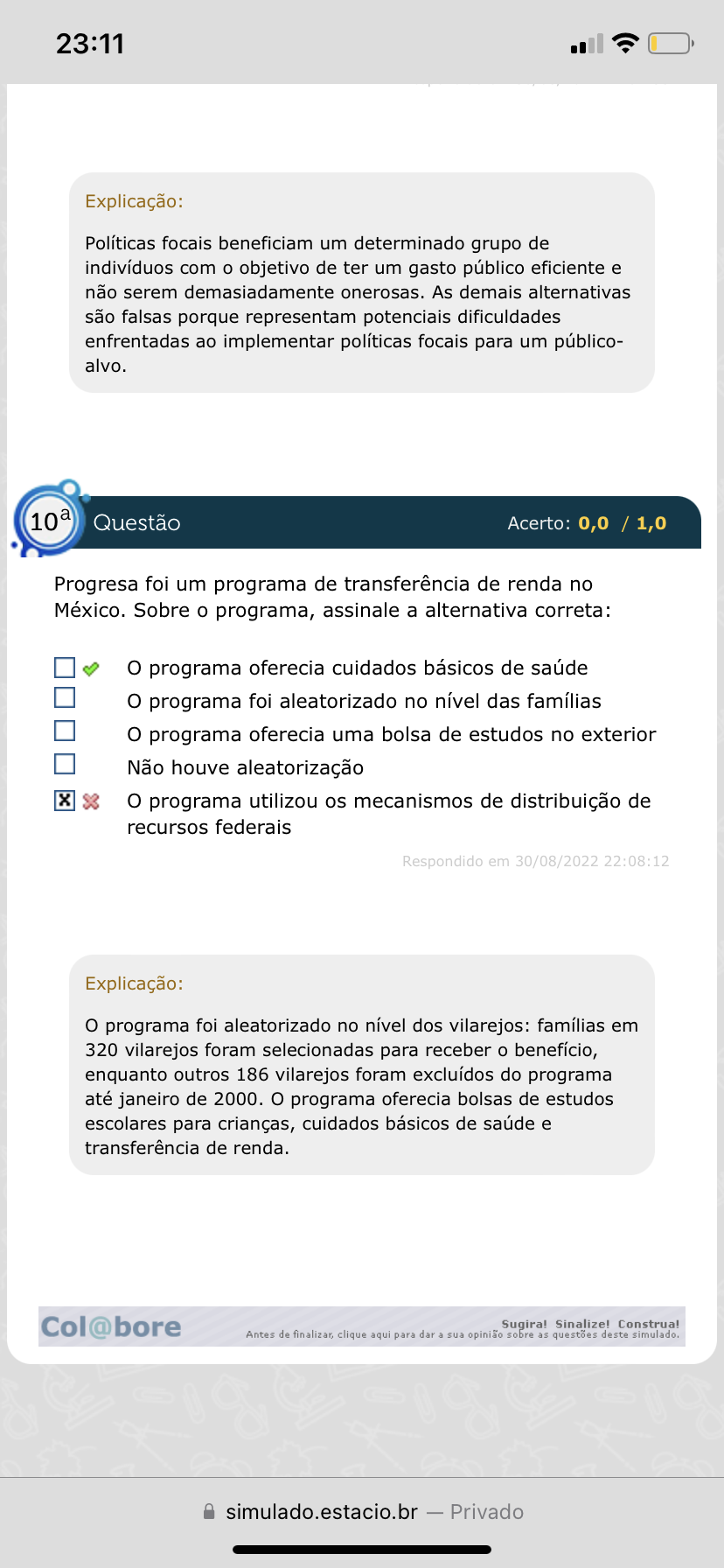 Políticas focais beneficiam um determinado grupo de indivíduos com o objetivo de ter um gasto público eficiente e não serem demasiadamente onerosas. As demais alternativas são falsas porque representam potenciais dificuldades enfrentadas ao implementar políticas focais para um público-alvo. Sobre o programa Progresa, que foi um programa de transferência de renda no México, assinale a alternativa correta: programa oferecia cuidados básicos de saúde programa foi aleatorizado no nível das famílias programa oferecia uma bolsa de estudos no exterior Não houve aleatorização O programa utilizou os mecanismos de distribuição de recursos federais
