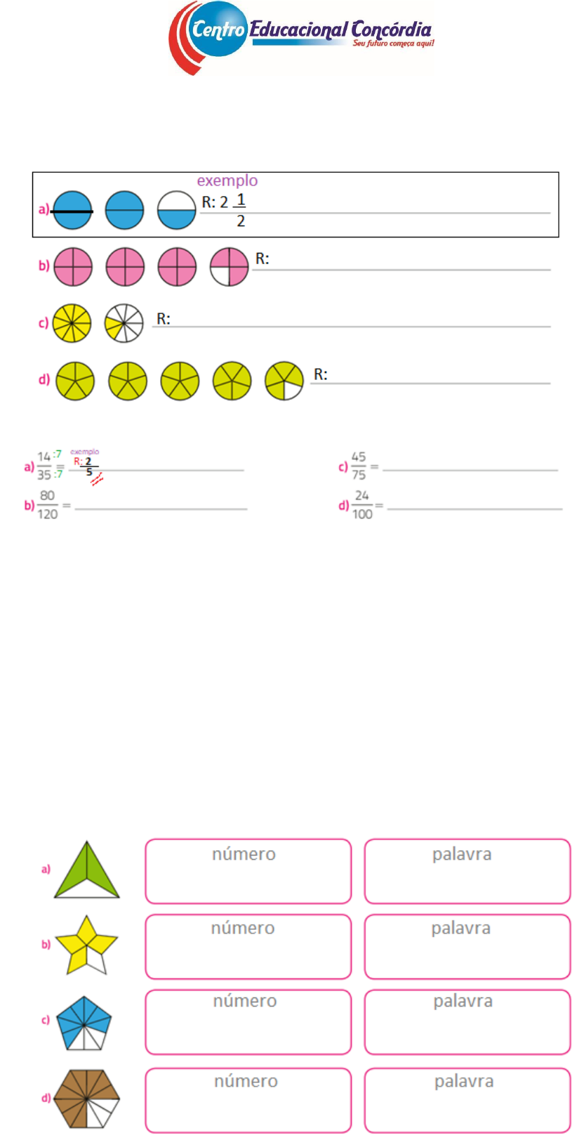 MATEMÁTICA – 6º B ALUNO(A): __________________________________________________________________ 1) (EF06MA07 - EF06MA15) Observe as figuras a seguir, escreva a forma mista que elas representam e transforme-as em fração imprópria. 2) (EF06MA07) Simplifique as frações até chegar na Fração Irredutível: 3) (EF06MA15) Juliana comprou um pacote de cookies. Pela manhã, ela comeu 1/5 dos cookies; à tarde, mais 1/3 deles. Que fração representa os cookies que ela comeu? 4) (EF06MA15) Antônio comprou 5 quilogramas de carne e dividiu essa quantidade em pacotes de 1/2 quilogramas cada um. Quantos pacotes foram feitos? 5) (EF05MA03) Complete a tabela a seguir escrevendo, com números e palavras, a fração representada pela parte colorida de cada imagem.