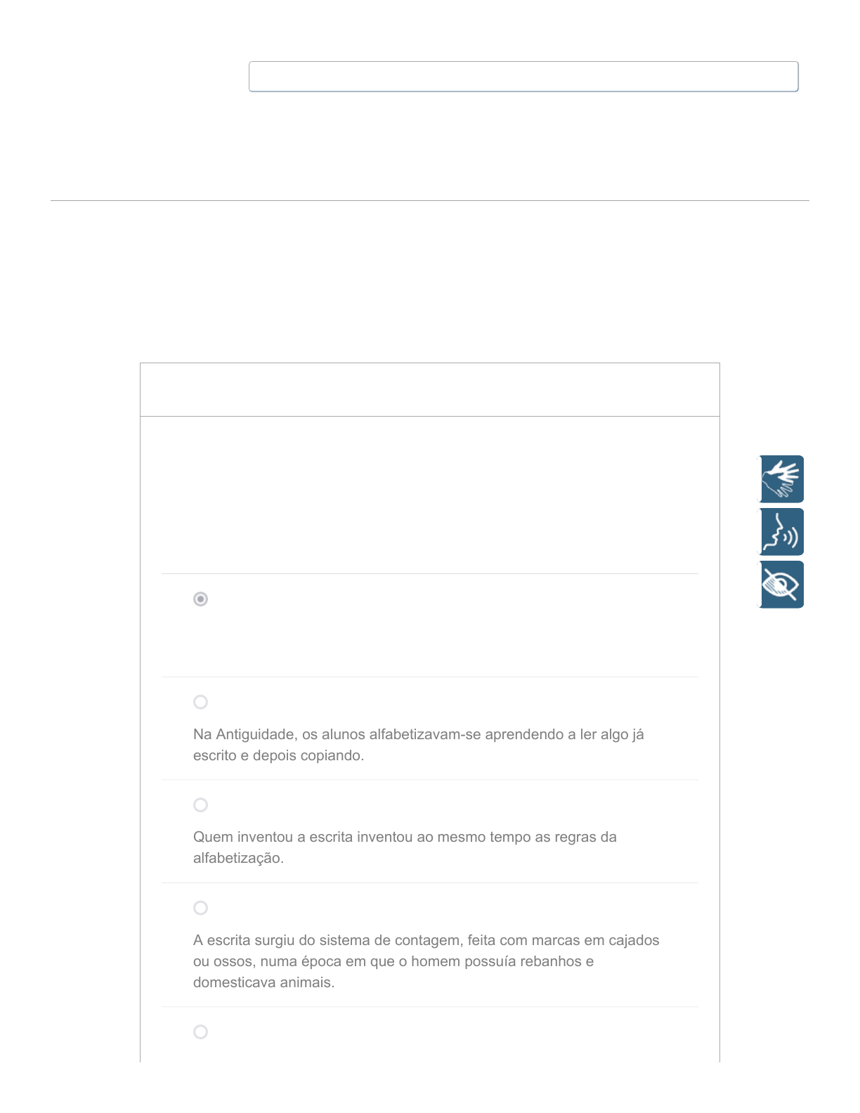 Seu Progresso: 100 % Prova Eletrônica Resultados para SILVIA FERREIRA ROSA As respostas corretas estarão disponíveis em 25 set em 0:00. Pontuação desta tentativa: 27 de 30 Enviado 6 set em 15:19 Esta tentativa levou 14 minutos. 3 / 3 ptsPergunta 1 De acordo com a história da alfabetização, descrita no capítulo 1, do livro alfabetizando sem o bá, bé, bi, bó, bu, de Luiz Carlos Cagliari, é incorreto afirmar que: Os sistemas de escrita foram privilégios dos reis, sacerdotes e pessoas de grande poder, durante a Antiguidade. Na Antiguidade, os alunos alfabetizavam-se aprendendo a ler algo já escrito e depois copiando. Quem inventou a escrita inventou ao mesmo tempo as regras da alfabetização. A escrita surgiu do sistema de contagem, feita com marcas em cajados ou ossos, numa época em que o homem possuía rebanhos e domesticava animais. SILVIA FERREIRA ROSA, histórico de teste: Prova Eletrônica https://dombosco.instructure.com/courses/10793/quizzes/27218/history... 1 of 8 06/09/2022 15:42 A escrita é compreendida como um fato social, uma convenção. Não sobreviveria se fosse domínio de poucos. 3 / 3 ptsPergunta 2 O exemplo acima refere-se a qual hipótese de escrita? Hipótese silábico-alfabética. Hipótese icônica. Hipótese alfabética. Hipótese silábica. Hipótese pré-silábica. 3 / 3 ptsPergunta 3 Emilia Ferreiro e Ana Teberosky pesquisaram a psicogênese da língua escrita. Sobre essa pesquisa, é incorreto afirmar que: SILVIA FERREIRA ROSA, histórico de teste: Prova Eletrônica https://dombosco.instructure.com/courses/10793/quizzes/27218/history... 2 of 8 06/09/2022 15:42 Explica a produção de escrita como uma aplicação sucessiva dos esquemas de assimilação. Acredita que a aprendizagem da leitura e escrita inicia muito antes do ingresso na escola. Investiga a gênese psicológica da compreensão da língua escrita na criança. Propõe a observação da conduta espontânea no registro gráfico dos alunos. Propõe uma metodologia na qual as cartilhas têm função de sistematizar a escrita das crianças. 0 / 3 ptsPergunta 4IncorretaIncorreta Ao propor uma prática de sala de aula que pudesse desenvolver a criticidade dos alunos, Paulo Freire condenava o ensino oferecido pela ampla maioria das escolas, que ele qualificou de: Escolarização Invasiva. Educação Política. Educação Bancária. Educação Alienadora. SILVIA FERREIRA ROSA, histórico de teste: Prova Eletrônica https://dombosco.instructure.com/courses/10793/quizzes/27218/history... 3 of 8 06/09/2022 15:42 Escolarização Crítica. 3 / 3 ptsPergunta 5 Sobre as concepções de ensino e aprendizagem, descritas na unidade 1, do livro Alfabetização e letramento, de Mirian Criez, é incorreto afirmar que: Um dos representantes do Construtivismo é Jean Piaget. Essa linha de pensamento acredita que a aprendizagem ocorre através dos processos de assimilação e acomodação, desenvolvidos na interação do sujeito com o objeto. Um dos representantes do Inatismo é Aristóteles. Essa linha de pensamento acredita que a pessoa já nasce com aptidões e habilidades. O desenvolvimento da criança é comparado ao crescimento de uma planta. Um dos representantes do Inatismo é Platão. Essa linha de pensamento acredita que a pessoa já nasce com aptidões e habilidades. O desenvolvimento da criança é comparado ao crescimento de uma planta. O Construtivismo acredita que o sujeito precisa ser desafiado para aprender. Um dos representantes do Empirismo é Aristóteles. Essa linha de pensamento acredita que a pessoa necessita de experiências para se desenvolver. O papel do aluno se restringe a receptor do conhecimento acabado. SILVIA FERREIRA ROSA, histórico de teste: Prova Eletrônica https://dombosco.instructure.com/courses/10793/quizzes/27218/history... 4 of 8 06/09/2022 15:42 3 / 3 ptsPergunta 6 O exemplo acima refere-se a qual hipótese de escrita? Hipótese icônica. Hipótese silábico-alfabética. Hipótese pré-silábica. Hipótese alfabética. Hipótese silábica. 3 / 3 ptsPergunta 7 SILVIA FERREIRA ROSA, histórico de teste: Prova Eletrônica https://dombosco.instructure.com/courses/10793/quizzes/27218/history... 5 of 8 06/09/2022 15:42 Na pesquisa, sobre a psicogênese da língua escrita, apresentada no capítulo “Alfabetização e construtivismo - compreensão dos processos de aprendizagem”, do livro Construtivismo: de Piaget a Emília Ferreiro, de Maria da Graça Azenha, são abordados os seguintes temas: ( I ) A hipótese da quantidade mínima e letras. ( II ) A hipótese de variedade de caracteres. ( III ) A diferenciação de elementos gráficos. ( IV ) O Conhecimento das letras e sinais de pontuação. (V ) A orientação espacial da leitura. I, IV e V. IV e V. I, II, III, IV e V. II, III e IV. I e IV. 3 / 3 ptsPergunta 8 Podemos citar como representantes das primeiras obras de alfabetização na Europa, entre os séculos XV e XVIII: Jan Hus, São João Batista de La Salle, Robert Owen e Jean Piaget. Jean Piaget, São João Batista de La Salle, Froebel e Robert Owen. SILVIA FERREIRA ROSA, histórico de teste: Prova Eletrônica https://dombosco.instructure.com/courses/10793/quizzes/27218/history... 6 of 8 06/09/2022 15:42 Jan Hus, São João Batista de La Salle, Froebel e Robert Owen. Jan Hus, Jean Piaget, Froebel e Comênius. Robert Owen, Comênius, Froebel e Jean Piaget. 3 / 3 ptsPergunta 9 Paulo Freire defendia que o objetivo da escola deve ser ensinar o aluno a "ler o mundo", para poder transformá-lo. Nesse sentido, é correto afirmar que, segundo Paulo Freire, a educação deve priorizar a: Competição social. Transformação econômica. Conscientização dos alunos. Educação Bancária. Educação tradicional. 3 / 3 ptsPergunta 10 De acordo com a linha de pensamento construtivista, descrita na unidade 1, do livro Alfabetização e letramento, de Mirian Criez, o professor é um mediador da aprendizagem que está sendo SILVIA FERREIRA ROSA, histórico de teste: Prova Eletr