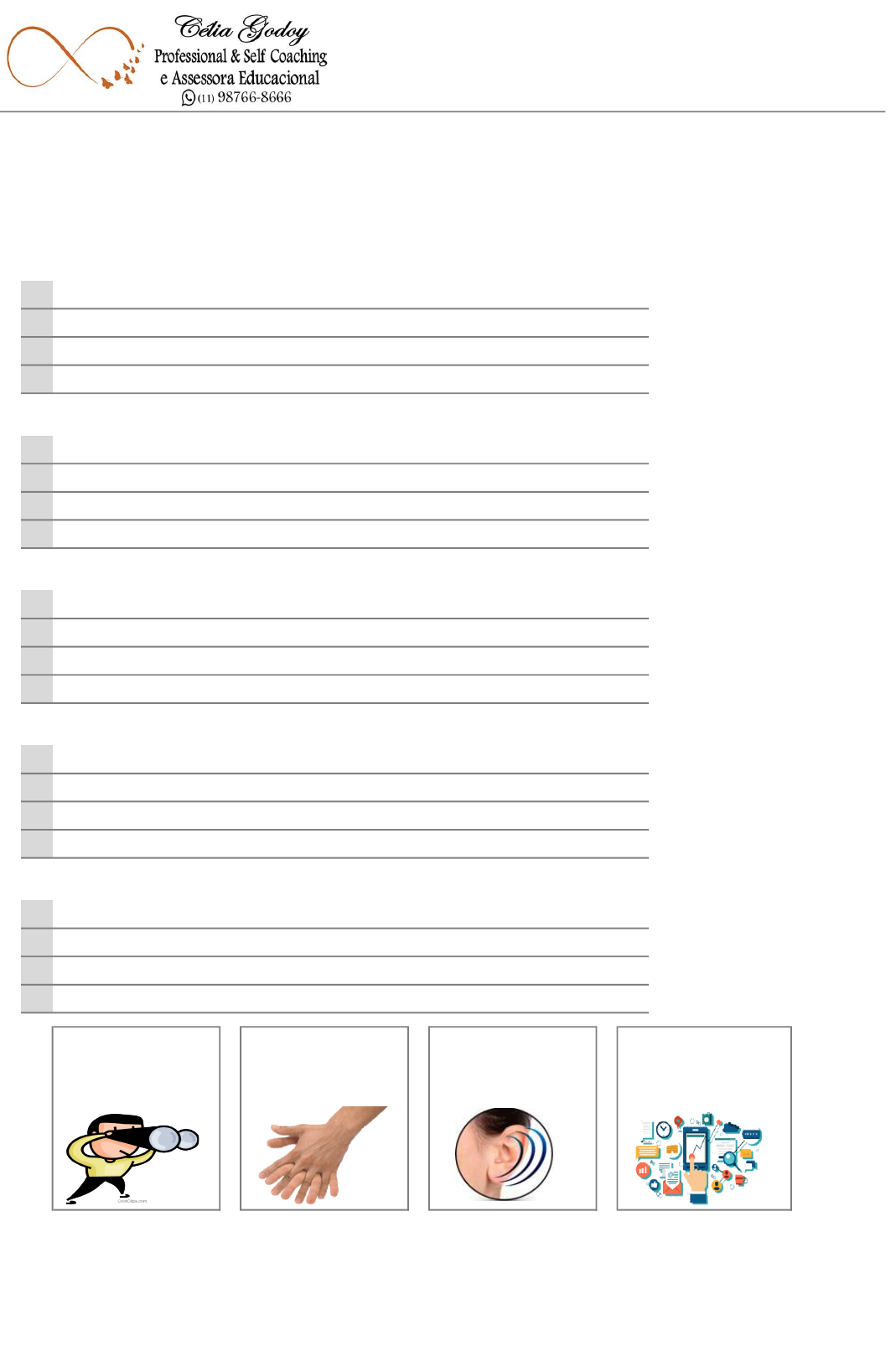 0 0% Para que você possa entender mais detalhadamente sobre o resultado do seu teste, fale com seu Coach. Uma forma de ajudar a você detalhadamente são as páginas ao lado que contem maiores informações sobre cada tipo de sistema representacional. CINESTÉSICO 0% AUDITIVO 0% DIGITAL 0% VISUAL Se sou muito capaz de raciocinar com fatos e dados novos Eu sou muito sensível a maneira como a roupa veste o meu corpo Se estou muito em sintonia com os sons do ambiente Escolher os móveis confortáveis Escolher a combinação de cores mais ricas e atraentes Pelo o tom da minha voz É muito fácil para mim: Achar o volume e a sintonia ideais em um sistema de som Selecionar o ponto mais relevante relativo a um assunto interessante Eu comunico mais facilmente o que se passa comigo: No modo como me visto e me aparento Pelos sentimentos que compartilho Pelas palavras que escolho Eu me percebo assim 3 A próxima melhor descrição. 2 A próxima melhor. 1 A que menos te descreve. Eu respondo fortemente às cores e à aparência de uma sala Eu tomo decisões importantes baseado em: Intuição O que me soa melhor O que me parece melhor Um estudo preciso e minucioso do assunto Durante um discussão eu sou mais influenciado por: Tom de voz da outra pessoa Se eu posso ou não ver o argumento da outra pessoa A lógica do argumento da outra pessoa Se eu entro em contato ou não com os sentimentos reais do outro TESTE: SISTEMAS REPRESENTACIONAIS Classifique as questões abaixo de 4 a 1, considerando: 4 A que melhor descreve você. Comportamento Faz uso da visão como meio de obter/reter informações. Pontos fortes Percebe coisas impares e que quase ninguém percebe no ambiente. Como você aprende? Vendo, sendo capaz de fazer uma imagem imediata do que está recebendo como informação. O que distrai sua atenção? Estímulos visuais em demasia ou conflitantes. Grande numero de informações recebidas. Procedimento de informação Tende a devanear quando está pensando. Pensa em ritmo rápido. Como você interage com o ambiente Verifica sempre o que está acontecendo ao seu redor. Estilos de organização A percepção é global, percebe o todo e, se necessário, decompõe em partes a percepção inicial. Geral Percebem as coisas como imagens e podem passar de um tema a outro facilmente. São capazes de fazer generalizações rapidamente inclusive partindo de uma informação escassa.Para as pessoas visuais, o mais importante é o “conceito geral” e podem se aborrecer com as explicações detalhadas. Seu ponto é organizar as coisas já que visualizam o conceito geral rapidamente. As pessoas visuais gesticulam quando falam rápido e de maneira confusa já que tendem a seguir imagens interiores sem dar-se conta de que os outros não vêem essa mesma imagem. Respondem brevemente as perguntas.As pessoas visuais tem memória fotográfica e freqüentemente custam a repetir instruções orais. Preferem ler por elas mesmas que escutar a outra pessoa que as lê.As pessoas visuais podem ter problemas para debater e são um público impaciente. Gostam de escrever notas ou desenhar. As pessoas visuais se fixam no aspecto e valorizam o esmero, nem tanto a voz, a qual não prestam atenção. Exemplos de frases visuais “Você consegue vislumbrar essa possibilidade comigo?” “ Eu não consigo me ver realizando essa tarefa” “É preciso enxergar além do óbvio” “O sujeito é brilhante” “Ele é iluminado” TESTE: SISTEMAS REPRESENTACIONAIS VISUAL CINESTÉSICO Comportamento Abraçar, dançar, sentir as pessoas, sentir seu próprio corpo. Pontos fortes Habilidade para usar a coordenação motora grossa ou fina em esportes, artes cênicas ou plásticas, no controle dos movimentos do corpo e na manipulação de objetos com destreza. Como você aprende? Fazendo ou executando, sendo capaz de guiar-se pela experiência motora. O que distrai sua atenção? Estímulos conflitantes visuais e/ou auditivos. Ser impedido de mover-se ou de fazer algo. Processamento de informação Pessoas que tendem a olhar para baixo quando estão pensando. Seus pensamentos ocorrem em um ritmo mais lento. Como você interage com o ambiente Mais focalizado em si, bastante consciente do clima que o circunda. Não parece consciente da atividade visual. Estilos de organização Organização gradual, criativa e divergente. Não há modelos definidos e estatísticos para aprendizagem. Chega a conclusões diferentes da maioria. Geral Percebem coisas através do corpo e da experimentação. São muito intuitivas e valorizam especialmente o ambiente e a participação. Para pensar com clareza necessitam de movimento e atividade. Não concedem importância a ordem das coisas. As pessoas cinestésicas se mostram relaxadas ao falar, se movem e gesticulam. Falam devagar e sabem como utilizar as pausas. Como público, são impacientes porque preferem passar a ação. As pessoas cinestésicas preferem atividades e movimento e prestam atenção ao desenvolvimento dessas. Do mesmo modo, requerem seu tempo para analisar o que sentem fazendo as coisas. As pessoas cinestésicas gostam de tocar e aproximar-se de outros. Percebem facilmente o ambiente e o mobiliário incômodo assim como o frio e o calor. Ao falar, pessoas cinestésicas não mantêm um grande contato visual com o outros. Para descrever o que têm feito se concentram na ação. Aprendem melhor fazendo as coisas e recordando a sensação e a ação.Aprendem melhor fazendo as coisas e recordando a sensação e a ação. Ocasionalmente, caminham e gesticulam para recordar as coisas. Exemplo de frases cinestésicas “Isso que você me diz me proporciona uma sensação muito boa” “Você pode sentir o resultado dessa ação?” “Sinto que esse negócio está cheirando bem” “Gosto de abraçar causas que me dêem o prazer de fazer o bem” TESTE: SISTEMAS REPRESENTACIONAIS AUDITIVO Comportamento Vale-se da audição para absorver informações . Pontos fortes Gosta de ouvir pessoas