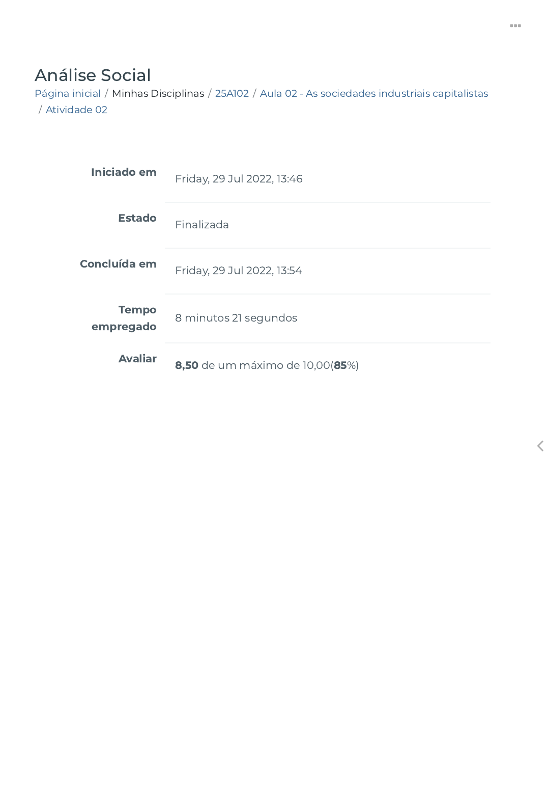 Página inicial / Minhas Disciplinas / 25A102 / Aula 02 - As sociedades industriais capitalistas / Atividade 02 Análise Social Iniciado em Friday, 29 Jul 2022, 13:46 Estado Finalizada Concluída em Friday, 29 Jul 2022, 13:54 Tempo empregado 8 minutos 21 segundos Avaliar 8,50 de um máximo de 10,00(85%) https://ava.politecnicabr.com.br/ https://ava.politecnicabr.com.br/course/view.php?id=985 https://ava.politecnicabr.com.br/course/view.php?id=985#section-3 https://ava.politecnicabr.com.br/mod/quiz/view.php?id=26965 https://ava.politecnicabr.com.br/ Questão 1 Correto Atingiu 2,00 de 2,00 Para Weber (1980, p. 123), a vida social só é possível porque existe uma consciência coletiva, ou seja, um conjunto de crenças e sentimentos comuns ao comum dos membros de uma determinada sociedade que forma um sistema determinado com vida própria. Ou ainda: ( ) [...] a sociedade não é simples soma de indivíduos, e sim sistema formado pela sua associação, que representa uma realidade especí�ca com seus caracteres próprios. Sem dúvida, nada se pode produzir de coletivo se consciências particulares não existirem; mas esta condição necessária não é su�ciente. É preciso ainda que as consciências estejam associadas, combinadas, e combinadas de determinada maneira; é desta combinação que resulta a vida social, e, por conseguinte, é esta combinação que a explica. Escolha uma opção: Verdadeiro Falso https://ava.politecnicabr.com.br/ Questão 2 Correto Atingiu 1,50 de 1,50 Os princípios norteadores das relações sociais e da organização das diferentes dimensões da vida social, de�nidores das especi�cidades das sociedades industriais capitalistas, podem ser assim apresentados: Escolha uma opção: a. trabalho livre, decorrente do primeiro artigo da Declaração dos Direitos do Homem e do Cidadão, segundo o qual todos os homens nascem livres e iguais perante a lei, condição necessária para a existência do mercado livre de trabalho e para a transformação da força de trabalho em mercadoria, isto é, trabalho assalariado. b. divisão racional do trabalho, cujo critério único é a competência pro�ssional, a capacitação técnica dos trabalhadores; e divisão tecnológica do trabalho no interior das empresas. c. todas as alternativas corretas. d. técnica racional para a mecanização/ automatização/ informatização da produção e da prestação de serviços, isto é, industrialização, para a produção em larga escala de todas as mercadorias, característica das sociedades industriais. https://ava.politecnicabr.com.br/ Questão 3 Correto Atingiu 2,00 de 2,00 Para Durkheim: ( ) a característica principal das sociedades modernas é a divisão do trabalho social. Ao promover a interdependência das funções pro�ssionais especializadas, a divisão do trabalho social, cuja origem é o aumento da população, gera a solidariedade orgânica, isto é, um novo tipo de coesão ou integração social que nasce do reconhecimento coletivo da complementariedade das atividades individuais diferenciadas, assegurando a existência e o funcionamento da sociedade por assegurar a satisfação das necessidades individuais de um maior número de pessoas. Escolha uma opção: Verdadeiro Falso https://ava.politecnicabr.com.br/ Questão 4 Correto Atingiu 1,50 de 1,50 No Manifesto do Partido Comunista, de 1848, Marx e Engels (este colaborador de Marx) a�rmam que: Escolha uma opção: a. O trabalhador trabalha sob o controle do capitalista, a quem pertence seu trabalho. O capitalista cuida em que o trabalho se realize de maneira apropriada e em que se apliquem adequadamente os meios de produção, não se desperdiçando matéria-prima e poupando-se o instrumental de trabalho, de modo que só se gaste deles o que for imprescindível à execução do trabalho. b. todas as alternativas incorretas. c. A história de toda sociedade existente até hoje tem sido a história das lutas de classes. Homem livre e escravo, patrício e plebeu, senhor e servo, mestre de corporação e companheiro, numa palavra, o opressor e o oprimido permaneceram em constante oposição um ao outro, levada a efeito numa guerra ininterrupta, ora disfarçada, ora aberta, que terminou, cada vez, ou pela reconstituição revolucionária de toda a sociedade ou pela destruição das classes em con�ito. d. A classe que dispõe dos meios de produção material dispõe igualmente dos meios de produção intelectual, de tal modo que o pensamento daqueles a quem são recusados os meios de produção intelectual está submetido igualmente à classe dominante. e. [...] a sociedade não é simples soma de indivíduos, e sim sistema formado pela sua associação, que representa uma realidade especí�ca com seus caracteres próprios. Sem dúvida, nada se pode produzir de coletivo se consciências particulares não existirem; mas esta condição necessária não é su�ciente. https://ava.politecnicabr.com.br/ Questão 5 Correto Atingiu 1,50 de 1,50 A organização racional das empresas se expressa: Escolha uma opção: a. na utilização da mais moderna e so�sticada tecnologia, produto de pesquisa permanente, muitas vezes por elas mesmas �nanciada. b. todas as alternativas corretas. c. na divisão racional e tecnológica do trabalho, ou seja, na distribuição das tarefas segundo o critério único da competência pro�ssional, da capacitação técnica, de seus membros. d. na aplicação dos métodos e dos conhecimentos cientí�cos ao processo produtivo e de prestação de serviços. e. na existência de normas racionalmente elaboradas que regulamentam o comportamento de seus membros e a execução das tarefas. https://ava.politecnicabr.com.br/ Questão 6 Incorreto Atingiu 0,00 de 1,50 Para Max Weber, marque (V) Verdadeiro ou (F) Falso: ( ) “O capitalismo existe onde quer que se realize a satisfação de necessidades de um grupo humano, com caráter lucrativo e por meio de empresas, qualquer que seja a nece