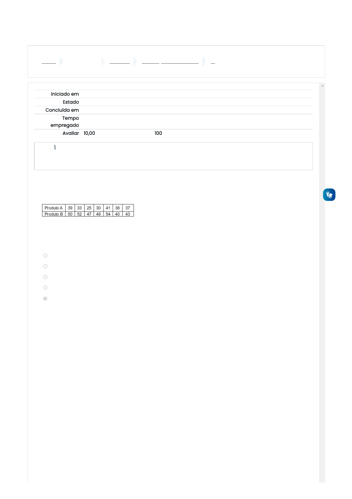 08/09/2022 21:17 T1: Revisão da tentativa https://ead.universo.edu.br/mod/quiz/review.php?attempt=1613510&cmid=412652 1/8 Painel Meus cursos N0043N1 AVALIAÇÃO A DISTÂNCIA T1 Iniciado em quinta, 8 set 2022, 21:10 Estado Finalizada Concluída em quinta, 8 set 2022, 21:17 Tempo empregado 7 minutos 27 segundos Avaliar 10,00 de um máximo de 10,00(100%) Questão 1 Correto Atingiu 1,00 de 1,00 Em uma determinada semana uma empresa recebeu as seguintes quantidades de pedidos para os produtos A e B: Assinale a opção que apresente os coeficientes de variação dos dois produtos: Escolha uma opção: a. CVA = 15,1% e CVB = 10,3% b. CVA = 16,1% e CVB = 12,3% c. CVA = 16,1% e CVB = 15,1% d. CVA = 15,1% e CVB = 12,3% e. CVA = 16,1% e CVB = 10,3% Sua resposta está correta. A resposta correta é: CVA = 16,1% e CVB = 10,3% https://ead.universo.edu.br/my/ https://ead.universo.edu.br/course/view.php?id=3108 https://ead.universo.edu.br/course/view.php?id=3108#section-7 https://ead.universo.edu.br/mod/quiz/view.php?id=412652 08/09/2022 21:17 T1: Revisão da tentativa https://ead.universo.edu.br/mod/quiz/review.php?attempt=1613510&cmid=412652 2/8 Questão 2 Correto Atingiu 1,00 de 1,00 Questão 3 Correto Atingiu 1,00 de 1,00 O conjunto de todos os elementos que possui uma característica de interesse é chamado de: a. Séries temporais b. Variável qualitativa c. População d. Variável quantitativa e. Amostra Sua resposta está correta. A resposta correta é: População A distância entre os pontos A (-2, y) e B (6, 7) é 10. O valor de y é: a. 1 ou 13 b. -1 c. 0 d. -1 ou 10 e. 2 ou 12 Sua resposta está correta. A resposta correta é: 1 ou 13 08/09/2022 21:17 T1: Revisão da tentativa https://ead.universo.edu.br/mod/quiz/review.php?attempt=1613510&cmid=412652 3/8 Questão 4 Correto Atingiu 1,00 de 1,00 Questão 5 Correto Atingiu 1,00 de 1,00 Considerando as medidas de posição e as medidas de dispersão usadas na estatística, relacione adequadamente as colunas a seguir. 1, 2, 2, 1, 2. a. 1, 1, 1, 2, 2 b. 1, 1, 2, 1, 2. c. 1, 2, 2, 1, 2. d. 2, 1, 1, 2, 1 e. 2, 2, 1, 2, 1 Sua resposta está correta. A resposta correta é: 2, 1, 1, 2, 1 A razão entre o peso de uma pessoa na Terra e o seu peso em Netuno é 5/7. Dessa forma, o peso de uma pessoa que na terra pesa 60 kg, em Netuno, está no intervalo a. [80 kg; 85 kg] b. [40 kg; 45 kg] c. ]75 kg; 80 kg[ d. [55 kg; 60 kg] e. ]45 kg; 50 kg] Sua resposta está correta. A resposta correta é: [80 kg; 85 kg] https://ead.universo.edu.br/mod/url/view.php?id=122539 08/09/2022 21:17 T1: Revisão da tentativa https://ead.universo.edu.br/mod/quiz/review.php?attempt=1613510&cmid=412652 4/8 Questão 6 Correto Atingiu 1,00 de 1,00 Um banco cobrou R$ 360,00 por seis meses de atraso em uma dívida de R$ 600,00. Qual a taxa de juros mensal cobrada por esse banco, calculada a juros simples? a. 20% b. 12% c. 10% d. 8% e. 15% Sua resposta está correta. A resposta correta é: 10% 08/09/2022 21:17 T1: Revisão da tentativa https://ead.universo.edu.br/mod/quiz/review.php?attempt=1613510&cmid=412652 5/8 Questão 7 Correto Atingiu 1,00 de 1,00 Com base nas informações que constam no gráfico abaixo, responda: Qual foi o aumento percentual da população brasileira nos últimos 10 anos? a. 30,09% b. 89,00%. c. 12,89% d. 98,72% e. 22,89%. Sua resposta está correta. A resposta correta é: 12,89% 08/09/2022 21:17 T1: Revisão da tentativa https://ead.universo.edu.br/mod/quiz/review.php?attempt=1613510&cmid=412652 6/8 Questão 8 Correto Atingiu 1,00 de 1,00 A tabela mostra o número de funcionários de uma empresa presentes ao trabalho durante os cinco dias de uma semana. Na 5ª feira não houve faltas. A média diária de faltas de funcionários, nessa semana, foi, aproximadamente: a. 30 b. 18 c. 12 d. 20 e. 26 Sua resposta está correta. A resposta correta é: 26 08/09/2022 21:17 T1: Revisão da tentativa https://ead.universo.edu.br/mod/quiz/review.php?attempt=1613510&cmid=412652 7/8 Questão 9 Correto Atingiu 1,00 de 1,00 Questão 10 Correto Atingiu 1,00 de 1,00 Maria quer comprar uma TV que está sendo vendida por R$ 1500,00 à vista ou em 3 parcelas mensais sem juros de R$ 500,00. O dinheiro que Maria reservou para essa compra não é suficiente para pagar à vista, mas descobriu que o banco oferece uma aplicação financeira que rende 1% ao mês. Após fazer os cálculos, Maria concluiu que, se pagar a primeira parcela e, no mesmo dia, aplicar a quantia restante, conseguirá pagar as duas parcelas que faltam sem ter que colocar nem tirar um centavo sequer. Quanto Maria reservou para essa compra, em reais? a. 1485,20 b. 1480,20 c. 1450,20 d. 1495,20 e. 1490,20 Sua resposta está correta. A resposta correta é: 1485,20 Na análise descritiva de um conjunto de dados, a. a mediana é sempre diferente da média b. o desvio padrão corresponde ao quadrado da variância c. se existem valores diferentes uns dos outros em um conjunto de dados, sempre teremos valores abaixo e acima da média d. a média corresponde sempre ao valor que divide os dados ordenados ao meio. e. o desvio padrão representa uma medida de tendência central Sua resposta está correta. A resposta correta é: se existem valores diferentes uns dos outros em um conjunto de dados, sempre teremos valores abaixo e acima da média Atividade anterior ◄ SLIDES Seguir para... Próxima atividade CIET_AULA_INAUGURAL_1_2SEM2022 ► https://ead.universo.edu.br/mod/folder/view.php?id=413160&forceview=1 https://ead.universo.edu.br/mod/url/view.php?id=406473&forceview=1 08/09/2022 21:17 T1: Revisão da tentativa https://ead.universo.edu.br/mod/quiz/review.php?attempt=1613510&cmid=412652 8/8