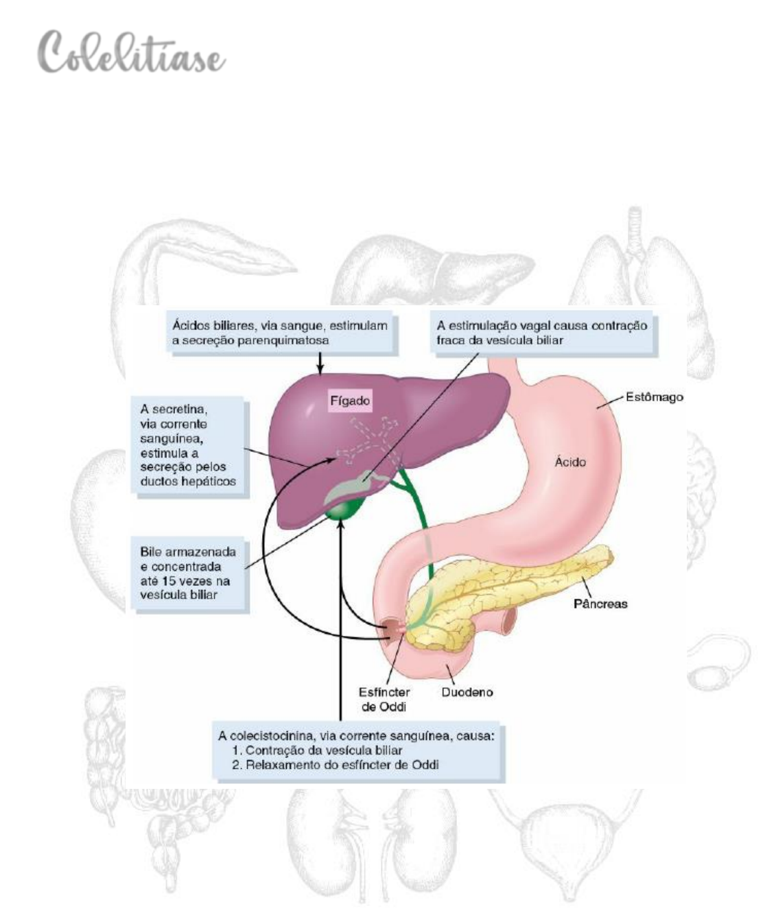 1 Khilver Doanne Sousa Soares Colelitíase Fígado e Vesícula Biliar O fígado é o responsável pela produção da bile e secreta cerca de 600 a 1000 ml/dia. A bile serve a duas funções importantes: I. Tem papel importante na digestão e na absorção de gorduras, não por realizar a digestão de gorduras, mas porque os ácidos biliares realizam duas funções: (1) ajudam a emulsificar as grandes partículas de gordura nos alimentos, a muitas partículas diminutas, cujas superfícies são atacadas pelas lipases secretadas no suco pancreático; e (2) ajudam a absorção dos produtos finais da digestão das gorduras através da membrana mucosa intestinal; II. Serve como meio de excreção de diversos produtos do sangue como a bilirrubina, um produto da degradação de hemácias. Fonte: GUYTON, A.C.; HALL, J.E. Tratado de Fisiologia Médica. 13. ed. Rio de Janeiro: Elsevier, 2017. A bile é secretada pelas células principais do fígado (hepatócitos) – nessa secreção inicial há grande quantidade de ácidos biliares, colesterol e outros constituintes orgânicos essa solução é secretada para canalículos biliares (originam-se entre as células hepáticas). Após esses processos, a bile flui pelos canalículos em direção aos septos interlobulares para desembocar nos ductos biliares terminais, fluindo, então, para ductos progressivamente maiores e chegando finalmente ao ducto hepático e ao ducto biliar comum. A partir desses ductos, a bile flui diretamente para o duodeno OU é armazenada por minutos ou horas na vesícula biliar, onde chega pelo ducto cístico. Nesse caminho a segunda porção da secreção hepática (solução aquosa de íons sódio e bicarbonato) é acrescentada à bile inicial, aumentando a quantidade total da bile em até 100% ou mais – essa segunda secreção é estimulada pela secretina, que estimula a secreção de íons bicarbonato para suplementar a 2 Khilver Doanne Sousa Soares secreção pancreática e neutralizar o ácido que vem do estômago em direção ao duodeno. A bile é produzida continuamente pelas células hepáticas e armazenada na vesícula biliar até ser secretada pelo duodeno. O volume máximo que a vesícula biliar consegue armazenar é de apenas 30 a 60 mililitros. NO ENTANTO, até 450 mililitros de bile podem ser armazenados na vesícula já que água, sódio, cloreto e grande parte de outros eletrólitos menores é continuamente absorvida pela mucosa da mesma, concentrando ali sais biliares, colesterol, lecitina e bilirrubina. COMPOSIÇÃO DA BILE As substâncias mais abundantes, secretadas na bile, são os sais biliares, responsáveis por cerca da metade dos solutos na bile. Também secretados ou excretados em grandes concentrações são a bilirrubina, o colesterol, a lecitina e os eletrólitos usuais do plasma Quando o alimento começa a ser digerido no trato gastrointestinal superior, a vesícula biliar começa a se esvaziar, especialmente quando alimentos gordurosos chegam ao duodeno, cerca de 30 minutos depois da ingestão da refeição. O esvaziamento da vesícula biliar se dá por contrações rítmicas da parede da vesícula biliar, com o relaxamento simultâneo do esfíncter de Oddi, que controla a entrada do ducto biliar comum no duodeno. O estímulo mais potente para as contrações da vesícula biliar é o hormônio CCK (colecistocinina). O estímulo principal para a liberação de CCK no sangue pela mucosa duodenal é a presença de alimentos gordurosos no duodeno. O precursor dos sais biliares é o colesterol, presente na dieta ou sintetizado nas células hepáticas, durante o curso do metabolismo de gorduras. O colesterol é, primeiro, convertido em ácido cólico ou ácido quenodesoxicólico. Esses ácidos, por sua vez, se combinam em sua maior parte com glicina e, em menor escala, com taurina, para formar ácidos biliares glico e tauroconjugados. Os sais desses ácidos, especialmente os sais de sódio, são então secretados para a bile. Os sais biliares desempenham duas ações importantes: a. Ação detergente sobre as partículas de gordura dos alimentos. Isso diminui a tensão superficial das partículas, permitindo que a agitação no trato intestinal as quebre em partículas diminutas; b. Ajudam na absorção de: ácidos graxos, monoglicerídeos, colesterol e outros lipídios (micelas) que são semissolúveis no quimo. Assim os lipídios intestinais são “carregados” para a mucosa intestinal e absorvidos no sangue sem a presença dos sais biliares no intestino até 40% da gordura ingerida é perdida nas fezes e causa déficit metabólico. Secreção Hepática de Colesterol e Formação de Cálculos Biliares Os sais biliares são formados nas células hepáticas a partir do colesterol no plasma sanguíneo. No processo de secreção dos sais biliares, cerca de 1 a 2 gramas de colesterol são removidos do plasma sanguíneo e secretados na bile todos os dias. O colesterol é quase completamente insolúvel em água, mas os sais biliares e a lecitina na bile se combinam fisicamente com o colesterol, formando micelas ultramicroscópicas em solução coloidal. Quando a bile se concentra na vesícula biliar, os sais biliares e a lecitina se concentram de forma proporcional ao colesterol, o que mantém o colesterol em solução. Sob condições anormais, o colesterol pode se precipitar na vesícula biliar, resultando na formação de cálculos biliares de colesterol. A quantidade de colesterol na bile é determinada, em parte, pela quantidade de gorduras que a pessoa ingere. Por essa razão, pessoas que 3 Khilver Doanne Sousa Soares ingerem dieta rica em gorduras, durante período de anos, tendem a desenvolver cálculos biliares. Fonte: Site MSD manuais. Visão do Fígado e da Vesícula Biliar. Acesso em 01/05/2021. https://www.msdmanuals.com/pt/casa/doen%C3%A7as-hep%C3%A1ticas-e-da-ves%C3%ADcula- biliar/manifesta%C3%A7%C3%B5es-da-doen%C3%A7a-hep%C3%A1tica/colestase Fonte: GUYTON, A.C.; HALL, J.E. Tratado de Fisi