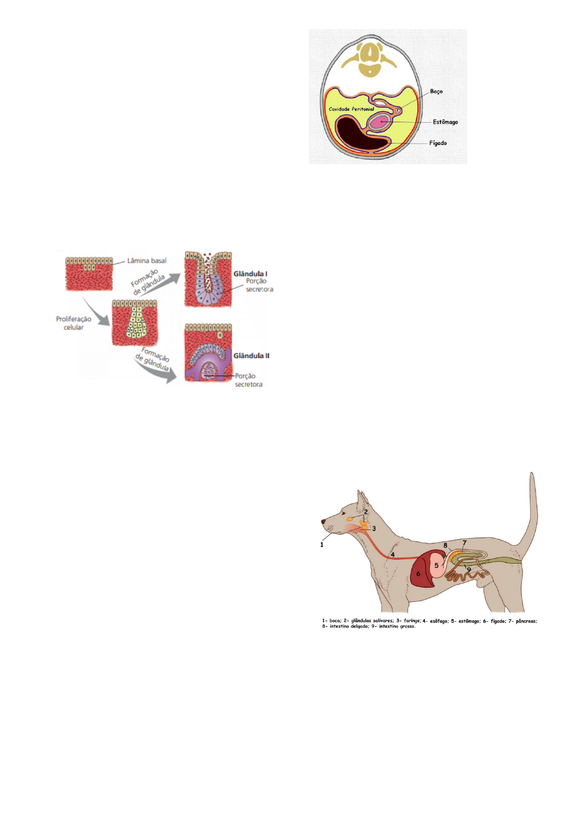 SISTEMA DIG�TÓRIO Conjunto de estruturas que estão direta ou indiretamente relacionadas à digestão dos alimentos. É o responsável por degradar o alimento em moléculas pequenas, que possam ser absorvidas pelas células e utilizadas para o desenvolvimento, manutenção do organismo e para as suas necessidades energéticas. COMPONENT�: ➔ Órgãos: estrutura formada por um ou mais tipos de tecidos, com forma definida e �nção específica. ➔ Glândulas: acúmulo de células epiteliais, que secretam algum tipo de substância. GLÂNDULAS: ➔ Endócrina: quando a substância secretada por ela (hormônio) é liberada diretamente na corrente sanguínea. Ex: hipófise, adrenal e tireóide. ➔ Exócrina: quando a substância secretada é liberada em um determinado local do organismo (através de ductos). Ex: lacrimais, salivares e mamárias. ➔ Endócrina: atuais das duas maneiras (endócrina e exócrina). Ex: fígado, pâncreas e testiculo. ABDÔMEN: ➔ Parte do tronco situada entre o tórax e a pelve. CAVIDADE ABDOMINAL: ➔ Separada da cavidade torácica pelo músculo diafragma e em ampla comunicação com a cavidade pélvica. ➔ Revestimento: peritônio (membrana serosa que reveste a cav. abd. e a maioria dos órgãos em seu interior. PERITÔNIO: ➔ Parietal: fica em contato com a parede da cav. abd. ➔ Visceral: em contato com as vísceras (órgãos) ➔ Cavidade peritoneal: espaço entre o peritônio parietal e visceral. (p. parietal e p. visceral) ➔ �truturas retroperitoneais: não estão revestidas por peritônio ou possuem um revestimento apenas parcial. FUNÇÕ� DO SIST. DIG�TÓRIO: ➔ Ingestão dos alimentos; ➔ Digestão; ➔ Absorção dos nutrientes; ➔ Metabolização (transformar os alimentos em moléculas pequenas); ➔ Egestão (eliminação). DIVISÃO: ➔ Boca; ➔ Faringe; ➔ Canal alimentar (esofago, estomago e intestino) ➔ �truturas acessórias (língua, dentes, glândulas salivares, fígado e pâncreas). TIPOS DE ALIMENTAÇÃO: ➔ Carnívoros: a base da alimentação é carne (de: cão); ➔ Herbívoros: a base são plantas (ex: boi); ➔ Onívoros: alimentação mista (ex: porco). ➔ BOCA ➔ Parte inicial do sistema digestório. ➔ Possui uma cavidade no seu interior, a cavidade bucal/ oral. FUNÇÕ�: ➔ Entrada do alimento no organismo; ➔ Umidificação do alimento pela saliva; ➔ Mastigação. DIVISÃO: ➔ Vestíbulo bucal; ➔ Cavidade bucal propriamente dita. ABERTURAS: ➔ Rima oral: mais rostralmente; ➔ Ádito da faringe: mais caudalmente. LÁBIOS ➔ Contornam a rima oral; ➔ Dividido em superior (maxilar) e inferior (mandibular); ➔ Comissura labial: onde o lábio superior se encontra com o lábio inferior (“canto da boca”). FUNÇÃO: ➔ Pr�eção; ➔ Captação dos alimentos; ➔ Ingestão de líquidos; ➔ Amamentação. �TRATIGRAFIA: ➔ Pele; ➔ Túnica muscular; ➔ Túnica mucosa; EM BOVINOS, A PELE DO LÁBIO SUPERIOR APR�ENTA O �PELHO NASAL (SEM PELOS E COM VÁRIOS SULCOS, QUE SÃO DIFERENT� PARA CADA BOVINO, "IMPR�SÃO DIGITAL”). OS CARNÍVOROS E PEQUENOS RUMINANT� APR�ENTAM UM R�QUÍCIO EMBRIONÁRIO, O FILTRUM. TÚNICA MUSCULAR: ➔ Músculo orbicular da boca. TÚNICA MUCOSA: ➔ Frênulo labial (prende o lábio a gengiva); BOCHECHAS ➔ Nas partes laterais da cavidade bucal; FUNÇÃO: ➔ Evitar o acúmulo de alimento no vestíbulo bucal. �TRATIGRAFIA: ➔ Pele; ➔ Túnica muscular; ➔ Túnica mucosa. TÚNICA MUCOSA: ➔ Papila par�ídea: elevação na túnica mucosa, ponto de abertura da glândula parótida. ➔ Papilas cônicas: em ruminantes, recobrindo quase toda a bochecha e servem como pr�eção (os ruminantes não mastigam muito bem os alimentos de início). PALATO DURO ➔ Na parte dorsal da cavidade bucal �TRATIGRAFIA: ➔ Base óssea; ➔ Corpo cavernoso (vasos sanguíneos); ➔ Túnica mucosa. TÚNICA MUCOSA: ➔ Rugas palatinas: espessamento para pr�eção. LÍNGUA ➔ Na parte ventral da cav. bucal. ➔ Ocupando o espaço mandibular. DIVISÃO: ➔ Raiz (fixada ao hióide); ➔ Corpo (central); ➔ Ápice (rostral). FUNÇÃO: ➔ Captura de alimento, captação de líquidos, auxilia na deglutição do alimento e gustação; ➔ Nem sempre: auxilia na vocalização, home�ermia (manter a temperatura corporal em carnívoros) e limpeza corporal (em felinos); �TRATIGRAFIA: ➔ Túnica mucosa: papilas linguais (mecânicas e gustativas). OBS: as papilas mecânicas em felinos é mais desenvolvida para a limpeza! ➔ Túnica muscular: músculos e�rínsecos (se originam fora da língua, como o estiloglosso, hioglosso e genioglosso, e servem para movimentar a língua) e intrínsecos (origem e inserção dentro da língua e alteram o formato da lingua). ➔ RUMINANT�: torus lingual (saliência na parte caudal da língua, participa da ruminação). ➔ CARNÍVOROS: sulco mediano (no chão, ao longo da parte dorsal da língua) e lissa (em cães e gatos, na parte ventral do ápice da língua). OBS: auxiliam na ingestão de líquidos! CAVIDADE BUCAL PARTE VENTRAL: ➔ Frênulo lingual; ➔ Prega sublingual; ➔ Carúncula sublingual. ➔ Músculo milohióideo e geniohioideo (fecham o espaço restante). DENT� Órgão duro, formado por tecido conjuntivo mineralizado, localizado no interior da cavidade bucal; Origina-se do ectoderma (porções modificadas do exoesqueleto); DISPOSIÇÃO: ➔ 2 arcadas dentárias: superior (maxilar e incisivo) e inferior (mandíbula); ARCADAS DENTÁRIAS: ➔ Podem apresentar variação em comprimento e em largura; ➔ A variação geralmente ocorre na arcada inferior; ➔ Largura: isognata (2 arcadas iguais) e anisognata (inferior é mais estreita); ➔ Comprimento: prognata (a arcada inferior é maior) e bragnata (arcada inferior é menor); DIVISÃO: ➔ Raiz (fixada no alvéolo pelo periodonto ou ligamento periodontal); ➔ Coroa (fora do alvéolo); ➔ Colo (região de transição da raiz para a coroa). �TRATIGRAFIA: ➔ �