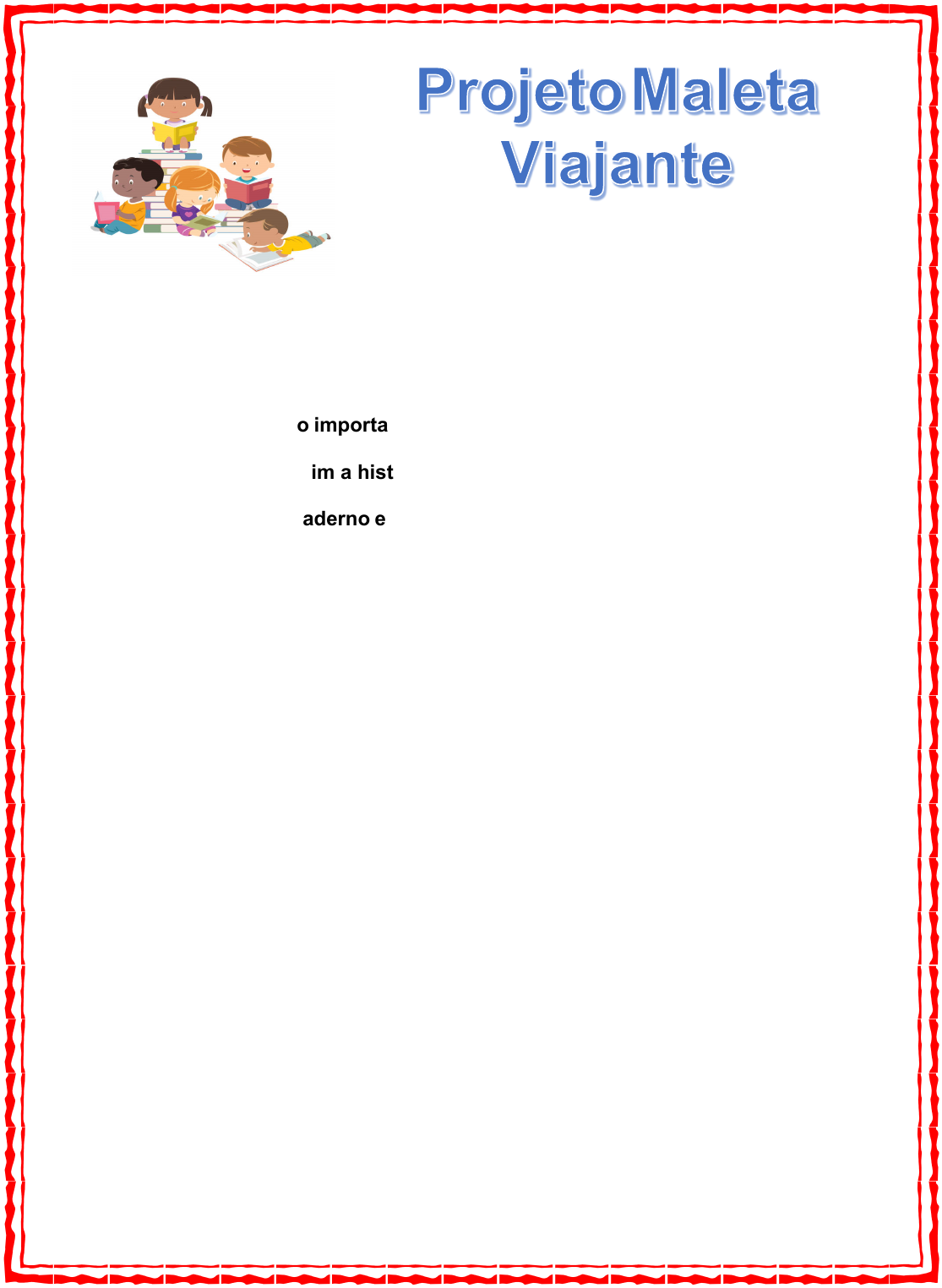 Papai, Mamãe e/ou Responsável É com muita alegria que nesta semana levo para casa a MALETA VIAJANTE. Este é um momento muito importante para mim e conto com vocês para me auxiliarem nesta tarefa, lendo para mim a história até que eu saiba conta-la sozinha (o). Dentro da pasta tem um caderno e giz de cera, para após a contação desenhar sozinha (o) o que ouvi e entendi. Em seguida, devemos pintar a carinha (smile) de acordo com o que achamos da história e da proposta. Sabe de uma coisa? Se vocês quiserem poderão escrever no caderno relatando como foi essa experiência. Na segunda-feira a maleta deverá voltar comigo para eu contar para as coleguinhas a história. Ah! Não podemos esquecer de tirar muitas fotos! Depois vamos mandar para o Whatsapp do CEI, assim, todos poderão ver o quanto nos divertimos e aprendemos neste fim de semana. Beijos, Sua criança amada.