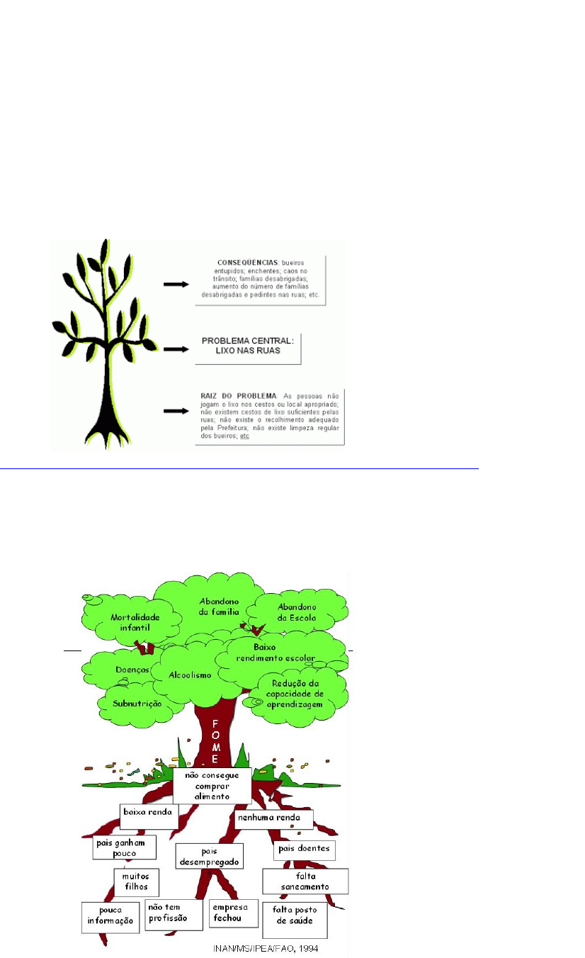 ÁRVORE DE PROBLEMAS Ferramenta utilizada para identificar o problema central (ou seja, aquela situação que queremos mudar); a raiz desse problema (porque o problema foi gerado?) e as consequências que ele acarreta. Quando a árvore de problemas é construída ( e para a sua construção tem que haver discussão sobre os pontos que serão colocados nela) fica mais fácil buscar soluções para o problema. O problema identificado será o tronco da minha árvore; a raiz será formada pelos fatores que geraram aquela situação/problema, e a copa da árvore as consequências. É um diagrama de causa e efeito. Veja dois exemplos de uma árvore de problema (fonte: http://www.instrucoesleonisticas.jor.br/leo/20070331palestra_leos.php) http://www.instrucoesleonisticas.jor.br/leo/20070331palestra_leos.php Passos a serem seguidos para a construção da Árvore de Problemas 1- Definição do tema central (saúde, educação, etc) 2- Definição do problema central relacionado a este tema – que problema queremos resolver? 3- Qual(is) a(s) raiz(es) deste problema (porque o problema surgiu? Quais as causas do problema?) 4- Quais as consequências deste problema para a população? A(s) raiz(es) do problema e a(s) consequências (copa da árvore)deve(m) ser escrita(s) em fichas de papel. A árvore deverá ser montada mostrando uma relação de causa e efeito entre o apresentado nas fichas. A partir desta identificação ficará mais fácil buscar soluções para o problema. Uma árvore de soluções poderá ser também construída e orientar o trabalho do grupo na solução do problema central identificado. É uma ou menos isso: o problema foi definido, são conhecidas as causas (raiz) deste problema e as consequências (copa) delas. A partir destas informações podemos construir uma outra árvore – Árvore de soluções. Esta atividade poderá ser realizada com seus alunos para resolver um problema geral da turma, um problema específico do bairro onde moram ou mesmo da escola. Para esta atividade você precisará de apenas de fichas de cartolina ou papel craft, e canetinhas hidrocor. A árvore poderá ser montada no chão, mas é interessante depois colar numa folha maior, e mantê-la por um período num local visível na sala de aula. Ela poderá servir como avaliação sobre o que tem sido feito para a solução do problema levantado e discutido pela turma. Durante a construção da árvore, é importante que a turma tenha um tempo suficiente (que dependerá de cada grupo) para discutir o que entrará na montagem da árvore. Após discussão pelo grupo a árvore gerada deverá ser validada por todo o grupo.