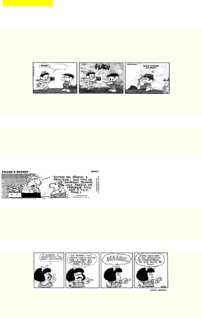 RECUPERAÇÃO DE LÍNGUA PORTUGUESA – Habilidade recuperação: (EF69LP03D) - Identificar crítica ou ironia/humor presente em tirinhas, memes, charges, por exemplo Enem/2000) Em uma conversa ou leitura de um texto, corre-se o risco de atribuir um significado inadequado a um termo ou expressão, e isso pode levar a certos resultados inesperados, como se vê nos quadrinhos abaixo. Nessa historinha, o efeito humorístico origina-se de uma situação criada pela fala da Rosinha, usando uma expressão popular, no primeiro quadrinho, que é: A) Faz uma pose bonita! B) Quer tirar um retrato? C) Sua barriga está aparecendo! D) Olha o passarinho! Observe o cartum e responda às questões 2 - (Enem/2005) e 3: 2 - A situação abordada no cartum torna explícita a contradição entre A) relações pessoais verdadeiras e o avanço tecnológico. B) inteligência empresarial e a ignorância dos cidadãos. C) inclusão digital e a modernização das empresas. D) revolução informática e a exclusão digital. 3- ( ENEM 2003) O humor presente na tirinha decorre principalmente do fato de a personagem Mafalda A) atribuir, no primeiro quadrinho, poder ilimitado ao dedo indicador. B) considerar seu dedo indicador tão importante quanto o dos patrões. C) atribuir, no primeiro e no último quadrinhos, um mesmo sentido ao vocábulo “indicador”.
