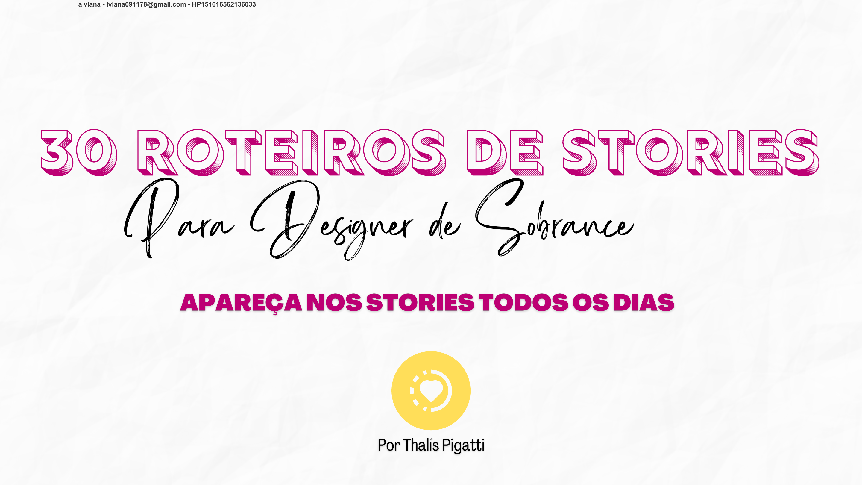 30 ROTEIROS DE STORIES Para Designer de Sobrancelhas Licensed to Luiza da Silva viana - lviana091178@gmail.com - HP151616562136033 Olá! Tudo bem ??? Me chamo Thalís Pigatti, e estou na área da beleza a mais de 8 anos. Eu já fui cabeleireira, maquiadora é designer de sobrancelhas. Tudo junto, acredita ? Com o passar dos anos fui vendo a necessidade de focar nos serviço que me dava mais prazer e escolhi pelas sobrancelhas. Hoje sou especialista em sobrancelhas, com a agenda preenchida de clientes de segunda a sexta feira, graças as redes sociais. Espero que faça bom uso desse material e que ele te traga resultados. Quero que saiba que ele foi pensado e feito com muito carinho . Caso precise de um HELP, pode ficar a vontade para me chamar nas minhas redes sociais . @thalíspigattisobrancelhas QUEM SOU EU ? CONFORME A LEI 9.610/98 , FICA PROIBIDA A REPRODUÇÃO TOTAL, PARCIAL, OU DIVULGAÇÃO COMERCIAL DESSE MATERIAL / EBOOK SEM AUTORIZAÇÃO PRÉVIA OU EXPRESSA DO AUTOR. ( ARTIGO 29 ) Licensed to Luiza da Silva viana - lviana091178@gmail.com - HP151616562136033 Os stories faz parte do seu negócio, gravar stories realmente irá te trazer resultado, e resultado com mais velocidade. Você deve enxergar gravar stories como parte do seu negócio. Assim, como faz parte do seu negócio, estudar, comprar seus materiais, executar seu atendimento a cliente … Seja sua maior fã, entenda a importância do seu trabalho para as pessoas que você atende, e sabendo disso você conseguirá evitar a procrastinação e botar a mão na massa para gravar seus stories. PORQUE EU DEVO FAZER STORIES ? Licensed to Luiza da Silva viana - lviana091178@gmail.com - HP151616562136033 EU AINDA NÃO TE CONVENCI GRAVAR STORIES?? Se você vê potencial em você e no seu negócio é suuuuuper necessário fazer stories. Com os stories você consegue conversar e criar conexão com quem te acompanha, muitas vezes mais diretamente do que o feed . Fazer stories faz com as pessoas tenham mais confiança em você e no seu serviço, faz com que você seja a designer de sobrancelhas escolhida, para cuidar das sobrancelhas da pessoa que está te acompanhando . OBS.: Estamos falando dos stories aqui, mas é super importante se fazer presente nos dois formatos, nos stories e no feed. Quer dizer que posso só gravar um boomerangue, tirar uma selfie, fotos do filhos, doguinho e está tudo certo ??? Não, não !!! Os stories devem ser estratégicos, as pessoas não vão comprar de você só porque te acham linda, seus filhos incrível é seu pet uma fofura. Elas iram comprar você, e o que você pode fazer por elas, que problema você irá resolver pra ela !!! Certo?! Ahhh… deixa eu falar aqui antes de ir para a próxima parte, sempre vejo gente falando de resolver problemas, sanar as dores e eu ficava, que raios é isso ?! Nada mais é que falar / conversar com aquela pessoa que tem falhas e quer minimizar, aquela pessoa que tem medo que afinem suas sobrancelhas, aquela que quer muito uma henna e tem medo de ficar escura … É só isso mesmo, sem encher linguiça e enrolação ! E você vai usar seu feed e seus stories para falar com essas pessoas ( como se estivesse falando com uma amiga mesmo ). Licensed to Luiza da Silva viana - lviana091178@gmail.com - HP151616562136033 Sim! Tenho que informar que você será repetitiva sim! Você precisa ser repetitiva, para que a sua mensagem seja fixada na cabeça de quem te acompanha. Os stories são conteúdo de consumo rápido ( e cheio de gatilhos mentais, como urgencia e escassez ) e facilmente as pessoas irão esquecer o que você disse dias atrás, por isso se faz necessário que você fale várias vezes sobre quem você é, como pode ajudar as pessoas que estão te seguindo, e para que elas tomem a decisão de comprar seu serviço. Deixa eu te contar uma coisinha… Você não precisa necessariamente falar o mesmo assunto sempre da mesma forma, existem várias formas de fazer um stories com o mesmo assunto. Você pode gravar vídeos, pode ser em texto, pode ser um vídeo narrado, enfim… use a sua criatividade na hora de fazer seus stories. EU TENHO MEDO DE APARECER NOS STORIES E SER REPETITIVA, VÃO ME ACHAR CHATA ? Licensed to Luiza da Silva viana - lviana091178@gmail.com - HP151616562136033 E O MEDO QUE EU TENHO DE ME CHAMAREM DE “ BLOGUEIRINHA” E DE ME JULGAREM A verdade é que você fazendo ou não sempre terá algum comentário, vai de você saber o que fazer com esses comentários. Se foi útil para você aproveite, absorva e coloque em prática. Se não foi, segue a vida ! A opinião dos outros, quando não acrescenta em nada, diz mais sobre elas do que você . A parte de ser blogueira não deve ser levada para o lado ruim, eu mesma já fui chamada assim algumas vezes, e eu respondo: EU sou mesmo! Eu quero que meu negócio de certo, e eu faço o necessário para que isso aconteça. Geralmente isso acontece quando você decide começar, depois as pessoas se acostumam com a sua presença e se você parar elas sentiram a sua falta. Licensed to Luiza da Silva viana - lviana091178@gmail.com - HP151616562136033 ISSO PODE AJUDAR A MELHORAR SEUS STORIES GRAVE SEUS STORIES SEMPRE DE FRENTE PARA A LUZ, VÁ PARA UMA JANELA, AMBIENTE ABERTO, USE LUZ ARTIFICIAL. EVITE LUGARES MUITO ESCUROS O uso de filtros pode te ajudar com a vergonha e a insegurança inicial, escolha filtros que te valorizem de alguma forma, mas evite aqueles que te modificam muito. A não ser em alguma ocasião que queira chamar atenção para algo. Mas para falar do seu trabalho, prefira filtros mais leves . Tenha um roteiro para não se perder na hora de gravar, isso facilita muito a sua vida. Vai chegar uma hora que ficará bem corrido aparecer por conta dos vários atendimentos no dia. Então já tenha roteiros para deixar mais fácil aparecer nos stories . Grave com o celular apoiado ou em um tripé, no modo mãos livres, isso facilita para falar do assunto que será abordado aquele dia. Licensed to Lu