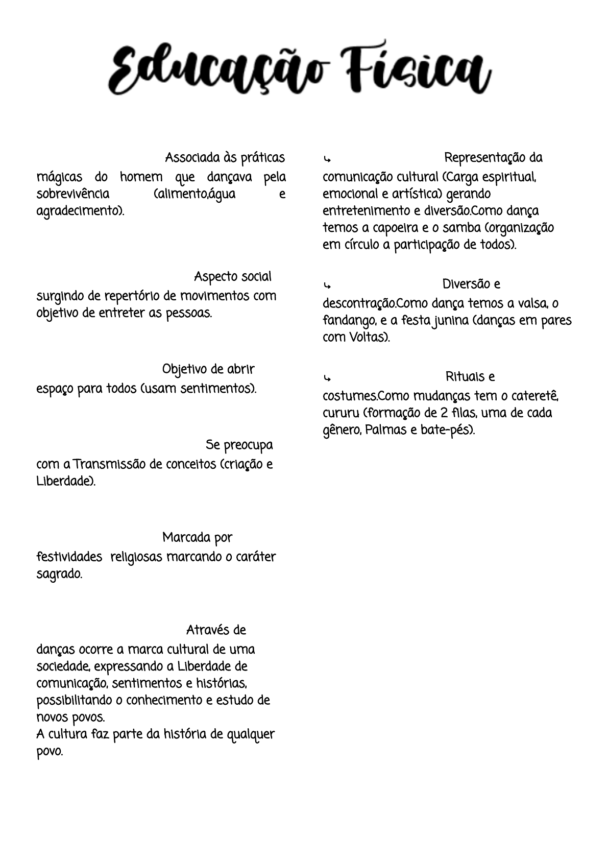 ⤷Danç� Primitiv�:Associada às práticas mágicas do homem que dançava pela sobrevivência (alimento,água e agradecimento). ⤷Danç� Renascentist�:Aspecto social surgindo de repertório de movimentos com objetivo de entreter as pessoas. ⤷Danç� Modern�:Objetivo de abrir espaço para todos (usam sentimentos). ⤷Danç� Contemporâne�:Se preocupa com a Transmissão de conceitos (criação e Liberdade). ⤷Danç� Medieva�:Marcada por festividades religiosas marcando o caráter sagrado. ⤷Identidad� Cultura�:Através de danças ocorre a marca cultural de uma sociedade, expressando a Liberdade de comunicação, sentimentos e histórias, possibilitando o conhecimento e estudo de novos povos. A cultura faz parte da história de qualquer povo. ⤷Danç� African�:Representação da comunicação cultural (Carga espiritual, emocional e artística) gerando entretenimento e diversão.Como dança temos a capoeira e o samba (organização em círculo a participação de todos). ⤷Danç� Europei�:Diversão e descontração.Como dança temos a valsa, o fandango, e a festa junina (danças em pares com Voltas). ⤷Danç� Indígen�:Rituais e costumes.Como mudanças tem o cateretê, cururu (formação de 2 filas, uma de cada gênero, Palmas e bate-pés).