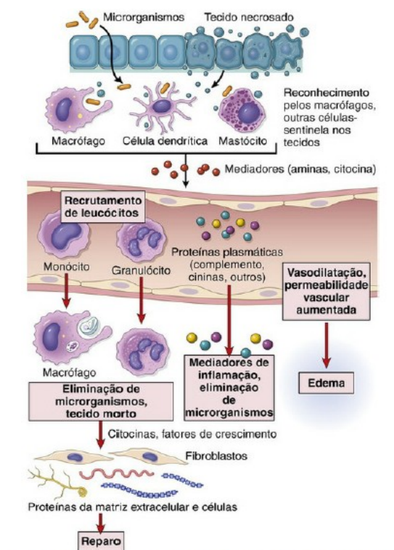 Inflamação O que é? A inflamação é uma resposta dos tecidos vascularizados a infecções e tecidos lesados. Para que serve? Consiste em recrutar células e moléculas de defesa do hospedeiro da circulação para os locais onde são necessárias, com a finalidade de eliminar os agentes agressores. Como ocorre? A reação inflamatória típica se desenvolve por meio de uma série de etapas em sequência: • O agente agressor, que se situa nos tecidos extravasculares, é reconhecido pelas células e moléculas hospedeiras. • Os leucócitos e as proteínas do plasma são recrutados da circulação para o local onde o agente agressor está localizado. • Os leucócitos e as proteínas são ativados e trabalham juntos para destruir e eliminar a substância agressora. • A reação é controlada e concluída. • O tecido lesado é reparado. Definição: A inflamação é uma resposta de tecidos vascularizados a infecções e tecidos lesados, que oferece leucócitos e moléculas de defesa do hospedeiro da circulação para os locais onde são necessárias, a fim de eliminar os agentes agressores Inflamação – aspectos gerais: -Serve para livrar o hospedeiro da causa inicial da lesão celular (por exemplo, micróbios, toxinas) e das consequências de tal lesão (por exemplo, células necróticas). -Resposta protetora essencial para sobrevivência. Sequência de eventos numa reação inflamatória Inflamação Aguda -Resposta inicial rápida, muitas vezes autolimitada, aos agentes agressores -Desenvolve-se em min ou h -Curta duração (várias h a poucos dias) -Exsudação de fluido e proteínas plasmáticas (edema) -Emigração de leucócitos, predominantemente neutrófilos -Se o estímulo ofensivo for eliminado, a reação diminui e ocorre o reparo tecidual -Pode evoluir para inflamação crônica Inflamação crônica -Após a inflamação aguda ou surge de novo. -Resposta aos agentes que são difíceis de erradicar, (p. ex., bacilos da tuberculose, vírus e fungos), antígenos próprios e antígenos ambientais. -De maior duração -Linfócitos, macrófagos, proliferação de vasos sanguíneos -Maior destruição tecidual e cicatrizes (fibrose). -Pode coexistir com inflamação aguda não resolvida, como pode ocorrer em úlceras pépticas Inflamação aguda Sinais cardinais da Inflamação aguda: Rubor (vermelhidão) Tumor (inchaço) Calor Dor Perda da função Etapas da resposta inflamatória podem ser lembradas como cinco: 1- Reconhecimento do agente lesivo, 2- Recrutamento de leucócitos, 3- Remoção do agente 4- Regulação (controle) da resposta 5- Resolução (reparo). 1-Reconhecimento de microrganismos e células danificadas Receptores celulares para microrganismos -Na membrana citoplasmática -Nos endossomos -No citosol Ex: família de receptores Toll-like (TLRs). Expressos em muitos tipos de células: -células epiteliais -células dendríticas -macrófagos -outros leucócitos *O envolvimento desses receptores deflagra a produção de moléculas abrangidas na inflamação Sensores de dano celular =Receptores citosólicos (p. ex, NOD-like receptors (NLRs) que reconhecem moléculas liberadas ou alteradas pelo dano celular, (p. ex., ácido úrico, ATP, diminuição da concentração intracelular de K+, DNA solto no citoplasma...) Ativam um complexo citosólico de várias proteínas (inflamossomo) que produz a citocina interleucina1 (IL-1). Ela induz a inflamação. Outros receptores celulares envolvidos na inflamação: -Receptores pra porção Fc dos anticorpos -Receptores para complemento Proteínas circulantes -Sistema complemento -Lectina ligadora de manose -Colectinas A inflamação aguda tem 3 componentes principais: (1) dilatação de pequenos vasos levando a aumento do aporte sanguíneo (2) Aumento da permeabilidade da microvasculatura (3) Saída de leucócitos do vaso para acumular no foco de agressão, com ativação dos leucócitos Reações dos vasos sanguíneos na inflamação aguda Alterações no fluxo sanguíneo e na permeabilidade dos vasos EXSUDAÇÃO = escape de fluidos, proteínas e células sanguíneas do sistema vascular para o tecido ou cavidade corporal. Exsudato = fluido extravascular com alta concentração de proteínas e restos celulares. Sua presença implica a existência de um processo inflamatório Transudato = fluido extravascular com baixa concentração de proteínas (maioria albumina), pouco ou nenhum material celular. Resultado de desequilíbrio hidrostático/osmótico, sem que ocorra aumento na permeabilidade vascular. Edema = transudato ou exsudato Os vasos sanguíneos na inflamação aguda Alterações no fluxo sanguíneo e na permeabilidade dos vasos • Vasodilatação – induzida por ação da, p. ex., histamina no músculo liso vascular. Evento precoce. Envolve arteríolas e depois abre novos leitos capilares na área. Aumento do fluxo sanguíneo. Calor. Rubor (eritema). • Aumento da permeabilidade da microvasculatura com vazamento de fluido rico em proteínas para o tecido • A perda de fluidos e aumento do diâmetro do vaso lentifica o fluxo sanguíneo, com concentração das hemácias e aumento da viscosidade sanguínea = estase = congestão vascular. Eritema. • Os leucócitos acumulam ao longo do endotélio, que está com aumento na expressão de moléculas de adesão. Leucócitos aderem ao endotélio, e migram para o tecido MECANISMOS DE AUMENTO DA PERMEABILIDADE VASCULAR • Contração das células endoteliais, abrindo espaço intercelular. Desencadeado por histamina, bradicinina, leucotrienos... Ocorre rapidamente após exposição ao mediador e dura pouco (15 a 30 min). Em queimaduras, irradiação ou radiação ultravioleta e algumas toxinas bacterianas, o aumento na permeabilidade vascular demora mais a ocorrer (2 a 12h) e dura horas ou dias e/ou • Dano endotelial, com necrose e destacamento do endotélio. Ex: queimaduras, microrganimos etc RESPOSTA DE VASOS LINFÁTICOS E LINFONODOS Na inflamação, o fluxo nos