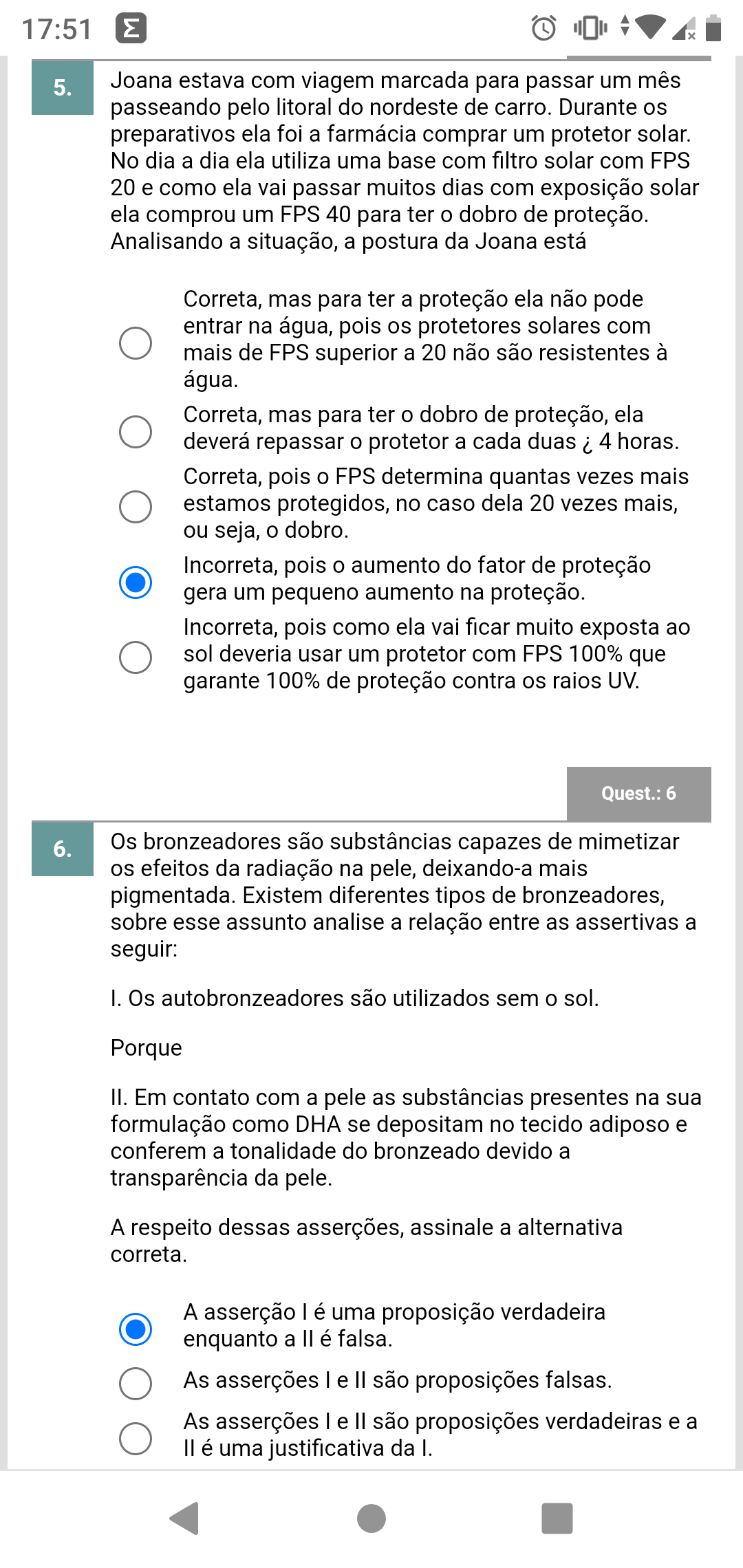 Joana estava com viagem marcada para passar um mês passeando pelo litoral do nordeste de carro. Durante os preparativos ela foi a farmácia comprar um protetor solar. No dia a dia ela utiliza uma base com filtro solar com FPS 20 e como ela vai passar muitos dias com exposição solar ela comprou um FPS 40 para ter o dobro de proteção. Analisando a situação, a postura da Joana está: Correta, mas para ter a proteção ela não pode entrar na água, pois os protetores solares com mais de FPS superior a 20 não são resistentes à água. Correta, mas para ter o dobro de proteção, ela deverá repassar o protetor a cada duas i 4 horas. Correta, pois o FPS determina quantas vezes mais estamos protegidos, no caso dela 20 vezes mais, ou seja, o dobro. Incorreta, pois o aumento do fator de proteção gera um pequeno aumento na proteção. Incorreta, pois como ela vai ficar muito exposta ao sol deveria usar um protetor com FPS 100% que garante 100% de proteção contra os raios UV.