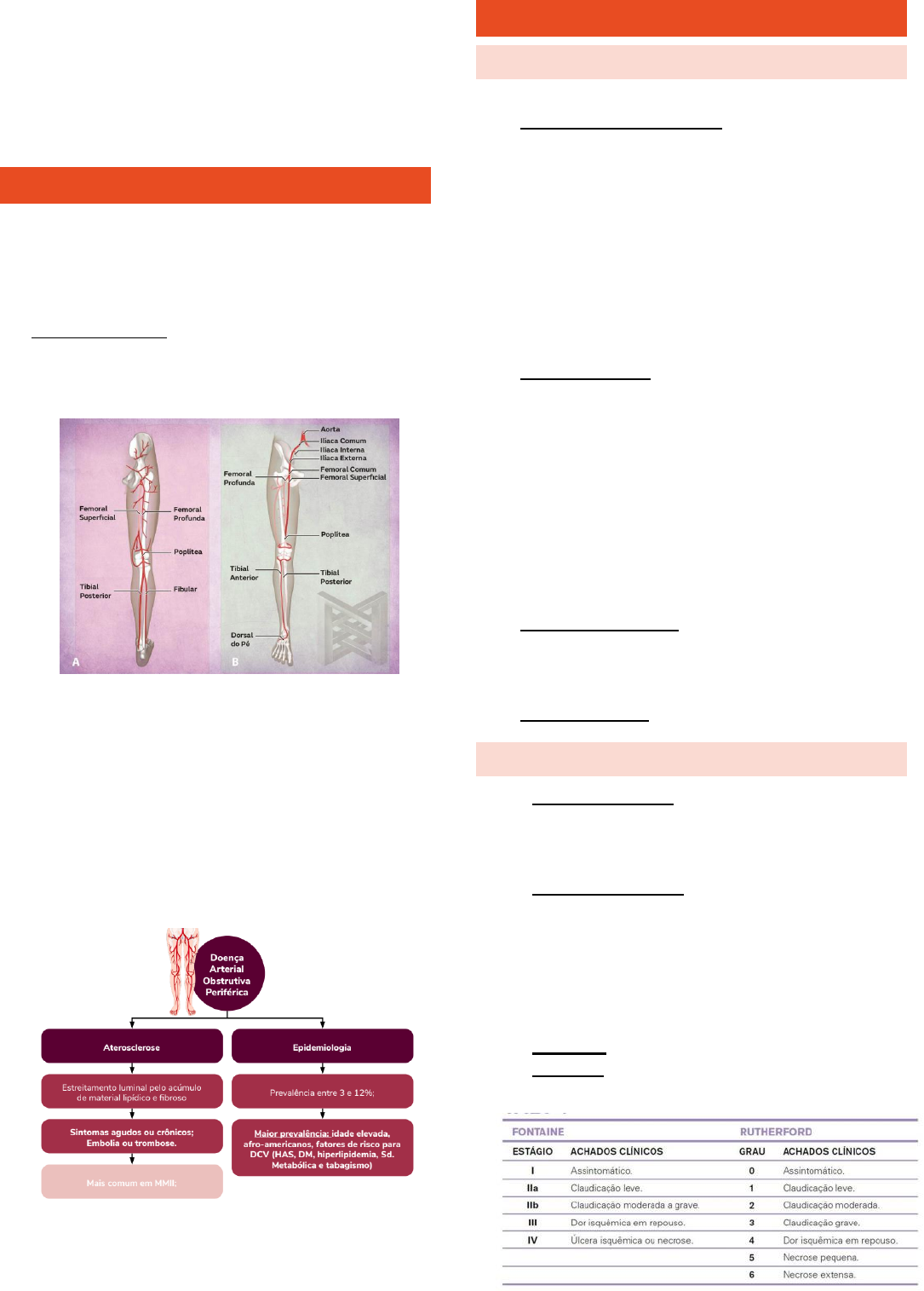 CIRURGIA VASCULAR – ESTEFFANE SEITZ TXVI 1 Doença arterial obstrutiva periférica (daop) INTRODUÇÃO Conceito: oclusão ou semioculsão de um ou mais segmentos da artéria que nutrem os MMII Isquemia aguda: Tromboembolismo Isquemia crônica: Estenoses Principais artérias: poplíteas e femorais; tibiais e fibulares; aorta abdominal e ilíaca O comprometimento distal é mais encontrado em DM ou idoso Etiologia: Aterosclerose (90%) Fatores de risco: Tabagismo; hipercolesterolemia; hiper-homocisteinemia; HAS; DM; dislipidemia, obesidade, sexo masculino, idade avançada; raça negra A maioria dos pacientes são idosos (60-70 anos); Aterosclerose é sistêmica: doença isquemia do miocárdio; doença cerebrovascular QUADRO CLINICO SINAIS E SINTOMAS Assintomático; Claudicação intermitente: é uma sensação de dor, câibra, formigamento ou fadiga. Ocorre devido a um desequilíbrio entre a perfusão (oclusão) e demanda metabólica -por isso é muito comum durante atvd física- então o musculo entra em metabolismo anaerobico É sempre referida na panturrilha Síndrome de Leriche: Oclusão femoral profunda pulso femoral bilateral + claudicação da panturrilha + coxa + nadegas + impotência Dor em repouso: É dor em repouso ocasionada por neurite isquêmica. Piorada com MMII em posição horizontal e melhorada com MMII pendente Difere da neuropatia periférica, visto que a mesma não muda a depender da posição Obstrução femoropoplitea dor na panturrilha Obstrução aortailiaca dor musc glútea e coxa Úlceras isquêmicas: Frequente na porção distal dos pés, geralmente com histórico de trauma discreto. São dolorosas, s/ sinais de cicatrização e secas. Isquemia critica: dor em repouso e lesão trofica EXAME FÍSICO Inspeção estática: fluxo sanguíneo (rarefação dos pelos, pele brilhante, edema de extremidade, palidez, cianose, atrofia muscular, ulceras e gangrenas) Inspeção dinâmica: Elevando o membro há palidez da extremidade, abaixando há hiperemia reativa e tempo de enchimento venoso prolongado no pé Teste de Leo Buerger: eleva MMII a 60º por 1 min, se houver palidez significa isquemia Palpação: Ausência de pulsos ditais, frialdade Ausculta: Sopros sistólicos nos trajetos vasculares indicam pontos de estenose CIRURGIA VASCULAR – ESTEFFANE SEITZ TXVI 2 DIAGNOSTICO É clinico + ITB Índice Pressórico Tornozelo-Braço (ITB): É uma ferramenta de triagem primária que avalia a relação pressórica sistólica no tornozelo (artéria tibial posterior ou dorsal do pé) e o membro superior (artéria braquial). Sendo realizada pelo US doppler. Tendo como importância a indicação do tratamento e avalição da evolução do pcte. Valor normal: ITB aproximadamente 1,11 (tornozelo > MMSS) 0,9 = DAOP Assintomático: 0,9-1 Claudicação: 0,5 a 0,9 Dor em repouso: < 0,5 Lesão trofica: < 0,5 EXAMES COMPLEMENTARES *Definir conduta Exames laboratoriais: Orienta tratamento das doenças bases. Solicitar no pre op: hemograma, creatinia e ureia, triglicerídeos, colesterol total, HDL e LDL Prova do esforço: esteira ergométrica ajustada para a velocidade de 3,2 km/h e inclinação de 10 a 12°. O paciente deve manifestar-se quando surge dor muscular (claudicação ou distância útil) e somente interromper a marcha quando a dor se torna insuportável (claudicação ou distância máxima) ou atinge o tempo de deambulação de 5 minutos Terminada a prova, são obtidas as pressões da artéria tibial de minuto a minuto, até que se restabeleça o valor da pressão de repouso. No indivíduo normal, não há queda da pressão. USG doppler colorido arterial: avalia parede vascular, placas ateromas, fluxo sanguíneo, estenose. Apresenta limitações em obesos e se presente calcificação arterial. Não é invasivo, usado na emergência. Angiotomografia: Avalia diâmetro do vaso e seu grau de estenose. Evitar uso em gestantes e crianças. É um exame com contraste (pedir ureia e creatina ao paciente) Angiorresonância: Invasivo, usa contraste. Fornece informações anatômicas. É contraindicado em pcte com clipes ou marca passo - O elemento químico do contraste é o gadolíneo não pode ser usado no paciente dialítico, não lesa o rim mas em pacientes dialíticos não posso usar o gadolíneo porque ele não é depurado e vai depositar na musculatura e tem a transmutação do gadolíneo e começa a ter fibrose sistêmica Arteriografia convencional: É invasivo, usado na avaliação intraoperatoria. Informa detalhes anatômicos e avalia fluxo sanguíneo ao longo da artéria, oclusão da artéria e estenose. Padrão ouro CLASSIFICAÇÃO TASC: A, B, C, D de acordo com a distribuição anatômica, números, natureza da lesão (estenose ou oclusão) e de acordo com as taxas globais de sucesso no tratamento das lesões por meios endovasculares ou cirúrgicos. Obs.: pacientes DM ou renais crônicos que apresentam extensa calcificação vascular (Esclerose de Monckberg) o ITB não é um método confiável devido a dificuldade na compressão das artérias no tornozelo pelo manguito. Nesse caso usasse oximetria transcutânea e medidas de pressão no nível dos pododáctilos (índice hálux-braquial) Tromboangiite obliterante (TAO, ou doença de Buerger): doença inflamatória que acomete artérias de médio e pequeno calibre, principalmente em homens jovens e fumantes. Tromboflebite superficial migratória de veias não varicosas e isquemia de mãos e dedos falam a favor de TAO A Terapia endovascular B Terapia endovascular, a menos que seja necessário revascularização C Revascularização aberta, mas se risco cirúrgico endovascular D Revascularização CIRURGIA VASCULAR – ESTEFFANE SEITZ TXVI 3 CLASSIFICAÇÃO DE GLASS TRATAMENTO TRATAMENTO CONSERVADOR (CLÍNICO) Para todos: Exercícios Físicos: Supervisionado 3x/semana por 30 minutos HAS: IECA (captopril,enalapril); Beta bloqueador (atenolol, propranolol) bloqueadores do canal de cálcio , diuréticos (anlodipina, nifedipina) diurét