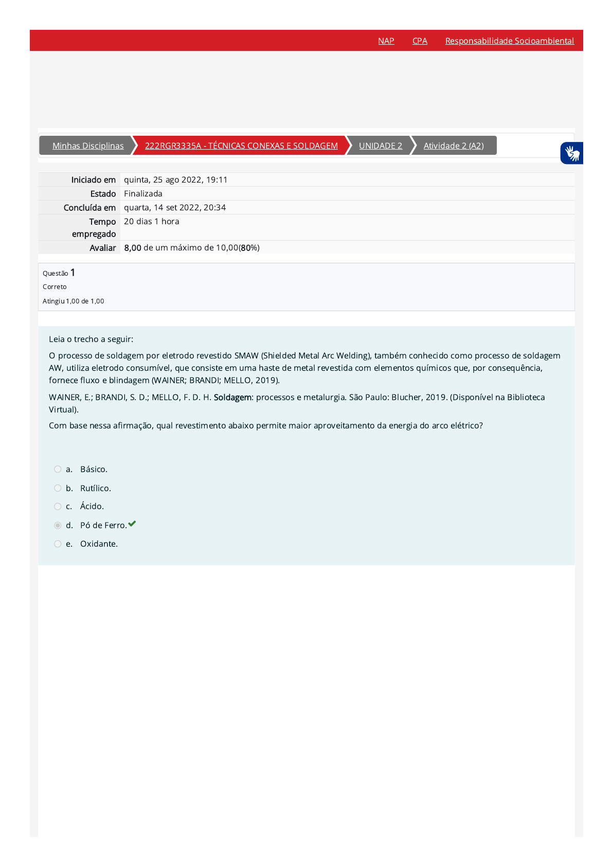 14/09/2022 19:35 Atividade 2 (A2): Revisão da tentativa https://ambienteacademico.com.br/mod/quiz/review.php?attempt=1021467&cmid=589200 1/6 Minhas Disciplinas 222RGR3335A - TÉCNICAS CONEXAS E SOLDAGEM UNIDADE 2 Atividade 2 (A2) Iniciado em quinta, 25 ago 2022, 19:11 Estado Finalizada Concluída em quarta, 14 set 2022, 20:34 Tempo empregado 20 dias 1 hora Avaliar 8,00 de um máximo de 10,00(80%) Questão 1 Correto Atingiu 1,00 de 1,00 Leia o trecho a seguir: O processo de soldagem por eletrodo revestido SMAW (Shielded Metal Arc Welding), também conhecido como processo de soldagem AW, utiliza eletrodo consumível, que consiste em uma haste de metal revestida com elementos químicos que, por consequência, fornece �uxo e blindagem (WAINER; BRANDI; MELLO, 2019). WAINER, E.; BRANDI, S. D.; MELLO, F. D. H. Soldagem: processos e metalurgia. São Paulo: Blucher, 2019. (Disponível na Biblioteca Virtual). Com base nessa a�rmação, qual revestimento abaixo permite maior aproveitamento da energia do arco elétrico? a. Básico. b. Rutílico. c. Ácido. d. Pó de Ferro. e. Oxidante. NAP CPA Responsabilidade Socioambiental https://ambienteacademico.com.br/my/ https://ambienteacademico.com.br/course/view.php?id=23150 https://ambienteacademico.com.br/course/view.php?id=23150§ion=3 https://ambienteacademico.com.br/mod/quiz/view.php?id=589200 https://codely-fmu-content.s3.amazonaws.com/Moodle/NAP/inicial/nap/fmu/index.html https://codely-fmu-content.s3.amazonaws.com/Moodle/CPA/landing_CPA/index.html https://portal.fmu.br/sustentabilidade 14/09/2022 19:35 Atividade 2 (A2): Revisão da tentativa https://ambienteacademico.com.br/mod/quiz/review.php?attempt=1021467&cmid=589200 2/6 Questão 2 Correto Atingiu 1,00 de 1,00 Questão 3 Correto Atingiu 1,00 de 1,00 Leia o trecho abaixo: A soldagem é um processo de união de materiais presente na história da humanidade há mais de 4.000 anos. Sendo restrita inicialmente aos artefatos de mais valor, como joias e ornamentos, a soldagem evoluiu ao ponto de ser cada vez mais empregada em componentes com maior exigência em termos de resistência mecânica, como armas e armaduras. Contudo foi no século XIX que ocorreram avanços disruptivos na área de tecnologia da soldagem. Sobre os pontos de virada que ocorreram no século XIX e a tecnologia de soldagem, é correto a�rmar que um desses pontos foi: a. o desenvolvimento das tecnologias de soldagem no estado sólido, envolvendo a soldagem por fricção e mistura. b. a criação das máquinas inversoras, que consistem em equipamentos mais versáteis e portáteis do que os reti�cadores. c. a descoberta do arco elétrico e da combustão do acetileno, que são a base da soldagem por eletrodo e por oxigás. d. a possibilidade da criação de novos materiais a partir dos princípios de soldagem, como o caso do aço damasco. e. a descoberta de registros arqueológicos e artefatos contendo juntas soldadas, como a máscara de Tutancâmon. Leia o trecho a seguir: A brasagem é um processo que utiliza metal de adição diferente dos metais base. A particularidade desse processo está na ação de capilaridade do material, que será adicionado próximo à junta. Tal processo é realizado, na maioria das vezes, com o emprego de �uxo, visando eliminar possíveis impurezas (GROOVER, 2017). GROOVER, M. P. Fundamentos da moderna manufatura. Rio de Janeiro: LTC, 2017. Sobre a temperatura de fusão do material adicionado, assinale a alternativa correta. a. Em se tratando de dois materiais de base, a temperatura deve ser intermediária. b. A temperatura de fusão deve ser menor que a temperatura do material soldado. c. A temperatura de fusão deve ser superior à temperatura do material soldado. d. A temperatura de fusão do eletrodo revestido deve ser superior à temperatura do metal base. e. A temperatura de fusão deve ser igual à temperatura do material soldado. NAP CPA Responsabilidade Socioambiental https://codely-fmu-content.s3.amazonaws.com/Moodle/NAP/inicial/nap/fmu/index.html https://codely-fmu-content.s3.amazonaws.com/Moodle/CPA/landing_CPA/index.html https://portal.fmu.br/sustentabilidade 14/09/2022 19:35 Atividade 2 (A2): Revisão da tentativa https://ambienteacademico.com.br/mod/quiz/review.php?attempt=1021467&cmid=589200 3/6 Questão 4 Correto Atingiu 1,00 de 1,00 Questão 5 Correto Atingiu 1,00 de 1,00 Leia o trecho a seguir: "O ‘arco’ é produzido por uma corrente de baixa voltagem e alta amperagem saltando entre o eletrodo e a junta a ser soldada. O calor do arco elétrico é concentrado nas bordas dos metais de base que devem ser unidos, fazendo com que elas fundam. Enquanto essas bordas ainda estão fundidas, metal de adição no estado fundido pode ser transferido adequadamente através do arco" (TIMINGS, 2008, p. 490). TIMINGS, R. Joining processes (welding). In: TIMINGS, R. Fabrication and welding engineering. Oxford: Newnes, 2008. Considerando o trecho apresentado sobre a física do arco elétrico, avalie as a�rmativas a seguir. I. Existem vários modos de transferência do metal de adição a partir de um eletrodo consumível, como curto-circuito e spray. II. Uma das vantagens do arco elétrico é a utilização de tensão e corrente elétricas comparáveis com a rede de distribuição. III. Os eletrodos consumíveis são aqueles que consistem no próprio material de adição, sendo consumidos ao longo do processo. IV. Os eletrodos inertes são aqueles que não se consomem no processo, de forma que a solda pode ocorrer sem metal de adição. É correto o que se a�rma em: a. I e II, apenas. b. II e IV, apenas. c. I, III e IV, apenas. d. I, apenas. e. I e IV, apenas. Leia com atenção o trecho a seguir: “A soldagem por arco requer que um arco elétrico seja estabelecido entre um eletrodo e a peça de trabalho para produzir o calor necessário para fundir o metal de base. Como a energia da rede de distribuição não é fornecida na tensão e corrente adequadas, ela deve ser convertida pa