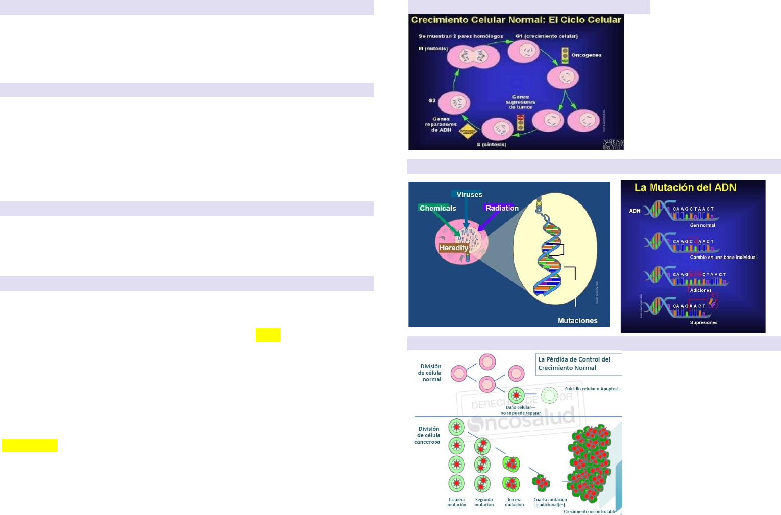 Biología del cáncer Cancerología: Nombre científico CÁNCER PAGURUS (hipocrates 460-370 A.C) La oncología es la ciencia que trata el estudio de los tumores, onco tumor logos tratados GENERALIDADES: - Existen por lo menos mas de 100 tipos de cancer, se considero 6 los mecanismos que intervienen en los mecanismos de crecimiento de los tumores - Se conoce de la existencia del cancer desde la época de los dinos - El tumor mas antiguo de la pieza de un tumor fue hallado en el este de Africa ¨Era Pleistocénica¨ periodo aprox. De 1 600.000 a 10.000 años ETIOLOGIA DEL CÁNCER - Los agentes capaces e inducir neoplasias, forman una lista larga, carcinógenos, virus, radiológicos y químicos - El 80% es influencia ambiental SECUENCIA DE LA ETIOLOGIA - Iniciación: exposición a carcinógenos iniciadores - Promoción: exposición crónica a carcinógenos, lesión preneoplásica - Conversión: cambios genéticos neoplasia benigna o insitu (ginecología, PAP se encuentra CIN I, II, III.) - Progresión: inestabilidad genómica, cambios adaptativos, neoplasia invasiva y metástasis - PETSCAN: glucosa radioactiva - Tumores de órganos blancos (muy agresivos) en útero por ejemplo es menos agresivo Ver estadios CRECIMIENTO CELULAR NORMAL: EL CICLO CELULAR Los genes y el cancer Perdida de control del crecimiento normal +4cm maligno CÁNCER - Crecimiento celular incontrolado en alguna parte de nuestro organismo a consecuencia del daño del adn - El sitio u órgano donde se originan estas masas se llama tumor primario - Además tienen la capacidad de invadir órganos vecinos y diseminarse originando tumores secundarios denominados metastasis Benignos • Bordeline medianamente entre benigno y maligno • Malignos - Los primarios suelen ser centales - Las metastasis periféricas Interrumpe en la fase G1 a S bloqueando o inhibiendo los genes supresores de tumores Proliferación y transformacon celular - Normalmente las cel están bajo control de crecimiento, las células malignas pierden pierden la capacidad de responder a los controles de crecimiento y proliferación - Inmortalización disminución de las adherencias cel, potencial oncogénico, perdida de la inhibición por contacto. BIOLOGIA MOLECULAR Y EL CANCER - Oncogenes versus genes supresores - Señalización, receptores y segundos mensajeros (variaciones que habrá una vez que se altera, se bloquean los receptores) - Angiogénesis - Nuevos tratamientos ➢ Factor importante es la edad ➢ En niños es muy rápido el avance de la enfermedad ➢ En adultos mayores la replicación celular es muy lenta ONCOGENES VS GENES SUPRESORES El paradigma genético del cancer - El material genético es la diana central de la carcinogénesis. - El fenotipo maligno es resultado de lesiones genéticas de tipo dominante y/o recesivo. - El cáncer es una enfermedad genética del ciclo celular Oncogen - Gen anormal o activado que procede de la mutacion o activación de un gen normal llamado protooncogén - Los oncogenes son los responsables de la transformación de una celula normal en una maligna - 60 oncogenes en los diferentes cromosomas del genoma GENES SUPRESORES - Es el cambio o deleción de un gen supresor tumoral, aumentara la probabilidad de que se produzca un tumor, al perder la función. - Gen supresor tumoral alterado es lo mismo que un oncogen. RECEPTORES DE MEMBRANA - Reciben informacion externa a la célula. - Traducen la señar hacia el núcleo, segundos mensajeros. - El núcleo responde aumentando o disminuyendo la expresión de genes. Mutaciones involucradas - Proliferación en ausencia del factor de crecimiento - Evasión a vénulas linfáticos capilar - Invasión a células normales - Reclutamiento - Diseminación Proteasas e citoquinas: migración e invasión Genes - Oncogenes - Genes supresores de tumor - Genes reparadores de adn - Carcinogeno o Genes activados o Genes desactivados - Genes del ciclo celular - Genes de control del ciclo celular - Genes de muerte celular - Genes señaladores celulares - Genes de diferenciación celular - Genes de senescencia celular - Metastasis genes de invasión ANGIOGENESIS - Los tumores necesitan vascularización para seguir creciendo. - Las células tumorales liberan diferentes factores que estimulan la angiogénesis. - Factor de crecimiento del endotelio vascular VEGF METASTASIS PATOGENIA - Fijación como blanco - Penetración - Colonización - Supresión inmune - Inestabilidad METASTASIS LINFATICA - Paget observo en 1889 que las metastasis línfaticas pueden crecer en ganlios distantes en lugar de los proximales. - Al dx la metastasis a ganglios es un factor importante de pronostico de superviviencia - Los GLRs pueden retener a las células tumorales y servir de Barrera temporal contra su diseminación. - Recientes avances en tecnicas de mapeo de ganglios han permitido conocer con exactitud los ganglios linfáticos que drenan elsitio del tumor (ganglio linfático, centinella) METASTASIS HEMATOGENA - La presencia de células tumorales en la sangre no constituye metástasis y es de escaso valor para predecir la formación de metástasis clínicas - La gran mayoría de células tumorales que penetran el sistema circulatorio son rápidamente eliminados - La probabilidad de que sobrevivan en la sangre se ve beneficiada si forman agregados con otras células METASTASIS LATENTE - No se conoce el por que de la reaparición, pero es posible que las células permanezcan en la fase G del ciclo celular. - Células tumorales experimentaran continuamente el ciclo celular.