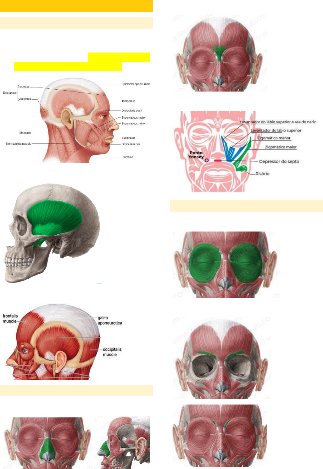 MÚSCULOS DA FACE COURO CABELUDO → Epicrânio ou Occípito frontal: é formado pelo ventre occipital e pelo ventre frontal e estes são reunidos por uma extensa aponeurose intermediária: a gálea aponeurótica. → Temporoparietal → Gálea Aponeurótica NARIZ → Nasal (transverso do nariz) → Prócero → Depressor do septo PÁLPEBRAS → Orbicular do olho → Corrugador do supercílio ORELHA → Auricular anterior, superior e posterior BOCA → Levantador do ângulo da boca → Levantador do lábio superior → Levantador do lábio superior e da asa do nariz → Zigomático menor → Zigomático maior → Risório → Depressor do lábio inferior → Depressor do ângulo da boca → Mentoniano ou músculo mentual → Orbicular da boca → Músculo bucinador