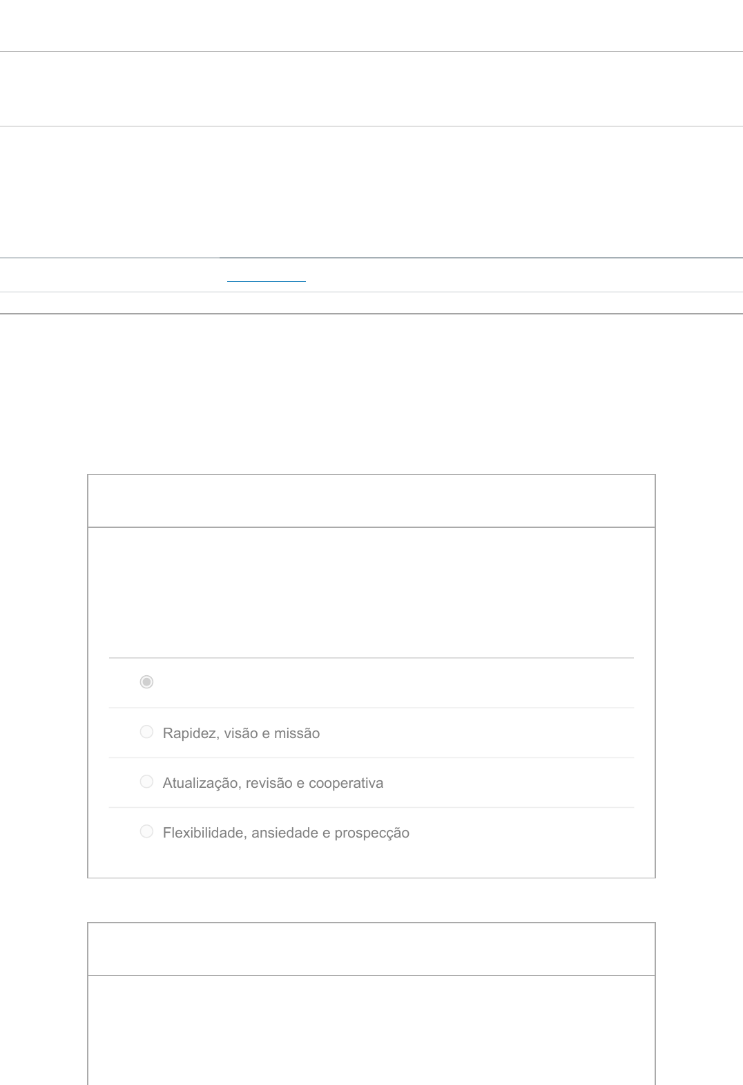 Atividade Unidade II Entrega 19 set em 23:59 Pontos 10 Perguntas 5 Disponível 12 set em 0:00 - 19 set em 23:59 Limite de tempo Nenhum Histórico de tentativas Tentativa Tempo Pontuação MAIS RECENTE Tentativa 1 5.239 minutos 10 de 10 As respostas corretas estarão disponíveis em 20 set em 0:00. Pontuação deste teste: 10 de 10 Enviado 17 set em 11:27 Esta tentativa levou 5.239 minutos. 2 / 2 ptsPergunta 1 O mindset ágil pode ser representado pelas seguintes características, não limitadas a: Motivação, organização e frequência. Rapidez, visão e missão Atualização, revisão e cooperativa Flexibilidade, ansiedade e prospecção 2 / 2 ptsPergunta 2 É considerado um dos problemas no cenário corporativo de projetos, exceto: https://pucminas.instructure.com/courses/105837/quizzes/342221/history?version=1 Projetos em acordo com os objetivos Muitos projetos ativos Projetos errados para o momento Projetos não alinhados à estratégia 2 / 2 ptsPergunta 3 É correto afirmar que no manifesto ágil: Indivíduos e interações são mais importantes que: processos e ferramentas sistemas e ferramentas abordagens e visões custo e desperdício 2 / 2 ptsPergunta 4 Selecione a melhor definição para um profissional ágil. Flexível, adaptável e aberto a mudanças. Realiza atividades sem fluxo e com desperdício Não analisa as lições aprendidas Age por instinto 2 / 2 ptsPergunta 5 Podemos considerar que ser ágil é: Desembaraçado, eficiente e diligente Atualizado, ansioso e rápido Rápido, veloz e astuto Veloz, adaptável e de baixo custo Pontuação do teste: 10 de 10
