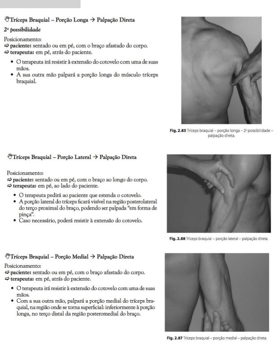 Anatomia Palpatória – aula de 17/06/2021: Estruturas: Tríceps – página 190 até 191: Anotação: Paciente realiza a extensão de cotovelo com uma extensão de ombro, e esses músculos tornam-se evidentes posteriormente. Tendão bicipital: Anotação: Localiza-se na porção distal do bíceps. Afundar os dedos no tendão. Estrutura mais “superficial”, conseguimos sentir com clareza na palpação. Pedir para o paciente flexionar o cotovelo e conseguimos sentir bem o tendão. Braquial – página 189: Bíceps Braquial - página 186: Anotação: Paciente com os braços flexionados. Deslizar os dedos até o final. Lá, haverá uma depressão, onde podemos acompanhar as cabeças medial e lateral. A cabeça longa é mais lateral. Anotação: Quando o paciente flexiona o cotovelo, sentimos – se apertarmos com mais força – a contração do músculo, mais medialmente ao tendão. Epicôndilo Lateral: Anotação: Região proeminente no cotovelo. Fazer braço de festa junina com o paciente e ficar ao lado dele. Seguir o rádio na região posterior, haverá uma depressão e depois uma proeminência. Cabeça do rádio – página 141: Anotação: Assim que encontrar o epicôndilo (passos anteriores), pedir para realizar supinação e pronação. Sentiremos a cabeça do rádio mover-se. Colo do rádio – página 142: Anotação: Seguindo a cabeça do rádio, desliza o dedo e encontrará mais uma depressão e depois estarás em cima do colo do rádio. Ligamento Colateral Lateral: Anotação: Deve-se usar a ponta dos dedos e deslizar para trás e para frente. Entre o epicôndilo e a cabeça do rádio, há um tecido macio. Para confirmarmos se é um ligamento ou um músculo, devemos pedir para fazer uma extensão de punho (“acelerar a moto”) e assim conseguimos perceber se é o músculo ou o ligamento, afinal o músculo irá contrair. Se não tensionar, estaremos no lugar certo. Na região posterior do cotovelo, há o olecrano entre as 2 estruturas que formam um triangulo. Epicôndilo medial: Anotação: Na face anterior do cotovelo. Sentar-se de lado para o paciente, flexionar o cotovelo e realizar uma rotação externa. Incisura troclear do olecrano – página 145: Anotação: Conecta o úmero com a ulna. Ligamento colateral medial: Anotação: Linha reta entre o epicôndilo medial e o olecrano. Palpa-se medialmente até sentir um tecido mole. Pedir para o paciente flexionar o punho, onde não contrair é o ligamento. Nervo ulnar: Anotação: Posteriormente, palpando com o dedo indicador, sentir uma estrutura em forma de cordão. O paciente provavelmente sentirá um choque no dedo mínimo. Escafoide – página 148 e 149: Anotação: Com o antebraço do paciente encostado na barriga do avaliador, pedir para o paciente fazer um “jóia”. A “tabaqueira anatômica” ficará evidente. Colocar um dedo nessa estrutura e segurar a mão do paciente, e realizar uma extensão. Lembrar de realizar o movimento com a mão mais lateral e com a mão medial segurar a mão do paciente. Semilunar – página 150: Anotação: Imaginar uma linha reta do terceiro dedo até a articulação radiocárpica. Realizar uma flexão no punho do paciente e um osso ficará mais proeminente abaixo do nosso dedo indicador. Piramidal – página 151: Anotação: Achar o processo estiloide e deslizar os dedos distalmente para sentir o osso. Deve-se segurar com o polegar. Pisiforme – página 151: Anotação: Se localiza na base hipotênar do dedo mínimo (a região mais gordinha da palma da mão perto do mindinho), devemos movimentar essa “ervilhazinha” para frente e para trás e para um lado e para o outro.