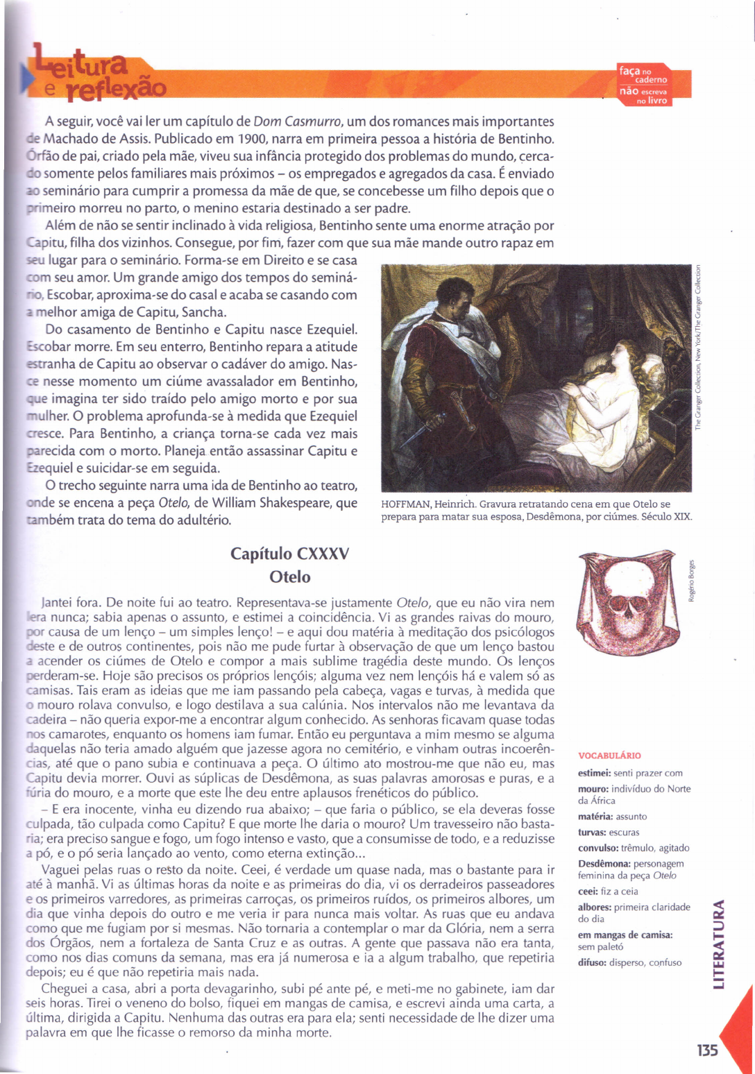 A seguir, você vai ler um capítulo de Dom Casmurro, um dos romances mais importantes - Machado de Assis. Publicado em 1900, narra em primeira pessoa a história de Bentinho. -o de pai, criado pela mãe, viveu sua infância protegido dos problemas do mundo, cerca- - somente pelos familiares mais próximos - os empregados e agregados da casa. É enviado seminário para cumprir a promessa da mãe de que, se concebesse um filho depois que o irneiro morreu no parto, o menino estaria destinado a ser padre. Além de não se sentir inclinado à vida religiosa, Bentinho sente uma enorme atração por pitu, filha dos vizinhos. Consegue, por fim, fazer com que sua mãe mande outro rapaz em lugar para o seminário. Forma-se em Direito e se casa m seu amor. Um grande amigo dos tempos do seminá- , Escobar, aproxima-se do casal e acaba se casando com melhor amiga de Capitu, Sancha. Do casamento de Bentinho e Capitu nasce Ezequiel, - obar morre. Em seu enterro, Bentinho repara a atitude anha de Capitu ao observar o cadáver do amigo. Nas- - nesse momento um ciúme avassalador em Bentinho, e imagina ter sido traído pelo amigo morto e por sua =ulher; O problema aprofunda-se à medida que Ezequiel ce. Para Bentinho, a criança torna-se cada vez mais recida com o morto. Planeja então assassinar Capitu e Ezequiel e suicidar-se em seguida. O trecho seguinte narra uma ida de Bentinho ao teatro, de se encena a peça Otelo, de William Shakespeare, que zambém trata do tema do adultério. HOFFMAN, Heinrich. Gravura retratando cena em que Otelo se prepara para matar sua esposa, Desdêmona, por ciúmes. Século XIX. Capítulo CXXXV Otelo Jantei fora. De noite fui ao teatro. Representava-se justamente ateio, que eu não vira nem era nunca; sabia apenas o assunto, e estimei a coincidência. Vi as grandes raivas do mouro, r causa de um lenço - um simples lenço! - e aqui dou matéria à meditação dos psicólogos te e de outros continentes, pois não me pude furtar à observação de que um lenço bastou acender os ciúmes de ateio e compor a mais sublime tragédia deste mundo. Os lenços oerderarn-se. Hoje são precisos os próprios lençóis; alguma vez nem lençóis há e valem só as misas. Tais eram as ideias que me iam passando pela cabeça, vagas e turvas, à medida que mouro rolava convulso, e logo destilava a sua calúnia. Nos intervalos não me levantava da cadeira - não queria expor-me a encontrar algum conhecido. As senhoras ficavam quase todas s camarotes, enquanto os homens iam fumar. Então eu perguntava a mim mesmo se alguma quelas não teria amado alguém que jazesse agora no cemitério, e vinham outras incoerên- cias, até que o pano subia e continuava a peça. O último ato mostrou-me que não eu, mas Capitu devia morrer. Ouvi as súplicas de Desdêmona, as suas palavras amorosas e puras, e a 'úria do mouro, e a morte que este lhe deu entre aplausos frenéticos do público. - E era inocente, vinha eu dizendo rua abaixo; - que faria o público, se ela deveras fosse culpada, tão culpada como Capitu? E que morte lhe daria o mouro? Um travesseiro não basta- ria; era preciso sangue e fogo, um fogo intenso e vasto, que a consumisse de todo, e a reduzisse a pó, e o pó seria lançado ao vento, como eterna extinção ... Vaguei pelas ruas o resto da noite. Ceei, é verdade um quase nada, mas o bastante para ir até à manhã. Vi as últimas horas da noite e as primeiras do dia, vi os derradeiros passeadores e os primeiros varredores, as primeiras carroças, os primeiros ruídos, os primeiros albores, um dia que vinha depois do outro e me veria ir para nunca mais voltar. As ruas que eu andava como que me fugiam por si mesmas. Não tornaria a contemplar o mar da Glória, nem a serra dos Órgãos, nem a fortaleza de Santa Cruz e as outras. A gente que passava não era tanta, como nos dias comuns da semana, mas era já numerosa e ia a algum trabalho, que repetiria depois; eu é que não repetiria mais nada. Cheguei a casa, abri a porta devagarinho, subi pé ante pé, e meti-me no gabinete, iam dar eis horas. Tirei o veneno do bolso, fiquei em mangas de camisa, e escrevi ainda uma carta, a última, dirigida a Capitu. Nenhuma das outras era para ela; senti necessidade de lhe dizer uma palavra em que lhe ficasse o remorso da minha morte. VOCABuLÁRIo estimei: senti prazer com mouro: indivíduo do Norte da África matéria: assunto turvas: escuras convulso: trêmulo, agitado Desdêmona: personagem feminina da peça Otelo ceei: fiz a ceia albores: primeira claridade do dia em mangas de camisa: sem paletó difuso: disperso, confuso 135 COUTINHO, Afrânio. Estudo Introdutivo. In: ASSIS, Machado de. Dom Casmurro. Rio de Janeiro: Ediouro; São Paulo: Publifolha, 1997. _...,- .... ... . Escrevi dois textos. a primeiro queimei-o por ser longo e difuso. a segundo continha só onecessário, claro e breve. Não lhe lembrava o nosso passado, nem as lutas havidas, nem ale-gria alguma; falava-lhe só de Escobar e da necessidade de morrer. ASSIS, Machado de. Dom Casmurro. Disponível em: <http://www.dominiopublico.gov.br/download/texto/bv00180a.pdI>. Acesso em: 22 dez. 2012. 1. Em Dom Casmurro, Machado de Assis toma como mote a história de uma suposta traição. Contudo, por detrás das atitudes do narrador-personagem, há uma profunda análise da sociedade de seu tempo e do comportamento humâno universal. Releia o momento em que Bentinho observa a ação das pessoas durante o intervalo da peça. Destaque do trecho um fragmento em que se possam observar traços sociais es- pecíficos dos frequentadores do teatro. Pelo que se pode ler, o narrador efetua alguma crítica a essas pessoas? Quais? 2. a narrador afirma que "não vira nem lera nunca ateio" e que estimou a coincidência, ao chegar ao teatro. a) A que coincidência está se referindo? b) a narrado r faz menção à suspeita de ateio ter "descoberto" a traição de Desdêmona por causa de um lenço. A seguir, reflete sobre a diferença entre a época em que 