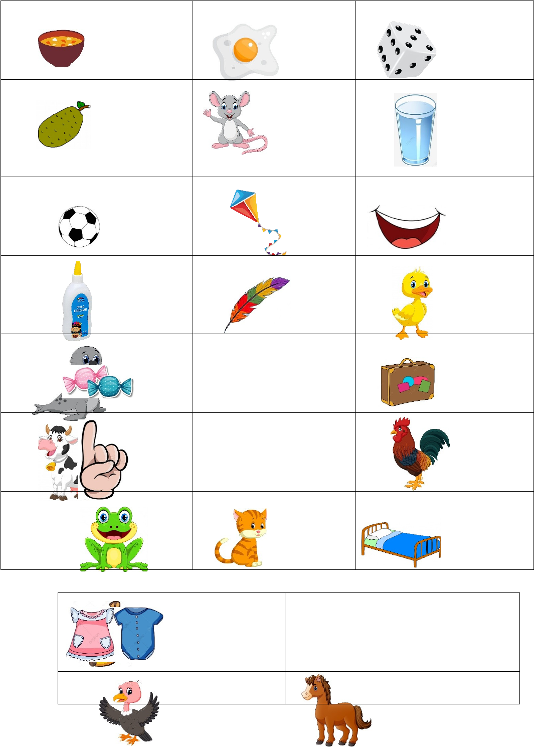 SOPA OVO DADO JACA RATO COPO BOLA PIPA BOCA COLA PENA PATO FOCA BALA MALA VACA DEDO GALO SAPO GATO CAMA BANANA ROUPA URUBU CAVALO JANELA JUJUBA CARACOL CORUJA BONECA BICICLETA CASA MACACO TOMATE CADERNO PIRULITO PIPOCA CARRO JACARÉ