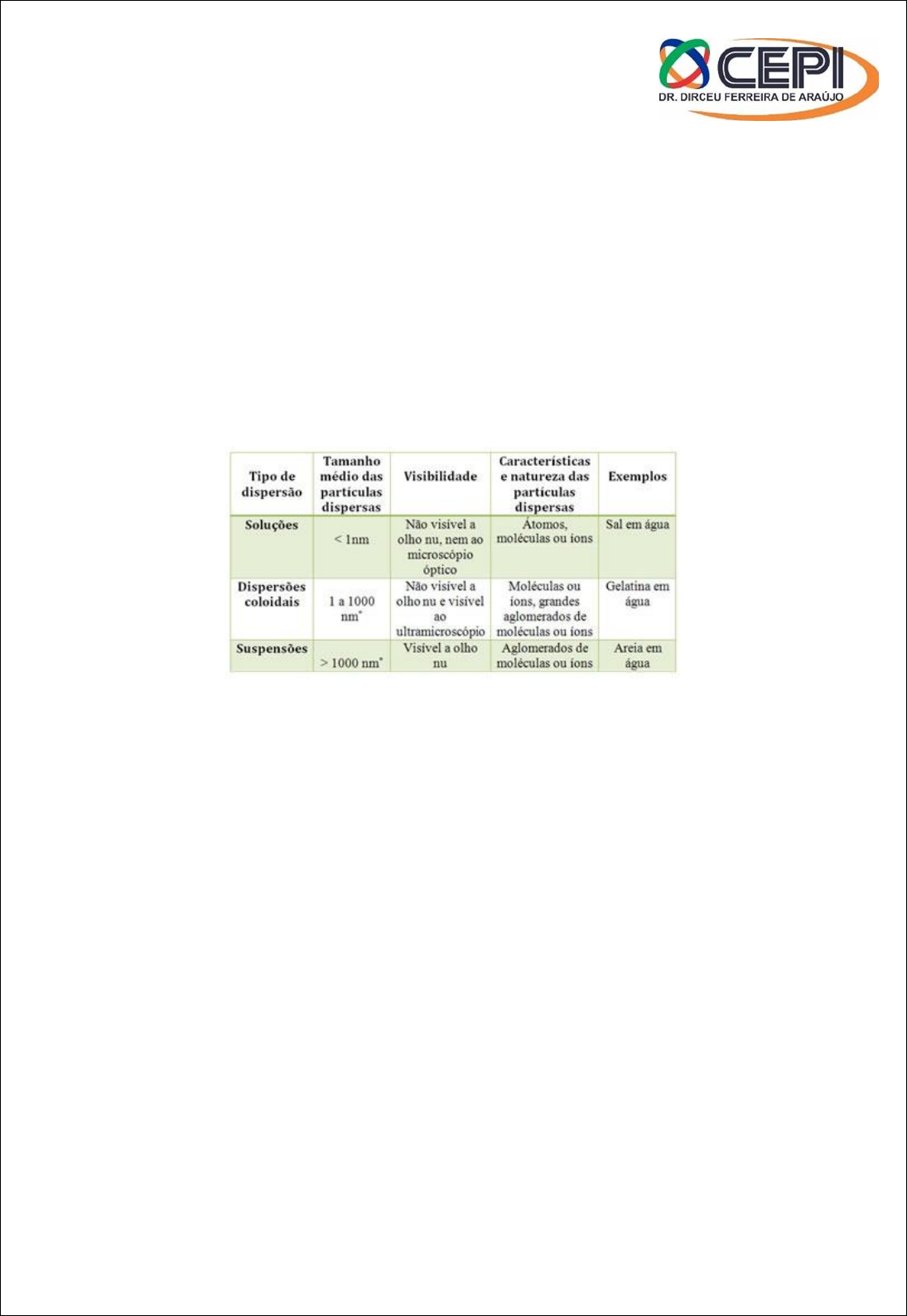 Professor: Angélica Rocha Disciplina: Química Série: 2° Data: 01/03 1º bimestre _________________________ Dispersões - soluções, colóides e suspensões – As dispersões se referem às misturas em geral. Por exemplo, quando misturamos sal com água ou sal e areia obtemos duas dispersões. A substância que se encontra espalhada, de maneira homogênea (como o sal na água) ou de maneira heterogênea (como a areia na água), é denominada “disperso”. Já a água faz o papel de dispersante, nesses casos. Nem todas as misturas apresentam aspectos iguais. Uma maneira de classificá-las é por meio do tamanho das partículas dispersas, ou seja, do soluto. Conforme a tabela abaixo, existem três tipos básicos de dispersões, que são as soluções, colóide (ou dispersão coloidal) e suspensões: Obs: 1 nm é 1 bilionésimo de metro, ou seja, divide 1 metro em 1 bilhão de partes. 1. Soluções: são misturas de duas ou mais substâncias de aspecto uniforme, sendo que suas partículas dispersas apresentam o tamanho menor que 1nm. Portanto, são invisíveis a olho nu. Nas soluções, as partículas dos solutos não sedimentam; não podem ser separadas do solvente por filtração; não conseguem dispersar a luz; e nem mesmo com o auxílio de instrumentos ópticos como ultramicroscópios elas podem ser vistas. Já tais fatores ocorrem com os coloides. Existem soluções sólidas, líquidas e gasosas. Veja exemplos de cada caso: 1.1.Soluções sólidas: ligas metálicas, como o bronze (mistura de cobre e estanho), o ouro 18 quilates (ouro e prata ou ouro e cobre), o latão (cobre e zinco), etc. 1.2.Soluções líquidas: açúcar na água, oxigênio dissolvido na água, álcool, água oxigenada, entre outros; 1.3.Soluções gasosas: o ar. 2. Dispersão coloidal ou colóide: apesar de muitas vezes, a olho nu, as dispersões coloidais serem confundidas com soluções por apresentarem um aspecto homogêneo, quando vistas ao microscópio é possível ver que se trata de uma mistura heterogênea. As dispersões coloidais são classificadas de acordo com as fases dispersas e de dispersão, gerando cinco tipos básicos de coloides, que são: sol, gel, emulsão, espumas e aerossol. Professor: Angélica Rocha Disciplina: Química Série: 2° Data: 01/03 1º bimestre _________________________ Esses tipos de coloides podem ainda ser sólidos ou líquidos, conforme mostram os exemplos abaixo: 2.1.Sol: sólido disperso em líquido. Ex: gelatina dissolvida, pasta de dente e tinta; 2.2.Sol sólido: sólido disperso em sólido. Ex: vidro e plástico pigmentado; 2.3.Gel: líquido disperso em sólido. Ex:gelatina, geleias, queijos, pasta de dente. 2.4.Emulsão: líquido disperso em líquido. Ex: maionese, leite, manteiga e cremes; 2.5.Emulsão sólida: líquido disperso em sólido. Ex: margarina, opala e pérola; 2.6.Espumas: gás disperso em líquido. Ex: espuma de sabão e de combate a incêndios e chantilly; 2.7.Espumas sólidas: gás disperso em sólido. Ex: isopor, poliuretano, pedra-pomes, carvão e maria-mole; 2.8.Aerossol líquido: líquido disperso em gás. Ex: neblina e sprays; 2.9.Aerossol sólido: sólido disperso em gás. Ex: fumaça e poeira. 3. Suspensões: as suspensões apresentam partículas de diâmetro maior que 1000 nm. Assim, elas podem ser vistas a olho nu ou por microscópio. É uma mistura heterogênea e suas partículas se sedimentam, sendo facilmente filtradas. Exemplos de suspensões: granito, água e areia, água e argila, etc. Atividades 1. Qual a diferença entre solução, colóide e suspensão? 2. (ITA) Considere os sistemas a seguir: I. Creme de leite II. Maionese III. Óleo de soja IV. Poliestireno (isopor) Quais são classificados como colóides? 3. A fumaça é constituída por um conjunto de substâncias emitidas no processo de queima da madeira e é classificada como uma dispersão coloidal. Qual seria a classificação desse colóide? 4. Classifique os seguintes colóides, considerando o tipo de partícula dispersa e o meio dispersante: a) Espuma de barbear b) Geléia de frutas c) Leite de magnésia d) Baygon spray e) Manteiga 5. Procure na sua casa 5 produtos que sejam colóides, escreva o nome do produto, classifique o colóide e descreva qual a fase dispersa e dispersante. Ex: Desodorante Dove – aerossol: líquido disperso em gás.