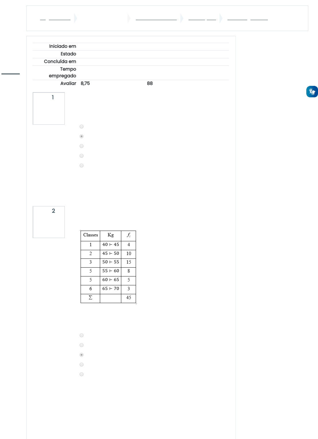 Página inicial Minhas Disciplinas EST_2002_CEUMA AVALIAÇÕES Prova Regimental Questão 1 Correto Atingiu 1,25 de 1,25 Questão 2 Correto Atingiu 1,25 de 1,25 Iniciado em sexta, 2 out 2020, 16:47 Estado Finalizada Concluída em sexta, 2 out 2020, 17:26 Tempo empregado 38 minutos 40 segundos Avaliar 8,75 de um máximo de 10,00(88%) Para um valor de a>0 em um modelo de regressão linear, entre duas variáveis, x e y, do tipo y=ax+b, é correto afirmar que: Escolha uma: a. a correlação entre as variáveis é forte. b. a correlação entre as variáveis é positiva. c. a correlação entre as variáveis é fraca. d. a correlação entre as variáveis é nula. e. a correlação entre as variáveis é negativa. A resposta correta é: a correlação entre as variáveis é positiva.. A tabela a seguir mostra as massas, em quilogramas, de um grupo de 45 pessoas, observadas por meio de uma coleta de dados. Analisando essa tabela, é correto afirmar que a moda desses dados é: Escolha uma: a. inferior a 40 Kg. b. superior a 40 Kg e inferior a 48 Kg. c. superior a 48 Kg e inferior a 58 Kg. d. superior a 58 Kg e inferior a 68 Kg. e. superior a 68 Kg. A resposta correta é: superior a 48 Kg e inferior a 58 Kg.. https://ead.grupoceuma.com.br/ https://ead.grupoceuma.com.br/course/view.php?id=506 https://ead.grupoceuma.com.br/course/view.php?id=506§ion=5 https://ead.grupoceuma.com.br/mod/quiz/view.php?id=8857 javascript:void(0); https://ead.grupoceuma.com.br/user/index.php?id=506 https://ead.grupoceuma.com.br/grade/report/index.php?id=506 https://ead.grupoceuma.com.br/course/view.php?id=506&stopjsnav=1 https://ead.grupoceuma.com.br/course/view.php?id=506&datapref=1 https://ead.grupoceuma.com.br/ https://ead.grupoceuma.com.br/my/ https://ead.grupoceuma.com.br/calendar/view.php?view=month&course=506 javascript:void(0); https://ead.grupoceuma.com.br/user/files.php Questão 3 Correto Atingiu 1,25 de 1,25 Questão 4 Correto Atingiu 1,25 de 1,25 Questão 5 Correto Atingiu 1,25 de 1,25 Frequência simples de um elemento em um rol é: Escolha uma: a. a menor frequência do elemento da distribuição. b. o número de observações acumuladas até esse valor. c. a porcentagem de repetições do elemento na distribuição. d. a quantidade de repetições do elemento na distribuição. e. a maior frequência do elemento da distribuição. A resposta correta é: a quantidade de repetições do elemento na distribuição.. Frequência relativa de um elemento em uma distribuição é: Escolha uma: a. a razão entre a frequência simples do elemento e o total de dados observados, nessa ordem. b. a diferença entre o maior e o menor valor observados em uma distribuição. c. a quantidade de dados observados. d. o percentual de uma amostra em relação ao total de dados observados. e. o percentual total de dados observados. A resposta correta é: a razão entre a frequência simples do elemento e o total de dados observados, nessa ordem.. Dos números descritos a seguir, o único que não poderia representar a probabilidade de um evento é o: Escolha uma: a. 0. b. 0,0002. c. 33,33 %. d. 350/1230. e. – 1,5. A resposta correta é: – 1,5.. javascript:void(0); https://ead.grupoceuma.com.br/user/index.php?id=506 https://ead.grupoceuma.com.br/grade/report/index.php?id=506 https://ead.grupoceuma.com.br/course/view.php?id=506&stopjsnav=1 https://ead.grupoceuma.com.br/course/view.php?id=506&datapref=1 https://ead.grupoceuma.com.br/ https://ead.grupoceuma.com.br/my/ https://ead.grupoceuma.com.br/calendar/view.php?view=month&course=506 javascript:void(0); https://ead.grupoceuma.com.br/user/files.php Questão 6 Incorreto Atingiu 0,00 de 1,25 Questão 7 Correto Atingiu 1,25 de 1,25 Ao analisar os dados de uma pesquisa com duas variáveis, um aluno calculou o coeficiente de correlação linear igual a -0,78. Em relação ao modelo de regressão linear dessa pesquisa, y=Ax+B, é correto afirmar que: Escolha uma: a. A b. -0,78 c. A>0 d. 0 e. A<0 f. não existe nenhuma relação entre o valor A e o coeficiente de correlação. g. A As respostas corretas são: 0, A<0, -0,78 Considere o histograma a seguir, em que as frequências simples estão anotadas nos interiores das barras. Analisando esse gráfico, é correto afirmar que o valor da mediana e da moda dessa pesquisa são, respectivamente, iguais a: Escolha uma: a. 6,0 e 10,0. b. 6,0 e 6,0. c. 4,0 e 6,0. d. 6,5 e 10,0. e. 6,0 e 7,0. A resposta correta é: 6,0 e 6,0.. javascript:void(0); https://ead.grupoceuma.com.br/user/index.php?id=506 https://ead.grupoceuma.com.br/grade/report/index.php?id=506 https://ead.grupoceuma.com.br/course/view.php?id=506&stopjsnav=1 https://ead.grupoceuma.com.br/course/view.php?id=506&datapref=1 https://ead.grupoceuma.com.br/ https://ead.grupoceuma.com.br/my/ https://ead.grupoceuma.com.br/calendar/view.php?view=month&course=506 javascript:void(0); https://ead.grupoceuma.com.br/user/files.php Questão 8 Correto Atingiu 1,25 de 1,25 Observe o gráfico de barras a seguir. Analisando esse gráfico, é correto afirmar que: Escolha uma: a. esse gráfico é um exemplo clássico de um gráfico de linha. b. a quantidade de recém nascidos no hospital B foi superior a 200. c. no período analisado, o hospital A teve o menor número de recém nascidos, entre os três hospitais. d. o total de recém nascidos nos hospitais A, B e C, nesse período, não supera 300. e. no período analisado, o total de recém nascidos nos hospitais A e C, juntos, não supera o total de recém nascidos no hospital B. A resposta correta é: no período analisado, o hospital A teve o menor número de recém nascidos, entre os três hospitais.. Manter contato © Universidade Ceuma http://ceumaonline.com.br/nead/ 4020 7525 suporte.cead@ceuma.br Resumo de retenção de dados Obter o aplicativo para dispositivos móveis http://ceumaonline.com.br/nead/ tel:4020 7525 mailto:suporte.cead@ceuma.br https://www.facebook.com/UniversidadeCeuma/ https://twitter.com/ceumapravoce https://www.youtube