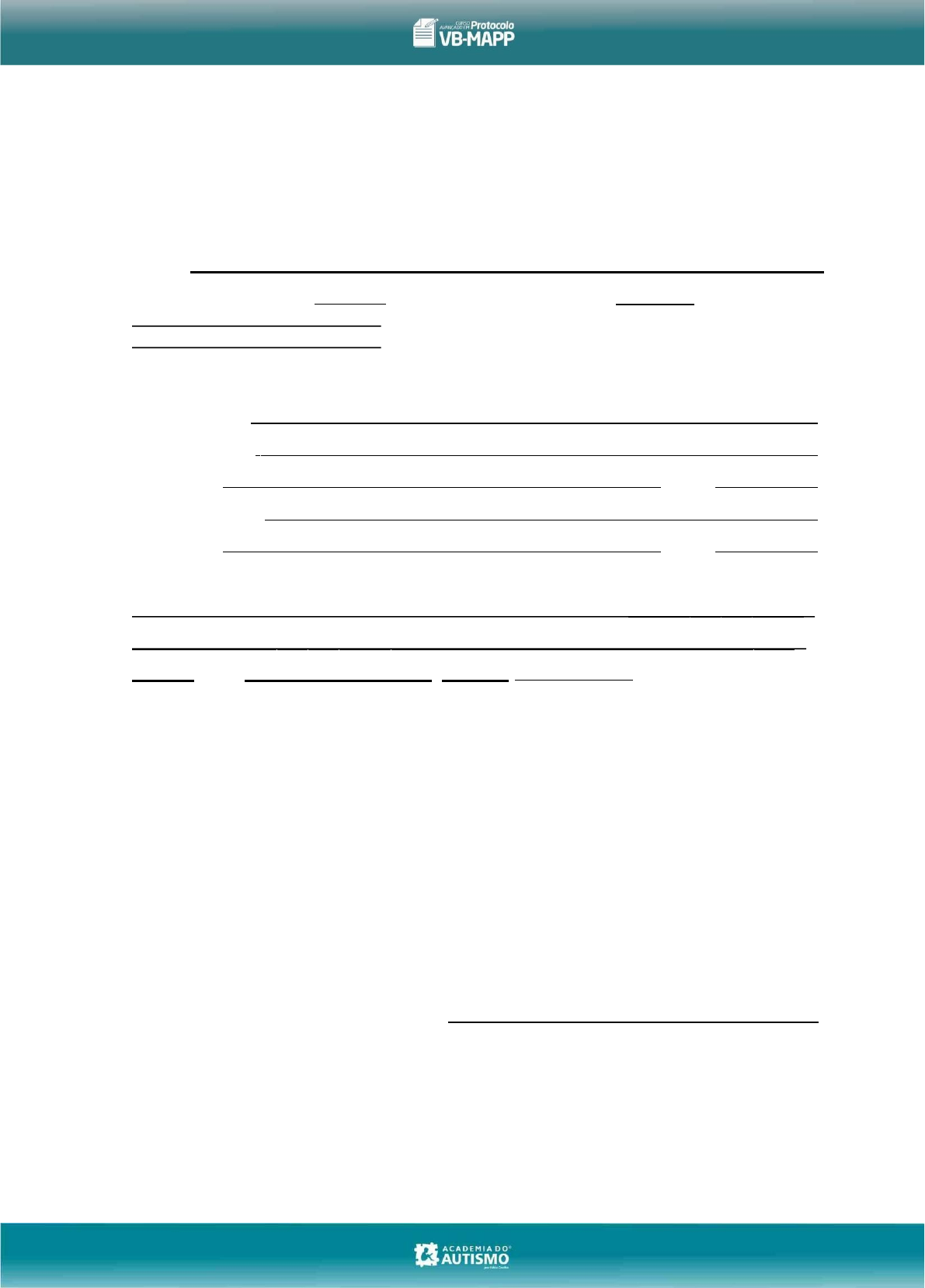 ROTEIRO PARA ENTREVISTA COM OS PAIS OU RESPONSÁVEIS – VB MAPP Este é apenas um modelo. Construa seu roteiro de entrevista, da forma que melhor atender sua necessidade. Identificação: Nome: Data de nascimento: Idade: Naturalidade: Nome do pai: Profissão: Idade: Nome da mãe: Profissão: Idade: Endereço residencial: _ _ Fone: _ Composição do núcleo Familiar (Nome, idade, grau de parentesco, idade e profissão de cada membro): Motivo da solicitação da avaliação: Com quem reside, atualmente: Relacionamento dos pais entre si: Relacionamento dos pais com os filhos: Relacionamento entre os filhos: Relacionamento geral entre os familiares: Informações sobre Diagnóstico (Se houver) Informações sobre intervenções terapêuticas já aplicadas (Se houver). Quais são, quantas horas semanais? Principais queixas atuais: Uso de medicamento: Repertório de Contato Visual (está presente? Qual a frequência?) Sociabilidade: (faz amigos com facilidade, diverte-se – como, quando e com quem, atividade de lazer, comportamento nos ambientes em geral...) frequenta outros ambientes além da escola? Quais? Informações sobre saúde clínica: Visão: Usa lentes corretivas ( ) Sim ( ) Não Audição: Usa recurso auditivo / Prótese auditiva ( ) Sim ( ) Não Limitações físicas? Desenvolvimento geral: (Informações relevantes desde o nascimento até o momento). _ _ _ _ _ _ _ _ _ _ _ Habilidades de Comunicação: ( ) Vocal ( ) Não Vocal ( ) uso de sistema de comunicação alternativa? Outras informações: Faz Balbucios? Em quais situações? (escrever “Não aplicável”, caso a pessoa seja falante fluente) _ _ _ _ Costuma imitar sons? (Ecóico). Em quais situações? Habilidades de Mando: (Fazer pedidos). Pede pelo que deseja? Como costuma fazer pedidos? Reconhece pessoas ou objetos e sabe nomeá-los? Quais e em quais situações? (Tato) _ _ _ _ Responde perguntas ou completa trechos de músicas em uma brincadeira? (Intraverbal) _ _ _ _ _ Autonomia e Auto cuidado. (Descrever como é o momento, se realiza com ajuda, sem ajuda) Uso do Banheiro: ( _ _ _ _ ) Escovar os dentes: _ _ _ _ _ _ Refeições: (uso de utensílios para refeições diárias). _ _ _ _ _ _ Vestir-se: _ _ _ _ _ _ Apresenta estereotipias? Quais e em quais circunstâncias? _ _ _ _ _ _ Rotina de Sono (a que horas dorme e acorda; dificuldades para dormir; qualidade do sono): _ _ _ Comportamentos auto ou hetero-lesivos: (Se estão presentes, qual a forma, em que circunstâncias acontecem, quantas vezes por dia/semana, com qual intensidade). _ _ _ _ _ _ _ Preferências. Brinquedos que gosta: _ _ _ _ _ _ Brincadeiras que gosta: _ _ _ _ _ Personagens, desenhos e filmes preferidos: _ _ _ _ _ Do que não gosta? (atividade, brinquedo, personagens, etc) _ _ _ Outras informações relevantes: _ _ _ _ _ _ _ _ _ _ _ _ , . (Local e Data): Entrevistador: Entrevistado: OBSERVAÇÕES