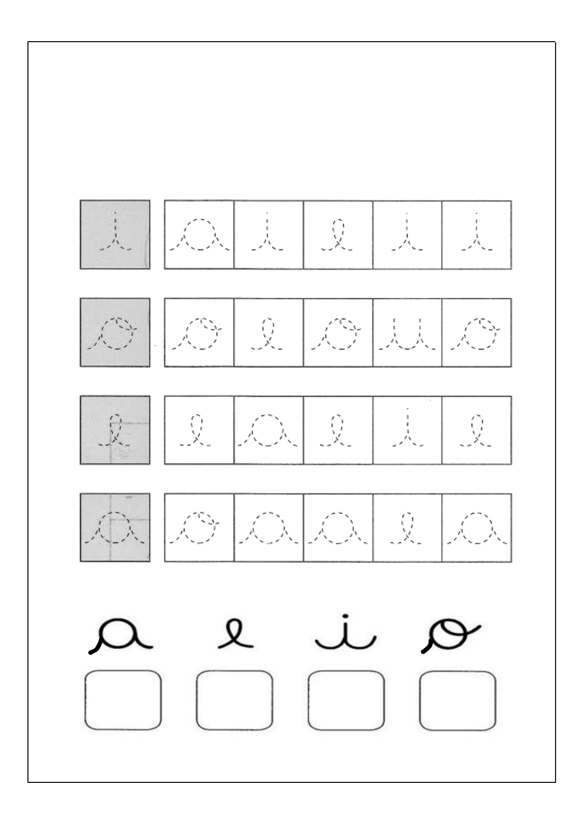 Centro Educacional Boa Esperança Professora: Jaíne Rodrigues / Nível 1 Aluno(a): ___________________________ Verificação de Linguagem 1. Complete o tracejado e cubra as letras iguais as letras do modelo: 2. Agora, vamos treinar as vogais que aprendemos durante as aulas: 3. Circule a letra inicial do nome de cada desenho e copie-a no quadrinho ao lado: 4. Agora, recordaremos como escrevemos as 3 formas da vogal “i” maiúscula: _______________ _____________ ______________ _____________ _____________ ______________ 5. Vamos copiar a vogal “o” em suas 3 formas maiúsculas: ___________ ____________ ___________ _____________ __________ _____________ 6. Circule a letrinha inicial do nome de cada criança e copie-as nos quadrinhos: 7. Observe a imagem, e complete a primeira letra da palavra: 8. Pratique seu nome: