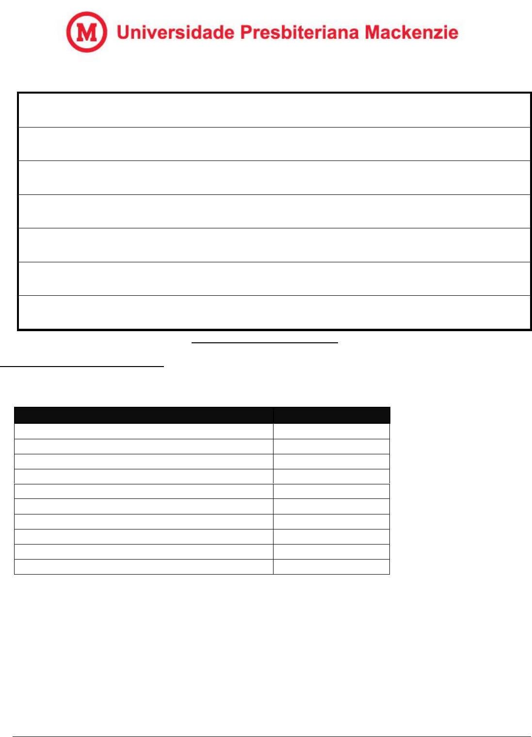 ATENÇÃO: Toda atividade deverá ser feita com fonte Arial, tamanho 11, espaço de 1,5 entre as linhas e alinhamento justificado entre as margens. MODELO PARA A ENTREGA DAS ATIVIDADES (veja instruções no rodapé) CURSO: Marketing POLO DE APOIO PRESENCIAL: Sorocaba/SP SEMESTRE: 2º Semestre/2022 COMPONENTE CURRICULAR / TEMA: Matemática e Estatística NOME COMPLETO DO ALUNO: Luana Giovanna Pinto Fernandes TIA: 21505659 NOME DO PROFESSOR: Carlos Henrique de Jesus Costa. MAT EST – Aula 7 – Sintetize Responda as questões a seguir: 1 - Na coluna tipo de variável, preencha com CATEGÓRICA (ou Qualitativa) ou QUANTITATIVA (2,0 pontos): Variável Tipo de Variável Renda Familiar Quantitativa Estado Civil Categórica Altura Quantitativa Idade Quantitativa CPF Categórica RG Categórica Número do Título de Eleitor Categórica Tempo que leva para chegar ao trabalho Quantitativa Temperatura Quantitativa Nível de Satisfação (Satisfeito, insatisfeito, etc.) Categórica ATENÇÃO: Toda atividade deverá ser feita com fonte Arial, tamanho 11, espaço de 1,5 entre as linhas e alinhamento justificado entre as margens. 2 - Para as variáveis Quantitativas abaixo, classifique-as em DISCRETAS ou CONTÍNUAS (2,0 pontos): Variável Discreta ou Contínua Renda familiar Contínua Número de pessoa em um shopping Discreta Altura Contínua Idade Discreta Número de erros em uma página de texto Discreta Comprimento de um prego Contínua Quantidade de água em uma garrafa (ml) Contínua Número de crianças brincando em um parque Discreta Tempo que leva para chegar ao trabalho Contínua Temperatura Contínua 3-Para as variáveis Categóricas (ou Qualitativas) abaixo, classifique-as em ORDINAIS ou NOMINAIS (2,0 pontos): Variável Oridinal ou Nominal Classificação de pesquisas ou níveis de satisfação Ordinal Estado Civil Nominal CPF Ordinal Notas (Conceitos) Nominal Posição de Chegada em corridas de motos Ordinal CEP (Código de Endereçamento Postal) Ordinal Nacionalidade Nominal Classificação de filmes (comédia, suspense, terror, etc.) Nominal Tipos de alimento (feijão, arroz, carde, etc.) Nominal