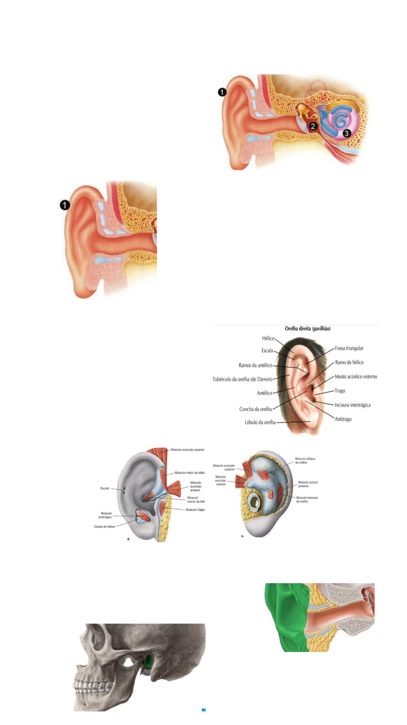 Anatomia da Orelha Informações Gerais • Dupla Função • Manter o equilíbrio do corpo (vestibular); • Perceber o som (auditivo) A orelha é divida em três partes: 1-Orelha Externa 2-Orelha Média 3- Orelha Interna 1- ORELHA EXTERNA: •Pavilhão Auricular • Meato Acústico Externo Função: Captar o som e direciona-lo para Membrana Timpânica Pavilhão Auricular (Aurícula) • Parte da orelha que não está contida no interior da orelha • Consiste em cartilagem elástica recoberta por pele, suportada por ligamentos, bem como pele e músculos extrincicos e intríncicos. Músculos inervados pelo nervo facial. • Sua principal função é conduzir as ondas sonoras para o meato acústico externo. Canal que se estende do pavilhão auricular até a membrana timpânica, com 2 ou 3cm de extensão; Localiza-se na parte timpânica do osso temporal Meato Acústico Externo • Seu terço lateral (externo) é formado por cartilagem e possui glandulas ceruminosas, que produzem a cera, e dois terços mediais (interno) são construidos por osso A membrana timpânica forma o limite entre a orelha externa e a orelha média e separa, hermeticamente, uma câmara da outra (deste modo, com o tímpano intacto, a orelha média é ventilada unicamente através da tuba auditiva). A membrana timpânica tem tonalidade acinzentada e aspecto perolado brilhante, tem formato elíptico e diâmetro de cerca de 9 mm, com superfície de 85 mm2. As estruturas que se situam na orelha média, posteriormente à membrana timpânica, podem ser vistas devido à sua transparência. Existem duas superfícies: • A parte flácida, muito menor, mais delgada, localizada na porção cranial (membrana de Shrapnell, com cerca de 25 mm2) e que não vibra durante as exposições ao som. • A parte tensa, maior e mais espessa (cerca de 0,1 mm), que atua na transferência dos sons para a cabeça do martelo Orelha Média • Transmite as vibrações sonoras da membrana timpânicapara a orelha interna por intermédio dos ossículos da audição: martelo, bigorna e estribo • Composta pela cavidade timpânica que se conecta anteriormente com a parte nasal da faringe por intermédio da tuba auditiva e posteriormente com as células mastóideas • A cavidade timpânica contém os ossículos da audição (martelo, bigorna e estribo), os músculos (tensor do tímpano e estapédio), os nervos (corda do tímpano, timpânico [ramo do n. glossofaríngeo] e petroso menor) e o plexo timpânico (fibras parassimpáticas do nervo glossofaríngeo e simpáticas provenientes do gânglio cervical superior por intermédio do plexo carótico) Membrana Timpânica Ossículos da audição • COMPOSTA PELOS OSSÍCULOS: • Martelo • Bigorna • Estribo • A tuba auditiva é um tubo orgânico fechado que une a rinofaringe à orelha média. É constituída de uma parte óssea, mais curta, com 12 milímetros de comprimento, correspondendo ao semicanal da tuba auditiva; e uma cartilagínea, com 24 milímetros de comprimento, cuja base é inserida sob a mucosa da parede lateral da rinofaringe. • A junção das porções óssea e cartilagínea forma o istmo da tuba auditiva que, semelhante a uma válvula, controla a entrada de ar1. A tuba auditiva encontra-se fechada no repouso e, pela ação dos músculos tensor do véu palatino e levantador do véu palatino os quais são acionados na deglutição e/ou no bocejo, há passagem de ar da parte nasal da faringe para a orelha média2,3. Isso permite a equalização da pressão do ar externo com a pressão da cavidade timpânica e, ainda, o arejamentoda orelha média. Esse mecanismo protege a orelha de mudanças rápidas de pressão, mantém a mucosa conservada e permite que a unidade tímpano-ossicular possa vibrar sem intercorrências. • A tuba auditiva também possui a função de drenagem, protegendo a orelha média do acúmulo de secreções. O músculo tensor do véu palatino é responsável por expulsar a secreção da orelha média para a porção nasal da faringe2,4. Além disso, as células secretoras e ciliadas presentes tanto na orelha média quanto na tuba auditiva fazem parte de um sistema de transporte mucociliar • As porções vestibular e auditiva, que estão preenchidas com fluido, compõem a orelha interna: • A porção auditiva (cóclea) é estimulada pelo movimento do fluido • A porção vestibular (utrículo, sáculo e canais semicirculares) é estimulada pelo movimento do fluido dentro destas câmaras • Consiste em um labirinto membranáceo situado dentro de um labirinto ósseo • Os receptores para as funções auditiva e vestibular estão localizados dentro do labirinto membranáceo • Os fluidos localizados no labirinto membranáceo (endolinfa) e no labirinto ósseo (perilinfa) estimulam os receptores auditivos e vestibulares • O nervo vestibulococlear entra na orelha interna pelo meato acústico interno Labirinto Ósseo e Membranoso • é o órgão do equilíbrio que detecta a posição do corpo no espaço em situação estática e durante os movimentos. Ele se localiza na orelha interna, nos canais semicirculares. O sáculo e o utrículo se localizam no interior do labirinto membranáceo, que reveste internamente o labirinto ósseo. O labirinto membranáceo é preenchido por endolinfa. Localizados no interior dessas três regiões distintas do órgão vestibular encontram-se os receptores especializados (células ciliares neuroepiteliais) que detectam o movimento da endolinfa. Este movimento é traduzido em impulsos nervosos que são retransmitidos para o encéfalo, por meio do ramo vestibular do nervo vestibulococlear, onde são processados. Os canais semicirculares são especializados em detectar movimentos lineares, angulares e rotacionais, enquanto o sáculo e o utrículo detectam movimentos lineares da cabeça Sistema Vestibular • A Cóclea é um labirinto óssseo similar á concha de um caracol: • Ela é localizada na região da orelha interna • É