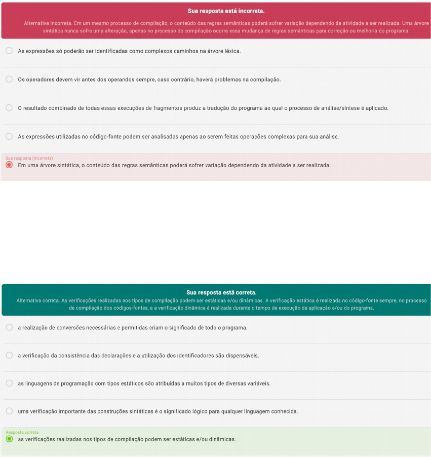 Leia o excerto a seguir. “Por sua vez, um esquema de tradução é uma notação para anexar fragmentos de programa às produções de uma gramática. Os fragmentos do programa são executados quando a produção é usada durante a análise sintática.” BARBOSA, C. da S. et al. Compiladores. Porto Alegre: Sagah, 2021. p. 166. (Disponível na Minha Biblioteca). Sobre a tradução de expressões, leia e selecione a alternativa correta dentre as abaixo. Leia o trecho a seguir. “Durante a compilação é igualmente verificada a compatibilidade entre os tipos dos operandos e os operadores associados, bem como o número e o tipo dos argumentos nas chamadas às funções ou aos métodos.” LANGLOIS, P. R. S. Compiladores: da teoria à prática. Rio de Janeiro: LTC, 2018. p. 126. Sobre a verificação de tipo, é correto afirmar que: “A análise semântica pode ser dividida em duas categorias. A primeira é a análise de um programa requerido pelas regras da linguagem de programação, para verificar sua correção e garantir sua execução. O quanto precisa ocorrer dessa análise requerida pela definição da linguagem varia tremendamente de linguagem para linguagem.” LOUDEN, K. C. Compiladores: princípios e práticas. São Paulo: Cengage Learning, 2004. p. 259. Sobre a análise semântica, é correto afirmar que: Leia o excerto a seguir. “O princípio da tradução direcionada por sintaxe estabelece que o significado, ou semântica, da cadeia 3+4 deveria estar diretamente relacionado a sua estrutura sintática representada na árvore de análise sintática. Nesse caso, o princípio da tradução direcionada por sintaxe indica que a árvore de análise sintática determina que o valor de 3 e o valor de 4 devem ser somados.” LOUDEN, K. C. Compiladores: princípios e práticas. São Paulo: Cengage Learning, 2004. p. 123. Após ler o texto acima, podemos definir como correta qual opção? Leia o excerto a seguir. “Na prática, muitas verificações semânticas devem ser efetuadas sobre elementos presentes em vários pontos do programa, possivelmente distantes. Uma referência a um tipo, a um método ou a uma variável pode estar distante da sua definição e, eventualmente, aparecer em um arquivo diferente. Para resolver este problema é usado um repositório central em que fica armazenada toda a informação relativa aos símbolos (identificadores de variáveis, tipos, funções, métodos, classes etc.): a tabela dos símbolos.” LANGLOIS, P. R. S. Compiladores: da teoria à prática. Rio de Janeiro: LTC, 2018. p. 126. Sobre definição de semântica, assinale a alternativa correta. Leia o excerto a seguir. ”A escolha das instruções que serão utilizadas na criação do código-objeto pode ser feita por meio de uma tabela de equivalências, com base em padrões e em quais são as substituições adequadas para o código-fonte em questão”. BARBOSA, C. da S. et al. Compiladores. Porto Alegre: Sagah, 2021. p. 180. (Disponível na Minha Biblioteca). Sobre a geração de código, podemos afirmar que: Leia o trecho a seguir: “No caso da linguagem simples, identificamos expressões expr e instruções stmt. A linguagem é muito simples, por isso não existem declarações, funções ou tipos de dados compostos, como estruturas ou classes de objetos, por exemplo.” LANGLOIS, P. R. S. Compiladores: da teoria à prática. Rio de Janeiro: LTC, 2018. p. 149. Sobre o caso de linguagem simples, é correto afirmar que: Leia o trecho a seguir. ”Em uma implementação, as atividades de várias fases podem ser agrupadas em uma passagem que lê um arquivo de entrada e grava um arquivo de saída. Podemos citar como exemplo as fases front-end de análise lexical, análise de sintaxe, análise semântica e geração de código intermediário que podem ser incorporadas em uma única passagem.” BARBOSA, C. da S. et al. Compiladores. Porto Alegre: Sagah, 2021. p. 25. (Disponível na Minha Biblioteca). Após ler o pequeno fragmento de texto acima sobre implementação de um compilador, é correto afirmar que: Leia o trecho a seguir. “Ao traduzir um programa-fonte para um código-objeto, um compilador produz representações intermediárias do código, que podem assumir mais de uma forma, mas que devem ser facilmente produzidas e facilmente traduzidas para a linguagem-alvo ou código-objeto”. BARBOSA, C. da S. et al. Compiladores. Porto Alegre: Sagah, 2021. p. 145. (Disponível na Minha Biblioteca). Sobre o programa-fonte e um código-objeto, podemos assinalar como verdadeiro que: Leia o trecho a seguir. “A maioria das linguagens necessita de uma ou mais bibliotecas para apoiar a execução dos programas. Mesmo no caso de linguagens com apoio à execução, como a linguagem C, a biblioteca denominada libc.a inclui algumas das rotinas normalmente utilizadas no desenvolvimento dos programas printf, atoi ou strlen.” LANGLOIS, P. R. S. Compiladores: da teoria à prática. Rio de Janeiro: LTC, 2018. p. 7. É correto afirmar sobre ambientes de execução que: