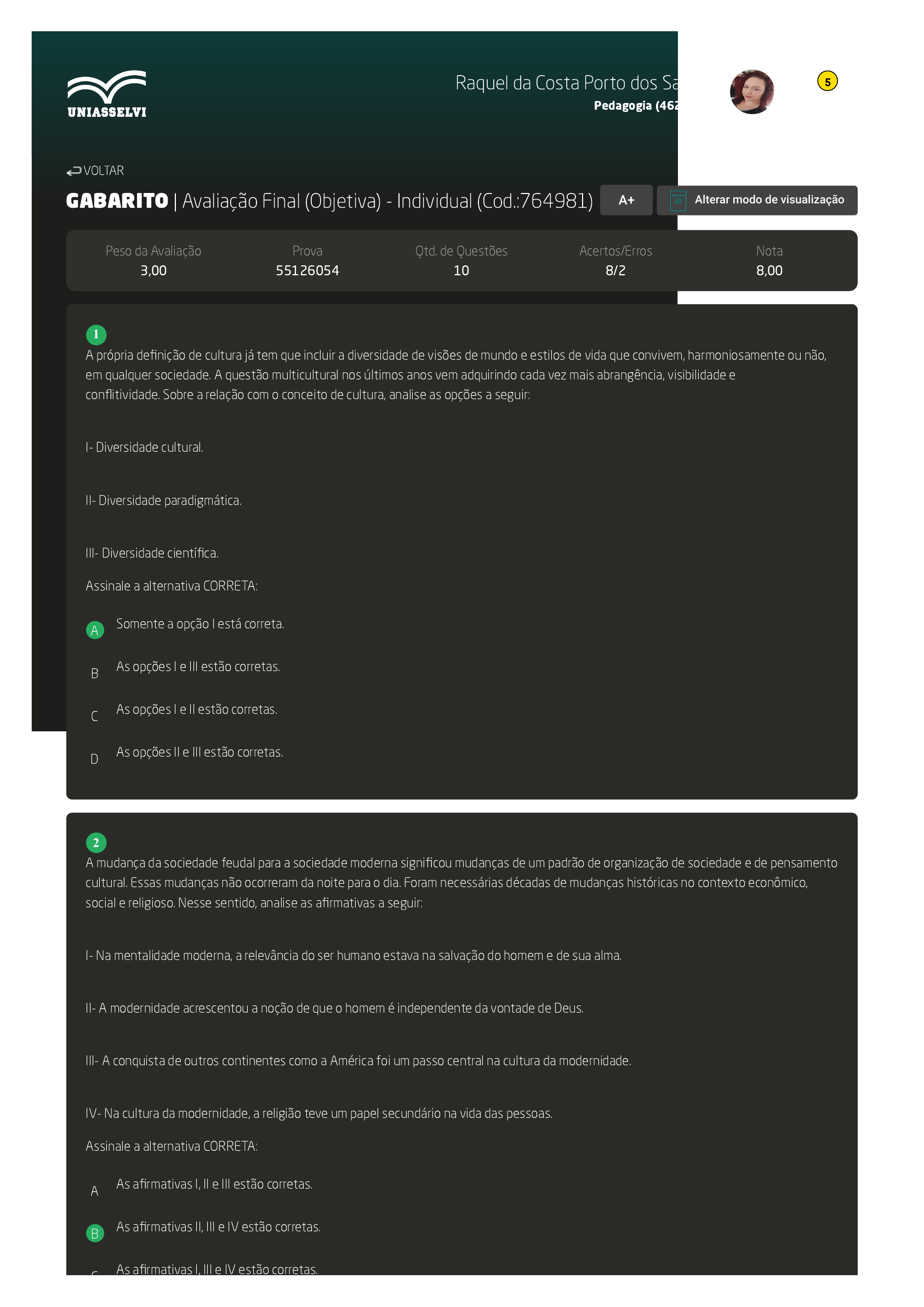 30/09/2022 10:32 AVA https://ava2.uniasselvi.com.br/subject/grades-and-tests/answer-book/eyJ0ZXN0Ijp7InRlc3RDb2RlIjoiNzY0OTgxIiwiZGVzY3JpcHRpb24iOiJBdmFsaWHDp8OjbyBGaW5hbCAoT2JqZXRpdmEpIC0gSW5kaXZpZHVhb… 1/5 GABARITO | Avaliação Final (Objetiva) - Individual (Cod.:764981) Peso da Avaliação 3,00 Prova 55126054 Qtd. de Questões 10 Acertos/Erros 8/2 Nota 8,00 A própria definição de cultura já tem que incluir a diversidade de visões de mundo e estilos de vida que convivem, harmoniosamente ou não, em qualquer sociedade. A questão multicultural nos últimos anos vem adquirindo cada vez mais abrangência, visibilidade e conflitividade. Sobre a relação com o conceito de cultura, analise as opções a seguir: I- Diversidade cultural. II- Diversidade paradigmática. III- Diversidade científica. Assinale a alternativa CORRETA: A Somente a opção I está correta. B As opções I e III estão corretas. C As opções I e II estão corretas. D As opções II e III estão corretas. A mudança da sociedade feudal para a sociedade moderna significou mudanças de um padrão de organização de sociedade e de pensamento cultural. Essas mudanças não ocorreram da noite para o dia. Foram necessárias décadas de mudanças históricas no contexto econômico, social e religioso. Nesse sentido, analise as afirmativas a seguir: I- Na mentalidade moderna, a relevância do ser humano estava na salvação do homem e de sua alma. II- A modernidade acrescentou a noção de que o homem é independente da vontade de Deus. III- A conquista de outros continentes como a América foi um passo central na cultura da modernidade. IV- Na cultura da modernidade, a religião teve um papel secundário na vida das pessoas. Assinale a alternativa CORRETA: A As afirmativas I, II e III estão corretas. B As afirmativas II, III e IV estão corretas. C As afirmativas I, III e IV estão corretas. VOLTAR A+ Alterar modo de visualização 1 2 Raquel da Costa Porto dos Santos Pedagogia (4621163) 5 30/09/2022 10:32 AVA https://ava2.uniasselvi.com.br/subject/grades-and-tests/answer-book/eyJ0ZXN0Ijp7InRlc3RDb2RlIjoiNzY0OTgxIiwiZGVzY3JpcHRpb24iOiJBdmFsaWHDp8OjbyBGaW5hbCAoT2JqZXRpdmEpIC0gSW5kaXZpZHVhb… 2/5 C , D As afirmativas I, II e IV estão corretas. Vem crescendo a consciência da positividade do caráter multicultural de cada país em contexto global. Daí decorre a importância da educação intercultural para a afirmação de sociedades democráticas e igualitárias. Todavia, a perspectiva de interculturalidade apresenta uma grande complexidade, não pode ser trivializada. Referente à interculturalidade e seu processo de aceitação e implementação na educação e sociedades democráticas, classifique V para as sentenças verdadeiras e F para as falsas: ( ) É composta de processos dinâmicos, visando a uma relação dialógica entre diversas culturas e grupos distintos. ( ) Processo que se realiza, essencialmente, por meio de apresentações de danças, músicas e outros aspectos das diversas culturas, como fenômeno exótico. ( ) Uma das formas de educação compensatória das diferenças culturais entre os alunos, que visa à integração do sujeito à sociedade nacional envolvente. ( ) Educação Intercultural é pautada na promoção da igualdade de oportunidades e a integração dos diferentes sujeitos socioculturais na sociedade em que vivemos. Assinale a alternativa que apresenta a sequência CORRETA: A V - F - V - F. B V - F - F - V. C F - V - V - F. D V - V - F - F. A Sociologia surge no início do que ficou conhecido historicamente como Modernidade. Ela passa a dar uma compreensão sobre a sociedade, sendo esse estudo feito em linhas mais gerais ou de modo mais específico de uma certa realidade, diferente do que se havia proposto até então. Sobre como a Sociologia ficou conhecida em seu surgimento, assinale a alternativa CORRETA: A Ciência Nova. B Ciência C Ciência Teocêntrica. D Pseudociência mágica. Nos dias atuais, as pessoas organizam suas vidas com extrema ênfase no consumo e na publicidade. Alguns indivíduos buscam mais o “ter” que o “ser”, priorizando produtos e serviços do consumo. As crianças acabam sendo as maiores vítimas da publicidade intensa das novas necessidades humanas. Nesse contexto, assinale a alternativa CORRETA: 3 4 Religiosa. 5 Raquel da Costa Porto dos Santos Pedagogia (4621163) 5 30/09/2022 10:32 AVA https://ava2.uniasselvi.com.br/subject/grades-and-tests/answer-book/eyJ0ZXN0Ijp7InRlc3RDb2RlIjoiNzY0OTgxIiwiZGVzY3JpcHRpb24iOiJBdmFsaWHDp8OjbyBGaW5hbCAoT2JqZXRpdmEpIC0gSW5kaXZpZHVhb… 3/5 A O mercado de produtos ainda tem pouca influência nas inovações do campo educacional, como em mochilas, livros infantis e jogos. B O mercado de serviços e produtos cria constantemente novidades e necessidades de consumo através da publicidade. C Nos últimos tempos ocorreu uma drástica redução da publicidade voltada ao público religioso. D A criação de novas necessidades de consumo tem colaborado à concentração de estudo dos alunos em sala de aula. A ciência social e a sociologia são enquadradas como uma ciência qualitativa e quantitativa, longe de serem consideradas como um conhecimento especulativo. Seu objeto de estudo é a vida social, política de uma época e coletividade. Estas áreas do conhecimento que surgiram no século XIX, com rigor de ciência, também fazem parte de um resultado de projetos de colonização e desenvolvimento no campo institucional. No contexto dos aspectos históricos das ciências sociais, classifique V para as sentenças verdadeiras e F para as falsas: ( ) O surgimento das novas tecnologias de informação, como os computadores, possibilitou o surgimento das ciências sociais. ( ) O processo colonizador de países mais distantes dos continentes foi um propulsor para o surgimento da magia. ( ) Diversos escritores clássicos das ciências sociais aproveitaram as questões da industrialização como fonte de suas pesquisas. ( )