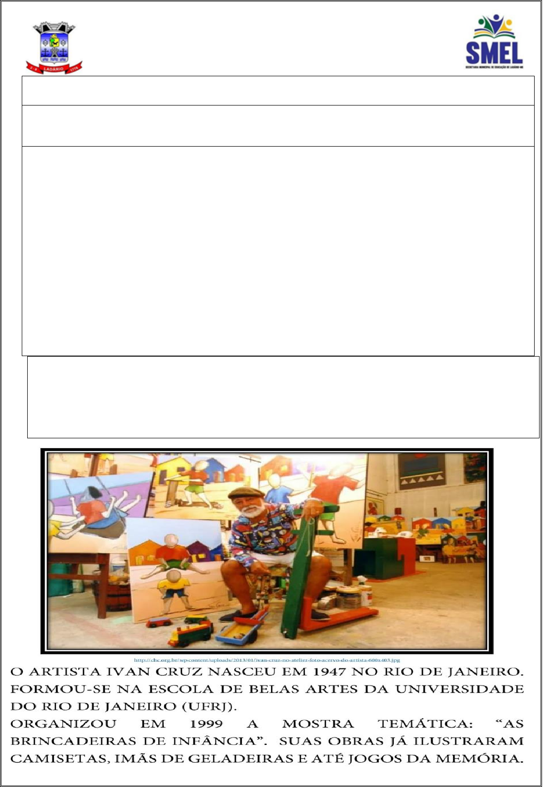 ESTADO DE MATO GROSSO DO SUL MUNICÍPIO DE LADÁRIO SECRETARIA MUNICIPAL DE EDUCAÇÃO ATENÇÃO: ATENÇÃO: AS ATIVIDADES DEVEM SER REALIZADAS NO CADERNO DE ARTE COM A AJUDA DE UM RESPONSÁVEL. QUEM ESTIVER SEM O CADERNO UTILIZE UMA FOLHA DE SULFITE. . ESCOLA MUNICIPAL EDUARDO MALHADO PROFESSORA: REJANE HELENA CAPURRO DE PAULA TURMA: 2 ANO -A ENSINO INFANTIL TURNO: MATUTINO ALUNO (A): COMPONENTE CURRICULAR: ARTE. PERÍODO: 16/07/20 á 31/07/20 Quantidade de aulas: 06 aulas Objeto de conhecimento: ✓ Contextos e práticas; ✓ Elementos da linguagem; ✓ Cores e formas; ✓ Processos de criação; Habilidade:EI03TS02 Expressar-se livremente por meio de desenho, pintura, colagem, dobradura e escultura, criando produções bidimensionais e tridimensionais. MS.EF15AR04: Experimentar diferentes formas de expressão artística (desenho, pintura, colagem, quadrinhos, dobradura, escultura, modelagem, instalação, vídeo, fotografia etc.), fazendo uso sustentável de materiais, instrumentos, recursos e técnicas convencionais e não convencionais; Tema: BRINQUEDOS E BRINCADEIRAS—IVAN CRUZ BRINQUEDOS E BRINCADEIRAS-IVAN CRUZ PARA O AUTOR A BELEZA DE SER CRIANÇA ESTÁ NAS BRINCADEIRAS E NO VALOR QUE ELA TÊM PARA A VIDA,PARA O SEU DESENVOLVIMENTO E FORMAÇÃO DA IDENTIDADE. EM SUA FRASE: ‘’(...) ao adulto que quando criança nunca brincou,falta-lhe um pedaço no coração’’. PORTANTO, É UM SUJEITO QUE NÃO TEVE INFÂNCIA,QUE NÃO VIVEU PLENAMENTE,FALTA-LHE SENSIBILIDADE,EM ESPECIAL,PARA ENTENDER O UNIVERSO INFANTIL.SÓ QUEM BRINCOU REALMENTE,TEVE INFÂNCIA,CARREGA CONSIGO PULSANDO DENTRO DE SI,AS LEMBRANÇAS DA CRIANÇA AINDA VIVA NO PEITO. 1- CHEGOU A HORA DE BRINCAR! ESCOLHA UMA DESSAS BRINCADEIRAS PARA VOCÊ BRINCAR COM A FAMILIA EM CASA. DEPOIS REGISTRE EM SEU CADERNO QUEM BRINCOU COM VOCÊ. VAMOS COMEÇAR!! 2- VAMOS ASSISTIR O VÍDEO BRINQUEDOS E BRINCADEIRAS OBRAS DE IVAN CRUZ : CLIQUE NO LINK PARA ASSISTIR COM A FAMÍLIA https://www.youtube.com/watch?v=dhhc6xx0nSc&t=17s 3- AGORA QUE VOCÊ ASSISTIU O VÍDEO VAMOS COLORIR UMA DAS OBRAS DO AUTOR IVAN CRUZ ‘’JOGANDO PETECA’’ https://www.youtube.com/watch?v=dhhc6xx0nSc&t=17s 4 -QUE TAL FAZERMOS UMA PETECA DE JORNAL? MATERIAL: ➢ JORNAL ,BARBANTE E TESOURA ➢ MONTE O MODELO CONFORME AS INSTRUÇÕES; ➢ COPIE O MATERIAL QUE VOCÊ USOU E DESENHE O BRINQUEDO NO SEU CADERNO; ➢ AGORA VAMOS BRINCAR? 5- AGORA QUE VOCÊ CONHECEU AS OBRAS DE IVAN CRUZ . VAMOS FAZER UMA RELEITURA COM FOTOS CHAME A FAMILIA PARA REGISTRAR ESSE MOMENTO E NÃO SE ESQUEÇA DE ENVIAR AS FOTOS! REFLEXÂO: SAUDADES!! PROSSORA REJANE
